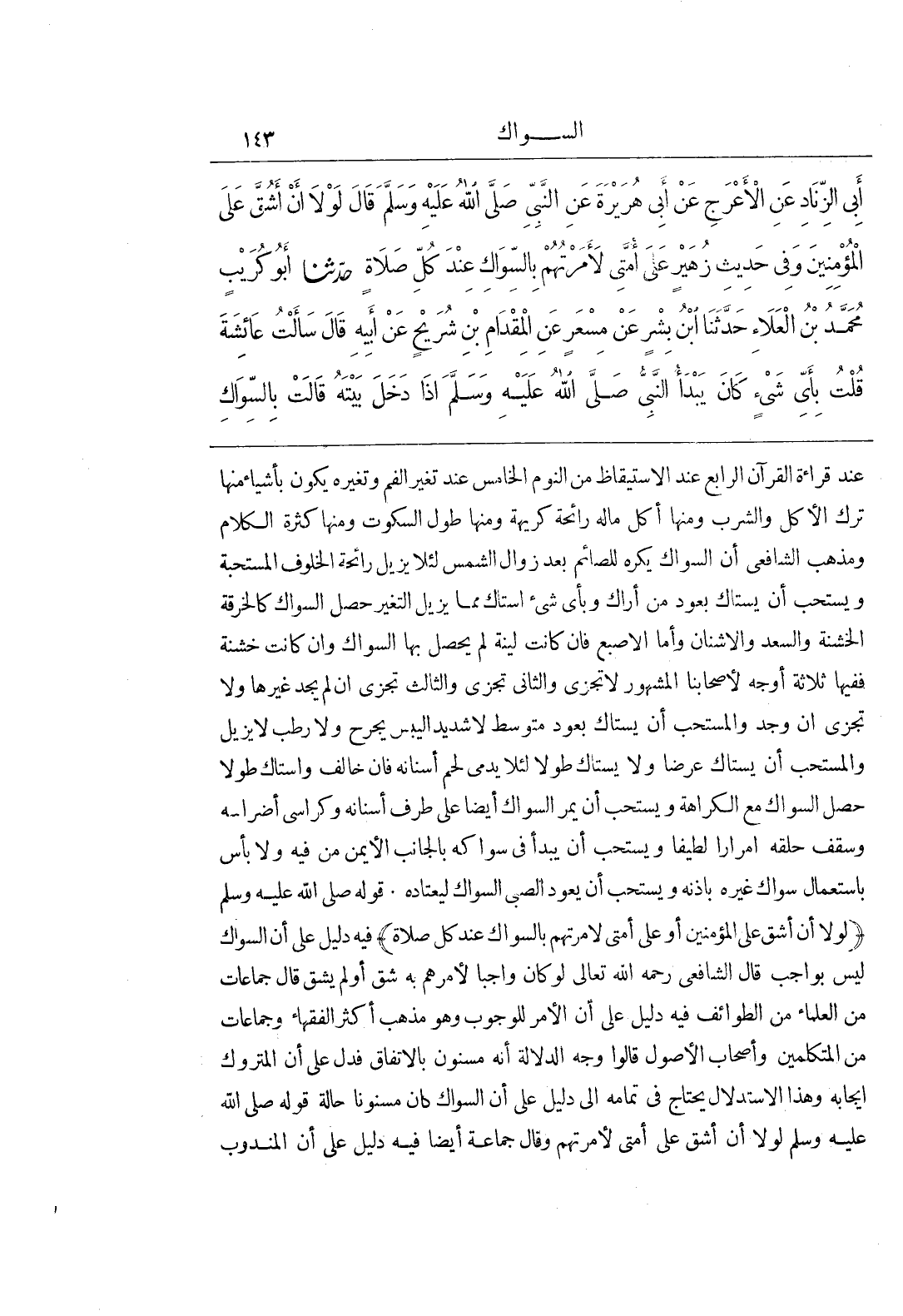 عِنْدَ قِرَاءَةِ الْقُرْآنِ الرَّابِعُ عِنْدَ الِاسْتِيقَاظِ مِنَ النَّوْمِ الْخَامِسُ عِنْدَ تَغَيُّرِ الْفَمِ وَتَغَيُّرُهُ يَكُونُ بِأَشْيَاءَ مِنْهَا تَرْكُ الْأَكْلِ وَالشُّرْبِ وَمِنْهَا أَكْلُ مَا لَهُ رَائِحَةٌ كَرِيهَةٌ وَمِنْهَا طُولُ السُّكُوتِ وَمِنْهَا كَثْرَةُ الْكَلَامِ وَمَذْهَبُ الشَّافِعِيِّ أَنَّ السِّوَاكَ يُكْرَهُ لِلصَّائِمِ بَعْدَ زَوَالِ الشَّمْسِ لِئَلَّا يُزِيلُ رَائِحَةَ الْخُلُوفِ الْمُسْتَحَبَّةِ وَيُسْتَحَبُّ أَنْ يَسْتَاكَ بِعُودٍ من أراك وبأى شئ اسْتَاكَ مِمَّا يُزِيلُ التَّغَيُّرَ حَصَلَ السِّوَاكُ كَالْخِرْقَةِ الْخَشِنَةِ وَالسَّعْدِ وَالْأُشْنَانِ وَأَمَّا الْإِصْبَعُ فَإِنْ كَانَتْ لَيِّنَةً لَمْ يَحْصُلْ بِهَا السِّوَاكُ وَإِنْ كَانَتْ خَشِنَةً فَفِيهَا ثَلَاثَةُ أَوْجُهٍ لِأَصْحَابِنَا الْمَشْهُورُ لَا تُجْزِي وَالثَّانِي تُجْزِي وَالثَّالِثُ تُجْزِي إِنْ لَمْ يَجِدْ غَيْرَهَا وَلَا تُجْزِي إِنْ وَجَدَ وَالْمُسْتَحَبُّ أَنْ يَسْتَاكَ بِعُودٍ مُتَوَسِّطٍ لَا شَدِيدِ الْيُبْسِ يَجْرَحُ وَلَا رَطْبٍ لَا يُزِيلُ وَالْمُسْتَحَبُّ أَنْ يَسْتَاكَ عَرْضًا وَلَا يَسْتَاكَ طُولًا لِئَلَّا يُدْمِي لَحْمَ أَسْنَانِهِ فَإِنْ خَالَفَ وَاسْتَاكَ طُولًا حَصَلَ السِّوَاكُ مَعَ الْكَرَاهَةِ وَيُسْتَحَبُّ أَنْ يُمِرَّ السِّوَاكَ أَيْضًا عَلَى طَرَفِ أَسْنَانِهِ وَكَرَاسِيِّ أَضْرَاسِهِ وَسَقْفِ حَلْقِهِ إِمْرَارًا لَطِيفًا وَيُسْتَحَبُّ أَنْ يَبْدَأَ فِي سِوَاكِهِ بِالْجَانِبِ الْأَيْمَنِ مِنْ فِيهِ وَلَا بَأْسَ بِاسْتِعْمَالِ سِوَاكِ غَيْرِهِ بِإِذْنِهِ وَيُسْتَحَبُّ أَنْ يُعَوَّدَ الصبي السواك ليعتاده قَوْلُهُ صَلَّى اللَّهُ عَلَيْهِ وَسَلَّمَ (لَوْلَا أَنَّ أَشُقَّ عَلَى الْمُؤْمِنِينَ أَوْ عَلَى أُمَّتِي لَأَمَرْتُهُمْ بِالسِّوَاكِ عِنْدَ كُلِّ صَلَاةٍ) فِيهِ دَلِيلٌ عَلَى أَنَّ السِّوَاكَ لَيْسَ بِوَاجِبٍ قَالَ الشَّافِعِيُّ رَحِمَهُ اللَّهُ تَعَالَى لَوْ كَانَ وَاجِبًا لَأَمَرَهُمْ بِهِ شَقَّ أَوَ لَمْ يَشُقَّ قَالَ جَمَاعَاتٌ مِنَ الْعُلَمَاءِ مِنَ الطَّوَائِفِ فِيهِ دَلِيلٌ عَلَى أَنَّ الْأَمْرَ لِلْوُجُوبِ وَهُوَ مَذْهَبُ أَكْثَرِ الْفُقَهَاءِ وَجَمَاعَاتٍ مِنَ الْمُتَكَلِّمِينَ وَأَصْحَابِ الْأُصُولِ قَالُوا وَجْهُ الدَّلَالَةِ أَنَّهُ مَسْنُونٌ بِالِاتِّفَاقِ فَدَلَّ عَلَى أَنَّ الْمَتْرُوكَ إِيجَابُهُ وَهَذَا الِاسْتِدْلَالُ يَحْتَاجُ فِي تَمَامِهِ إِلَى دَلِيلٍ عَلَى أَنَّ السِّوَاكَ كَانَ مَسْنُونًا حَالَةَ قَوْلُهُ صَلَّى اللَّهُ عَلَيْهِ وَسَلَّمَ لَوْلَا أَنَّ أَشُقَّ عَلَى أُمَّتِي لَأَمَرْتُهُمْ وَقَالَ جَمَاعَةٌ أَيْضًا فِيهِ دَلِيلٌ عَلَى أَنَّ الْمَنْدُوبَ