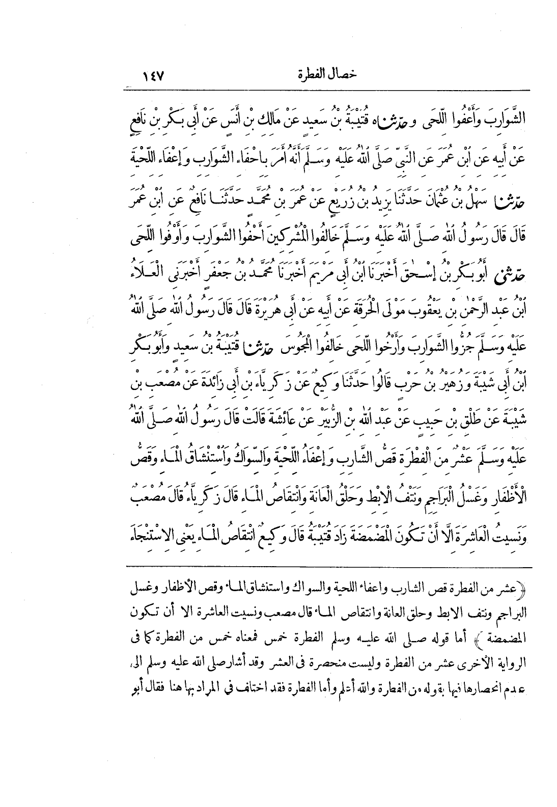 (عَشْرٌ مِنَ الْفِطْرَةِ قَصُّ الشَّارِبِ وَإِعْفَاءُ اللِّحْيَةِ وَالسِّوَاكُ وَاسْتِنْشَاقُ الْمَاءِ وَقَصُّ الْأَظْفَارِ وَغَسْلُ الْبَرَاجِمِ وَنَتْفُ الْإِبْطِ وَحَلْقُ الْعَانَةِ وَانْتِقَاصُ الْمَاءِ قَالَ مُصْعَبٌ وَنَسِيتُ الْعَاشِرَةَ إِلَّا أَنْ تَكُونَ الْمَضْمَضَةَ) أَمَّا قَوْلُهُ صَلَّى اللَّهُ عَلَيْهِ وَسَلَّمَ الْفِطْرَةُ خَمْسٌ فَمَعْنَاهُ خَمْسٌ مِنَ الْفِطْرَةِ كَمَا فِي الرِّوَايَةِ الْأُخْرَى عَشْرٌ مِنَ الْفِطْرَةِ وَلَيْسَتْ مُنْحَصِرَةً فِي الْعَشْرِ وَقَدْ أَشَارَ صَلَّى اللَّهُ عَلَيْهِ وَسَلَّمَ إِلَى عَدَمِ انْحِصَارِهَا فِيهَا بِقَوْلِهِ مِنَ الْفِطْرَةِ وَاللَّهُ أَعْلَمُ وَأَمَّا الْفِطْرَةُ فَقَدِ اخْتُلِفَ فِي الْمُرَادِ بِهَا هُنَا فَقَالَ أَبُو