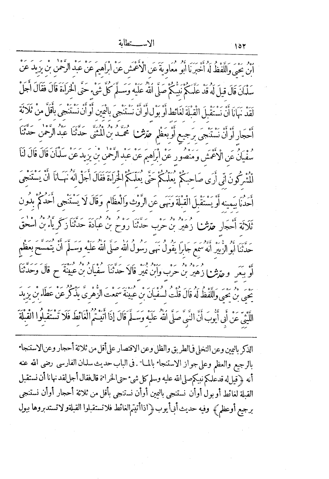 الذَّكَرِ بِالْيَمِينِ وَعَنِ التَّخَلِّي فِي الطَّرِيقِ وَالظِّلِّ وَعَنْ الِاقْتِصَارِ عَلَى أَقَلَّ مِنْ ثَلَاثَةِ أَحْجَارٍ وَعَنْ الِاسْتِنْجَاءِ بِالرَّجِيعِ وَالْعَظْمِ وَعَلَى جَوَازِ الِاسْتِنْجَاءِ بِالْمَاءِ فِي الْبَابِ حَدِيثُ سَلْمَانَ الْفَارِسِيِّ رَضِيَ اللَّهُ عَنْهُ أَنَّهُ (قِيلَ لَهُ قَدْ عَلَّمَكُمْ نبيكم صلى الله عليه وسلم كل شئ حَتَّى الْخِرَاءَةَ قَالَ فَقَالَ أَجَلْ لَقَدْ نَهَانَا أَنْ نَسْتَقْبِلَ الْقِبْلَةَ لِغَائِطٍ أَوْ بَوْلٍ أَوْ أَنْ نَسْتَنْجِيَ بِالْيَمِينِ أَوْ أَنْ نَسْتَنْجِيَ بِأَقَلَّ مِنْ ثَلَاثَةِ أَحْجَارٍ أَوْ أَنْ نَسْتَنْجِيَ بِرَجِيعٍ أَوْ عَظْمٍ) وَفِيهِ حَدِيثُ أَبِي أَيُّوبَ (إِذَا أتيتم الغائط فلا تَسْتَقْبِلُوا الْقِبْلَةَ وَلَا تَسْتَدْبِرُوهَا بِبَوْلٍ