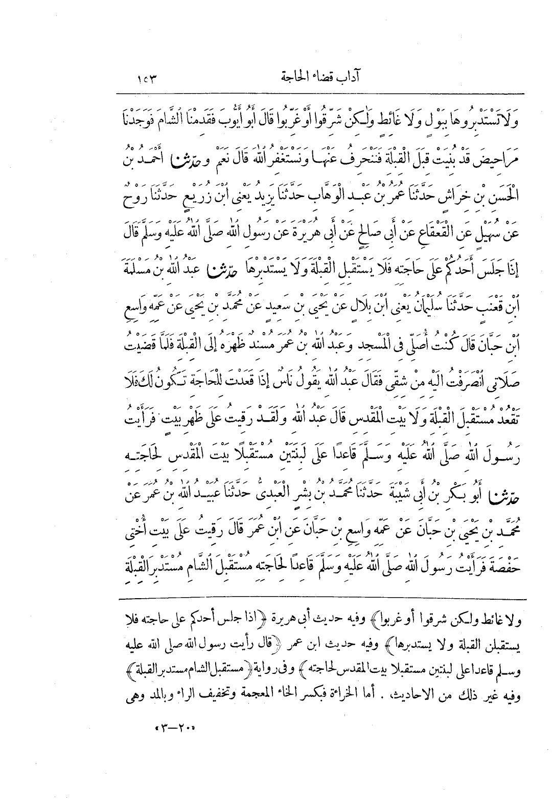 وَلَا غَائِطٍ وَلَكِنْ شَرِّقُوا أَوْ غَرِّبُوا) وَفِيهِ حَدِيثُ أَبِي هُرَيْرَةَ (إِذَا جَلَسَ أَحَدُكُمْ عَلَى حَاجَتِهِ فَلَا يَسْتَقْبِلَنَّ الْقِبْلَةَ وَلَا يَسْتَدْبِرْهَا) وَفِيهِ حديث بن عُمَرَ (قَالَ رَأَيْتُ رَسُولَ اللَّهِ صَلَّى اللَّهُ عَلَيْهِ وَسَلَّمَ قَاعِدًا عَلَى لَبِنْتَيْنِ مُسْتَقْبِلًا بَيْتَ الْمَقْدِسِ لِحَاجَتِهِ) وَفِي رِوَايَةٍ (مُسْتَقْبِلَ الشَّامِ مُسْتَدْبِرَ القبلة) وفيه غير ذلك من الاحاديث أَمَّا الْخِرَاءَةَ فَبِكَسْرِ الْخَاءِ الْمُعْجَمَةِ وَتَخْفِيفِ الرَّاءِ وبالمد وهي