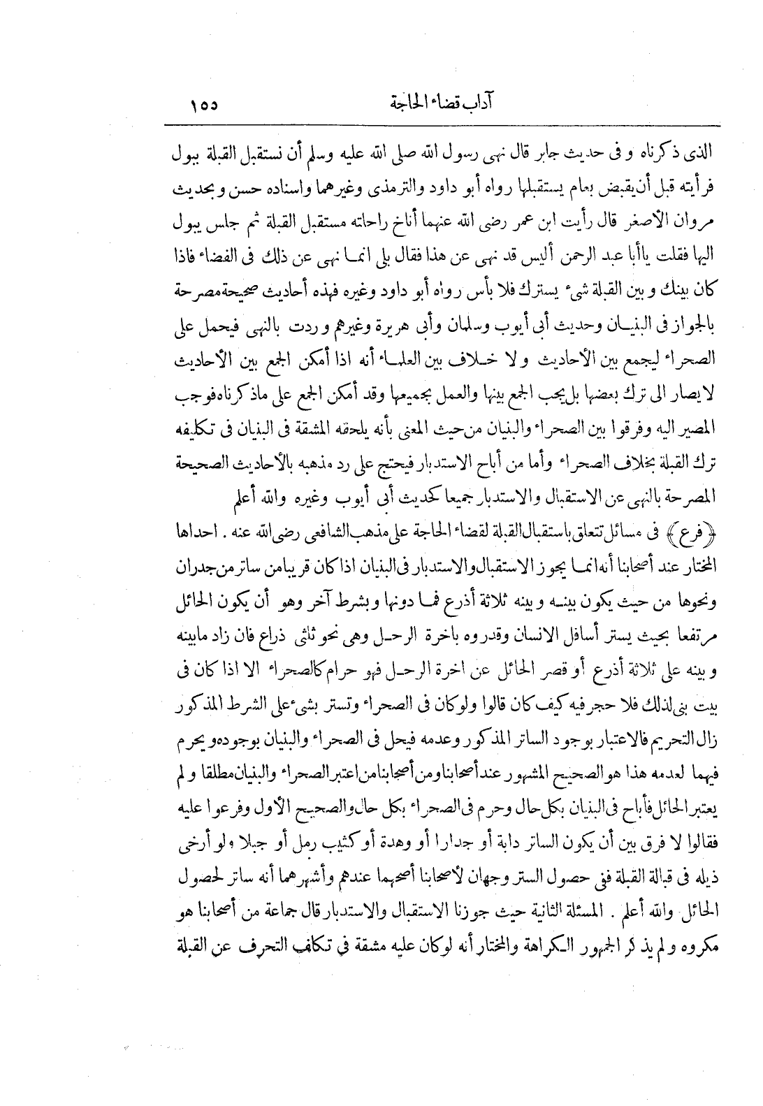 الَّذِي ذَكَرْنَاهُ وَفِي حَدِيثِ جَابِرٍ قَالَ نَهَى رَسُولُ اللَّهِ صَلَّى اللَّهُ عَلَيْهِ وَسَلَّمَ أن نَسْتَقْبِلَ الْقِبْلَةَ بِبَوْلٍ فَرَأَيْتُهُ قَبْلَ أَنْ يُقْبَضَ بِعَامٍ يَسْتَقْبِلُهَا رَوَاهُ أَبُو دَاوُدَ وَالتِّرْمِذِيُّ وَغَيْرُهُمَا وَإِسْنَادُهُ حَسَنٌ وَبِحَدِيثِ مَرْوَانَ الْأَصْغَرِ قَالَ رَأَيْتُ بن عُمَرَ رَضِيَ اللَّهُ عَنْهُمَا أَنَاخَ رَاحِلَتَهُ مُسْتَقْبِلَ الْقِبْلَةِ ثُمَّ جَلَسَ يَبُولُ إِلَيْهَا فَقُلْتُ يَا أَبَا عَبْدِ الرَّحْمَنِ أَلَيْسَ قَدْ نُهِيَ عَنْ هَذَا فَقَالَ بَلَى إِنَّمَا نُهِيَ عَنْ ذَلِكَ فِي الْفَضَاءِ فَإِذَا كَانَ بَيْنَكَ وَبَيْنَ الْقِبْلَةِ شئ يَسْتُرُكَ فَلَا بَأْسَ رَوَاهُ أَبُو دَاوُدَ وَغَيْرُهُ فَهَذِهِ أَحَادِيثُ صَحِيحَةٌ مُصَرِّحَةٌ بِالْجَوَازِ فِي الْبُنْيَانِ وَحَدِيثُ أَبِي أَيُّوبَ وَسَلْمَانَ وَأَبِي هُرَيْرَةَ وَغَيْرِهِمْ وَرَدَتْ بِالنَّهْيِ فَيُحْمَلُ عَلَى الصَّحْرَاءِ لِيُجْمَعَ بَيْنَ الْأَحَادِيثِ وَلَا خِلَافَ بَيْنَ الْعُلَمَاءِ أَنَّهُ إِذَا أَمْكَنَ الْجَمْعُ بَيْنَ الْأَحَادِيثِ لَا يُصَارُ إِلَى تَرْكِ بَعْضِهَا بَلْ يَجِبُ الْجَمْعُ بَيْنَهَا وَالْعَمَلُ بِجَمِيعِهَا وَقَدْ أَمْكَنَ الْجَمْعُ عَلَى مَا ذَكَرْنَاهُ فَوَجَبَ الْمَصِيرُ إِلَيْهِ وَفَرَّقُوا بَيْنَ الصَّحْرَاءِ وَالْبُنْيَانِ مِنْ حَيْثُ الْمَعْنَى بِأَنَّهُ يَلْحَقُهُ الْمَشَقَّةُ فِي الْبُنْيَانِ فِي تَكْلِيفِهِ تَرْكَ الْقِبْلَةِ بِخِلَافِ الصَّحْرَاءِ وَأَمَّا مَنْ أَبَاحَ الِاسْتِدْبَارَ فَيُحْتَجُّ عَلَى رَدِّ مَذْهَبِهِ بِالْأَحَادِيثِ الصَّحِيحَةِ الْمُصَرِّحَةِ بِالنَّهْيِ عَنْ الِاسْتِقْبَالِ وَالِاسْتِدْبَارِ جَمِيعًا كَحَدِيثِ أَبِي أَيُّوبَ وَغَيْرِهِ وَاللَّهُ أَعْلَمُ (فَرْعٌ) فِي مَسَائِلَ تَتَعَلَّقُ بِاسْتِقْبَالِ الْقِبْلَةِ لِقَضَاءِ الْحَاجَةِ عَلَى مَذْهَبِ الشَّافِعِيِّ رَضِيَ اللَّهُ عَنْهُ إِحْدَاهَا الْمُخْتَارُ عِنْدَ أَصْحَابِنَا أَنَّهُ إِنَّمَا يَجُوزُ الِاسْتِقْبَالُ وَالِاسْتِدْبَارُ فِي الْبُنْيَانِ إِذَا كَانَ قَرِيبًا مِنْ سَاتِرٍ مِنْ جُدْرَانٍ وَنَحْوِهَا مِنْ حَيْثُ يَكُونُ بَيْنَهُ وَبَيْنَهُ ثَلَاثَةُ أَذْرُعٍ فَمَا دُونَهَا وَبِشَرْطٍ آخَرَ وَهُوَ أَنْ يَكُونَ الْحَائِلُ مُرْتَفِعًا بِحَيْثُ يَسْتُرُ أَسَافِلَ الْإِنْسَانِ وَقَدَّرُوهُ بِآخِرَةِ الرَّحْلِ وَهِيَ نَحْوُ ثُلُثَيْ ذِرَاعٍ فَإِنْ زَادَ مَا بَيْنَهُ وَبَيْنَهُ عَلَى ثَلَاثَةِ أَذْرُعٍ أَوْ قَصُرَ الْحَائِلُ عَنْ آخِرَةِ الرَّحْلِ فَهُوَ حَرَامٌ كَالصَّحْرَاءِ إِلَّا إِذَا كَانَ فِي بَيْتٍ بُنِيَ لِذَلِكَ فَلَا حَجْرَ فِيهِ كَيْفَ كَانَ قَالُوا ولو كان في الصحراء وتستر بشئ عَلَى الشَّرْطِ الْمَذْكُورِ زَالَ التَّحْرِيمُ فَالِاعْتِبَارُ بِوُجُودِ السَّاتِرِ الْمَذْكُورِ وَعَدَمِهِ فَيَحِلُّ فِي الصَّحْرَاءِ وَالْبُنَيَّانِ بِوُجُودِهِ وَيَحْرُمُ فِيهِمَا لِعَدَمِهِ هَذَا هُوَ الصَّحِيحُ الْمَشْهُورُ عِنْدَ أَصْحَابِنَا وَمِنْ أَصْحَابِنَا مَنِ اعْتَبَرَ الصَّحْرَاءَ وَالْبُنْيَانَ مُطْلَقًا وَلَمْ يَعْتَبِرِ الْحَائِلَ فَأَبَاحَ فِي الْبُنْيَانِ بِكُلِّ حَالٍ وَحَرَّمَ فِي الصَّحْرَاءِ بِكُلِّ حَالٍ وَالصَّحِيحُ الْأَوَّلُ وَفَرَّعُوا عَلَيْهِ فَقَالُوا لَا فَرْقَ بَيْنَ أَنْ يَكُونَ السَّاتِرُ دَابَّةً أو جدار أَوْ وَهْدَةً أَوْ كَثِيبَ رَمْلٍ أَوْ جَبَلًا ولو أَرْخَى ذَيْلَهُ فِي قُبَالَةِ الْقِبْلَةِ فَفِي حُصُولِ السِّتْرِ وَجْهَانِ لِأَصْحَابِنَا أَصَحُّهُمَا عِنْدَهُمْ وَأَشْهَرُهُمَا أَنَّهُ سَاتِرٌ لِحُصُولِ الْحَائِلِ وَاللَّهُ أَعْلَمُ الْمَسْأَلَةُ الثَّانِيَةُ ح