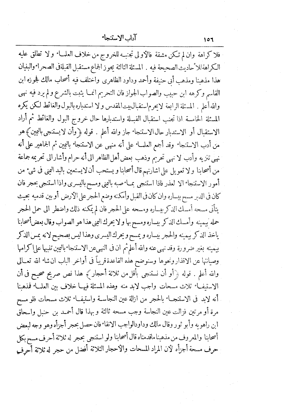 فَلَا كَرَاهَةَ وَإِنْ لَمْ تَكُنْ مَشَقَّةٌ فَالْأَوْلَى تَجَنُّبُهُ لِلْخُرُوجِ مِنْ خِلَافِ الْعُلَمَاءِ وَلَا تُطْلَقُ عَلَيْهِ الْكَرَاهَةُ لِلْأَحَادِيثِ الصَّحِيحَةِ فِيهِ الْمَسْأَلَةُ الثَّالِثَةُ يَجُوزُ الْجِمَاعُ مُسْتَقْبِلَ الْقِبْلَةِ فِي الصَّحْرَاءِ وَالْبُنْيَانِ هَذَا مَذْهَبُنَا وَمَذْهَبُ أَبِي حَنِيفَةَ وَأَحْمَدَ وَدَاوُدَ الظاهرى واختلف فيه أصحاب مالك فجوزه بن القاسم وكرهه بن حَبِيبٍ وَالصَّوَابُ الْجَوَازُ فَإِنَّ التَّحْرِيمَ إِنَّمَا يَثْبُتُ بِالشَّرْعِ وَلَمْ يَرِدْ فِيهِ نَهْيٌ وَاللَّهُ أَعْلَمُ الْمَسْأَلَةُ الرَّابِعَةُ لَا يَحْرُمُ اسْتِقْبَالُ بَيْتِ الْمَقْدِسِ وَلَا اسْتِدْبَارُهُ بِالْبَوْلِ وَالْغَائِطِ لَكِنْ يُكْرَهُ الْمَسْأَلَةُ الْخَامِسَةُ إِذَا تَجَنَّبَ اسْتِقْبَالَ الْقِبْلَةِ وَاسْتِدْبَارَهَا حَالَ خُرُوجِ الْبَوْلِ وَالْغَائِطِ ثُمَّ أَرَادَ الِاسْتِقْبَالَ أَوْ الِاسْتِدْبَارَ حَالَ الِاسْتِنْجَاءِ جَازَ وَاللَّهُ أَعْلَمُ قَوْلُهُ (وأن لايستنجى بِالْيَمِينِ) هُوَ مِنْ أَدَبِ الِاسْتِنْجَاءِ وَقَدْ أَجْمَعَ الْعُلَمَاءُ عَلَى أَنَّهُ مَنْهِيٌّ عَنْ الِاسْتِنْجَاءِ بِالْيَمِينِ ثُمَّ الْجَمَاهِيرُ عَلَى أَنَّهُ نَهْيُ تَنْزِيهٍ وَأَدَبٍ لَا نَهْيَ تَحْرِيمٍ وَذَهَبَ بَعْضُ أَهْلِ الظَّاهِرِ إِلَى أَنَّهُ حَرَامٌ وَأَشَارَ إِلَى تَحْرِيمِهِ جَمَاعَةٌ مِنْ أَصْحَابِنَا وَلَا تَعْوِيلَ عَلَى إِشَارَتِهِمْ قَالَ أَصْحَابُنَا وَيُسْتَحَبُّ أَنْ لَا يَسْتَعِينَ بِالْيَدِ الْيُمْنَى فى شئ مِنْ أُمُورِ الِاسْتِنْجَاءِ إِلَّا لِعُذْرٍ فَإِذَا اسْتَنْجَى بِمَاءٍ صَبَّهُ بِالْيُمْنَى وَمَسَحَ بِالْيُسْرَى وَإِذَا اسْتَنْجَى بِحَجَرٍ فَإِنْ كَانَ فِي الدُّبُرِ مَسَحَ بِيَسَارِهِ وَإِنْ كَانَ فِي الْقُبُلِ وَأَمْكَنَهُ وَضْعَ الْحَجَرِ عَلَى الْأَرْضِ أَوْ بَيْنَ قَدَمَيْهِ بِحَيْثُ يَتَأَتَّى مَسْحَهُ أَمْسَكَ الذَّكَرَ بِيَسَارِهِ وَمَسَحَهُ عَلَى الْحَجَرِ فَإِنْ لَمْ يُمْكِنهُ ذَلِكَ وَاضْطُرَّ إِلَى حَمْلِ الْحَجَرِ حَمَلَهُ بِيَمِينِهِ وَأَمْسَكَ الذَّكَرَ بِيَسَارِهِ وَمَسَحَ بِهَا وَلَا يُحَرِّكِ الْيُمْنَى هَذَا هُوَ الصَّوَابُ وَقَالَ بَعْضُ أَصْحَابِنَا يَأْخُذُ الذَّكَرَ بِيَمِينِهِ وَالْحَجَرَ بيساره ويمسح بها وَيُحَرِّكُ الْيُسْرَى وَهَذَا لَيْسَ بِصَحِيحٍ لِأَنَّهُ يَمَسُّ الذَّكَرَ بِيَمِينِهِ بِغَيْرِ ضَرُورَةٍ وَقَدْ نُهِيَ عَنْهُ وَاللَّهُ أَعْلَمُ ثُمَّ إِنَّ فِي النَّهْيِ عَنْ الِاسْتِنْجَاءِ بِالْيَمِينِ تَنْبِيهًا عَلَى إِكْرَامِهَا وَصِيَانَتِهَا عَنِ الْأَقْذَارِ وَنَحْوِهَا وَسَنُوَضِّحُ هَذِهِ الْقَاعِدَةَ قَرِيبًا فِي أَوَاخِرِ الْبَابِ إِنْ شَاءَ اللَّهُ تَعَالَى وَاللَّهُ أَعْلَمُ قَوْلُهُ (أَوْ أَنْ نَسْتَنْجِيَ بِأَقَلَّ مِنْ ثَلَاثَةِ أَحْجَارٍ) هَذَا نَصٌّ صَرِيحٌ صَحِيحٌ فِي أن الاستيفاء ثلاث مسحات واجب لابد مِنْهُ وَهَذِهِ الْمَسْأَلَةُ فِيهَا خِلَافٌ بَيْنَ الْعُلَمَاءِ فمذهبنا أنه لابد فِي الِاسْتِنْجَاءِ بِالْحَجَرِ مِنْ إِزَالَةِ عَيْنِ النَّجَاسَةِ وَاسْتِيفَاءِ ثَلَاثِ مَسَحَاتٍ فَلَوْ مَسَحَ مَرَّةً أَوْ مَرَّتَيْنِ فَزَالَتْ عَيْنُ النَّجَاسَةِ وَجَبَ مَسْحُهُ ثَالِثَةً وبهذا قَالَ أَحْمَدُ بْنُ حَنْبَلٍ وَإِسْحَاقُ بْنُ رَاهَوَيْهِ وَأَبُو ثَوْرٍ وَقَالَ مَالِكٌ وَدَاوُدُ الْوَاجِبُ الْإِنْقَاءُ فَإِنْ حَصَلَ بِحَجَرٍ أَجْزَأَهُ وَهُوَ وَجْهٌ لِبَعْضِ أَصْحَابِنَا وَالْمَعْرُوفُ مِنْ مَذْهَبِنَا مَا قَدَّمْنَاهُ قَالَ أَصْحَابُنَا وَلَوِ اسْتَنْجَى بِحَجَرٍ لَهُ ثَلَاثَةُ أَحْرُفٍ مَسَحَ بِكُلِّ حَرْفٍ مَسْحَةً أَجْزَأَهُ لِأَنَّ الْمُرَادَ 