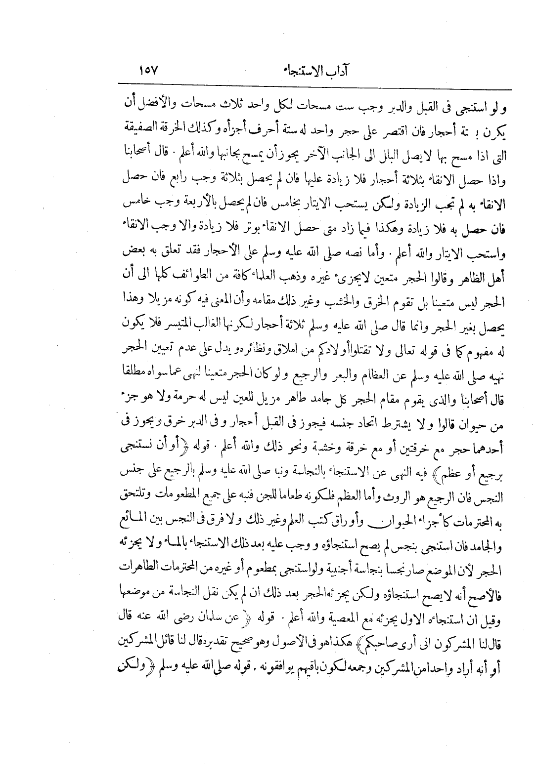 وَلَوِ اسْتَنْجَى فِي الْقُبُلِ وَالدُّبُرِ وَجَبَ سِتُّ مَسَحَاتٍ لِكُلِّ وَاحِدٍ ثَلَاثُ مَسَحَاتٍ وَالْأَفْضَلُ أَنْ يَكُونَ بِسِتَّةِ أَحْجَارٍ فَإِنِ اقْتَصَرَ عَلَى حَجَرٍ وَاحِدٍ لَهُ سِتَّةُ أَحْرُفٍ أَجْزَأَهُ وَكَذَلِكَ الْخِرْقَةُ الصَّفِيقَةُ الَّتِي إِذَا مَسَحَ بِهَا لَا يَصِلُ الْبَلَلُ إِلَى الْجَانِبِ الْآخَرِ يَجُوزُ أَنْ يَمْسَحَ بِجَانِبِهَا وَاللَّهُ أَعْلَمُ قَالَ أَصْحَابُنَا وَإِذَا حَصَلَ الْإِنْقَاءُ بِثَلَاثَةِ أَحْجَارٍ فَلَا زِيَادَةَ عَلَيْهَا فَإِنْ لَمْ يَحْصُلْ بِثَلَاثَةٍ وَجَبَ رَابِعٌ فَإِنْ حَصَلَ الْإِنْقَاءُ بِهِ لَمْ تَجِبِ الزِّيَادَةُ وَلَكِنْ يُسْتَحَبُّ الْإِيتَارُ بِخَامِسٍ فَإِنْ لَمْ يَحْصُلْ بِالْأَرْبَعَةِ وَجَبَ خَامِسٌ فَإِنْ حَصَلَ بِهِ فَلَا زِيَادَةَ وَهَكَذَا فِيمَا زَادَ مَتَى حَصَلَ الْإِنْقَاءُ بِوِتْرٍ فَلَا زِيَادَةَ وَإِلَّا وَجَبَ الْإِنْقَاءُ وَاسْتُحِبَّ الْإِيتَارُ وَاللَّهُ أَعْلَمُ وَأَمَّا نَصُّهُ صَلَّى اللَّهُ عَلَيْهِ وَسَلَّمَ عَلَى الْأَحْجَارِ فَقَدْ تَعَلَّقَ بِهِ بَعْضُ أَهْلِ الظَّاهِرِ وَقَالُوا الْحَجَرُ مُتَعَيِّنٌ لَا يُجْزِئُ غَيْرُهُ وَذَهَبَ الْعُلَمَاءُ كَافَّةً مِنَ الطَّوَائِفِ كُلِّهَا إِلَى أَنَّ الْحَجَرَ لَيْسَ مُتَعَيِّنًا بَلْ تَقُومُ الْخِرَقُ وَالْخَشَبُ وَغَيْرُ ذَلِكَ مَقَامَهُ وَأَنَّ الْمَعْنِيُّ فِيهِ كَوْنُهُ مُزِيلًا وَهَذَا يَحْصُلُ بِغَيْرِ الْحَجَرِ وَإِنَّمَا قَالَ صَلَّى اللَّهُ عَلَيْهِ وَسَلَّمَ ثَلَاثَةَ أَحْجَارٍ لِكَوْنِهَا الْغَالِبَ الْمُتَيَسَّرَ فَلَا يَكُونُ لَهُ مَفْهُومٌ كَمَا فِي قَوْلِهِ تَعَالَى وَلَا تَقْتُلُوا أَوْلَادَكُمْ من املاق وَنَظَائِرِهِ وَيَدُلُّ عَلَى عَدَمِ تَعْيِينِ الْحَجَرِ نَهْيُهُ صَلَّى اللَّهُ عَلَيْهِ وَسَلَّمَ عَنِ الْعِظَامِ وَالْبَعْرِ والرجيع ولو كان الحجر متعينا لنهى عما سِوَاهُ مُطْلَقًا قَالَ أَصْحَابُنَا وَالَّذِي يَقُومُ مَقَامَ الْحَجَرِ كُلُّ جَامِدٍ طَاهِرٍ مُزِيلٍ لِلْعَيْنِ لَيْسَ لَهُ حُرْمَةٌ وَلَا هُوَ جُزْءٌ مِنْ حَيَوَانٍ قَالُوا وَلَا يُشْتَرَطُ اتِّحَادُ جِنْسِهِ فَيَجُوزُ فِي الْقُبُلِ أَحْجَارٌ وَفِي الدُّبُرِ خِرَقٌ وَيَجُوزُ فِي أَحَدِهِمَا حَجَرٌ مَعَ خِرْقَتَيْنِ أَوْ مَعَ خِرْقَةٍ وَخَشَبَةٍ وَنَحْوُ ذَلِكَ وَاللَّهُ أَعْلَمُ قَوْلُهُ (أَوْ أَنْ نَسْتَنْجِيَ بِرَجِيعٍ أَوْ عَظْمٍ) فِيهِ النَّهْيُ عَنْ الِاسْتِنْجَاءِ بِالنَّجَاسَةِ وَنَبَّهَ صَلَّى اللَّهُ عَلَيْهِ وَسَلَّمَ بِالرَّجِيعِ عَلَى جِنْسِ النَّجَسِ فَإِنَّ الرَّجِيعَ هُوَ الرَّوْثُ وَأَمَّا الْعَظْمُ فَلِكَوْنِهِ طَعَامًا لِلْجِنِّ فَنَبَّهَ عَلَى جَمِيعِ الْمَطْعُومَاتِ وَتَلْتَحِقُ بِهِ الْمُحْتَرَمَاتُ كَأَجْزَاءِ الْحَيَوَانِ وَأَوْرَاقِ كُتُبِ الْعِلْمِ وَغَيْرِ ذَلِكَ وَلَا فَرْقَ فِي النَّجَسِ بَيْنَ الْمَائِعِ وَالْجَامِدِ فَإِنِ اسْتَنْجَى بِنَجَسٍ لَمْ يَصِحَّ اسْتِنْجَاؤُهُ وَوَجَبَ عَلَيْهِ بَعْدَ ذَلِكَ الِاسْتِنْجَاءُ بِالْمَاءِ وَلَا يُجْزِئُهُ الْحَجَرُ لِأَنَّ الْمَوْضِعَ صَارَ نَجِسًا بِنَجَاسَةٍ أَجْنَبِيَّةٍ وَلَوِ اسْتَنْجَى بِمَطْعُومٍ أَوْ غَيْرِهِ مِنَ الْمُحْتَرَمَاتِ الطَّاهِرَاتِ فَالْأَصَحُّ أَنَّهُ لَا يَصِحُّ اسْتِنْجَاؤُهُ وَلَكِنْ يُجْزِئُهُ الْحَجَرُ بَعْدَ ذَلِكَ إِنْ لَمْ يَكُنْ نقل النجاسة من موضعها وقيل أن استنجاؤه الْأَوَّلَ يُجْزِئُهُ مَعَ الْمَعْصِيَةِ وَاللَّهُ أَعْلَمُ قَوْلُهُ (عَنْ سَلْمَانَ رَضِيَ اللَّهُ عَنْهُ قَالَ قَالَ لَنَا الْمُشْرِكُونَ إِنِّي أَرَى صَاحِبَكُمْ) هَكَذَا هُوَ فِي الْأُصُولِ وَهُوَ صَحِيحٌ تَقْدِيرُهُ قَالَ لَنَا قَائِلُ الْمُشْرِ
