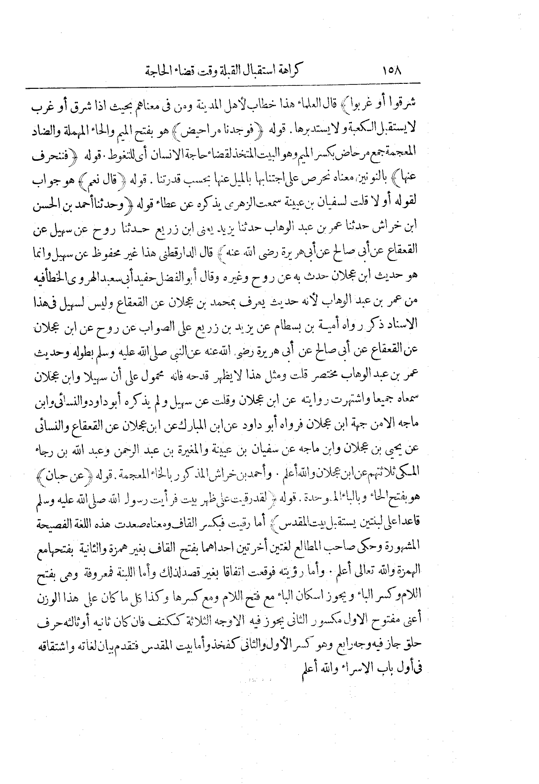 شَرِّقُوا أَوْ غَرِّبُوا) قَالَ الْعُلَمَاءُ هَذَا خِطَابٌ لِأَهْلِ الْمَدِينَةِ وَمَنْ فِي مَعْنَاهُمْ بِحَيْثُ إِذَا شَرَّقَ أَوْ غَرَّبَ لَا يَسْتَقْبِلُ الْكَعْبَةَ وَلَا يَسْتَدْبِرُهَا قَوْلُهُ (فَوَجَدْنَا مَرَاحِيضَ) هُوَ بِفَتْحِ الْمِيمِ وَالْحَاءِ الْمُهْمَلَةِ وَالضَّادِ الْمُعْجَمَةِ جَمْعُ مِرْحَاضٍ بِكَسْرِ الْمِيمِ وَهُوَ الْبَيْتُ الْمُتَّخَذُ لِقَضَاءِ حَاجَةِ الْإِنْسَانِ أَيْ لِلتَّغَوُّطِ قَوْلُهُ (فَنَنْحَرِفُ عَنْهَا) بِالنُّونَيْنِ مَعْنَاهُ نَحْرِصُ عَلَى اجْتِنَابِهَا بِالْمَيْلِ عَنْهَا بِحَسَبِ قُدْرَتِنَا قوله (قال نعم) هو جواب لقوله أو لا قُلْتُ لِسُفْيَانَ بْنِ عُيَيْنَةَ سَمِعْتُ الزُّهْرِيَّ يَذْكُرهُ عَنْ عَطَاءٍ قَوْلُهُ (وَحَدَّثَنَا أَحْمَدُ بْنُ الْحَسَنِ بْنِ خِرَاشٍ حَدَّثَنَا عُمَرُ بْنُ عَبْدِ الْوَهَّابِ حدثنا يزيد يعنى بن زُرَيْعٍ حَدَّثَنَا رَوْحٌ عَنْ سُهَيْلٍ عَنِ الْقَعْقَاعِ عَنْ أَبِي صَالِحٍ عَنْ أَبِي هُرَيْرَةَ رَضِيَ اللَّهُ عَنْهُ) قَالَ الدَّارَقُطْنِيُّ هَذَا غَيْرُ مَحْفُوظٍ عن سهيل وانما هو حديث بن عجلان حدث به عن رَوْحٌ وَغَيْرُهُ وَقَالَ أَبُو الْفَضْلِ حَفِيدُ أَبِي سَعِيدٍ الْهَرَوِيِّ الْخَطَأُ فِيهِ مِنْ عُمَرَ بْنِ عَبْدِ الْوَهَّابِ لِأَنَّهُ حَدِيثٌ يُعْرَفُ بِمُحَمَّدِ بْنِ عَجْلَانَ عَنِ الْقَعْقَاعِ وَلَيْسَ لِسُهَيْلٍ فِي هَذَا الْإِسْنَادِ ذِكْرٌ رَوَاهُ أُمَيَّةُ بْنُ بَسْطَامَ عَنْ يَزِيدَ بْنِ زُرَيْعٍ عَلَى الصَّوَابِ عَنْ رَوْحٍ عن بن عَجْلَانَ عَنِ الْقَعْقَاعِ عَنْ أَبِي صَالِحٍ عَنْ أَبِي هُرَيْرَةَ رَضِيَ اللَّهُ عَنْهُ عَنِ النَّبِيِّ صَلَّى اللَّهُ عَلَيْهِ وَسَلَّمَ بِطُولِهِ وَحَدِيثُ عُمَرَ بْنِ عَبْدِ الْوَهَّابِ مُخْتَصَرٌ قُلْتُ وَمِثْلُ هَذَا لَا يَظْهَرُ قَدْحُهُ فَإِنَّهُ مَحْمُولٌ عَلَى أَنَّ سهيلا وبن عجلان سمعاه جميعا واشتهرت روايته عن بن عَجْلَانَ وَقَلَّتُ عَنْ سُهَيْلٍ وَلَمْ يَذْكُرْهُ أَبُو داود والنسائى وبن ماجه الا من جهة بن عجلان فرواه ابو داود عن بن المبارك عن بن عَجْلَانَ عَنِ الْقَعْقَاعِ وَالنَّسَائِيُّ عَنْ يَحْيَى بْنِ عجلان وبن مَاجَهْ عَنْ سُفْيَانَ بْنِ عُيَيْنَةَ وَالْمُغِيرَةِ بْنِ عَبْدِ الرَّحْمَنِ وَعَبْدِ اللَّهِ بْنِ رَجَاءٍ الْمَكِّيِّ ثلاثتهم عن بن عَجْلَانَ وَاللَّهُ أَعْلَمُ وَأَحْمَدُ بْنُ خِرَاشٍ الْمَذْكُورُ بِالْخَاءِ الْمُعْجَمَةِ قَوْلُهُ (عَنْ حَبَّانَ) هُوَ بِفَتْحِ الْحَاءِ وَبِالْبَاءِ الْمُوَحَّدَةِ قَوْلُهُ (لَقَدْ رَقِيتُ عَلَى ظَهْرِ بَيْتٍ فَرَأَيْتُ رَسُولَ اللَّهِ صَلَّى اللَّهُ عَلَيْهِ وَسَلَّمَ قَاعِدًا عَلَى لَبِنْتَيْنِ يَسْتَقْبِلُ بَيْتَ الْمَقْدِسِ) أَمَّا رَقِيتُ فَبِكَسْرِ الْقَافِ وَمَعْنَاهُ صَعِدْتُ هَذِهِ اللُّغَةُ الْفَصِيحَةُ الْمَشْهُورَةُ وَحَكَى صَاحِبُ الْمَطَالِعِ لُغَتَيْنِ أُخْرَتَيْنِ إِحْدَاهُمَا بِفَتْحِ الْقَافِ بِغَيْرِ هَمْزَةٍ وَالثَّانِيَةُ بِفَتْحِهَا مَعَ الْهَمْزَةِ وَاللَّهُ تَعَالَى أَعْلَمُ وَأَمَّا رُؤْيَتُهُ فَوَقَعَتِ اتِّفَاقًا بِغَيْرِ قَصْدٍ لِذَلِكَ وَأَمَّا اللَّبِنَةُ فَمَعْرُوفَةٌ وَهِيَ بِفَتْحِ اللَّامِ وَكَسْرِ الْبَاءِ وَيَجُوزُ إِسْكَانُ الْبَاءِ مَعَ فَتْحِ اللَّامِ وَمَعَ كَسْرِهَا وَكَذَا كُلُّ مَا كَانَ عَلَى هَذَا الْوَزْنِ أَعْنِي مَفْتُوحُ الْأَوَّلِ مَكْسُورُ الثَّانِي يَجُوزُ فِيهِ الْأَوْجُهُ الثَّلَاثَةُ كَكَتِفٍ فَإِنْ كَانَ ثَانِيهِ أَوْ ثَالِثُهُ حَرْفَ حَلْقٍ جَازَ فِيهِ وَجْهٌ رَابِعٌ وَهُوَ كَسْرُ الْأَوَّلِ وَالثَّانِي كَفَخِذٍ وَأَمَّا بَيْتُ الْمَقْدِسِ فَتَقَدَّمَ بَيَانُ لُغَاتِهِ وَاشْتِقَاقِهِ فِي أَوَّلِ بَابِ الْإِسْرَاءِ وَالل