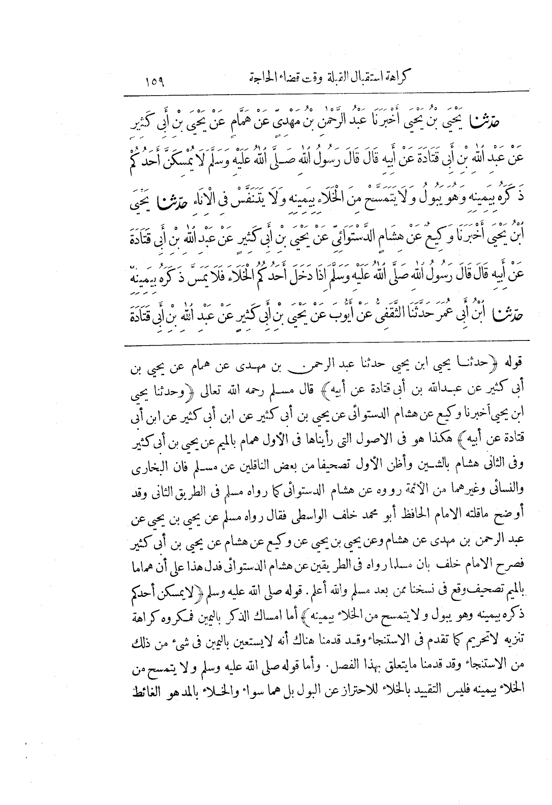 قَوْلُهُ (حَدَّثَنَا يَحْيَى بْنُ يَحْيَى حَدَّثَنَا عَبْدُ الرَّحْمَنِ بْنُ مَهْدِيٍّ عَنْ هَمَّامٍ عَنْ يَحْيَى بن أبى كثير عن عبد الله بن أَبِي قَتَادَةَ عَنْ أَبِيهِ) قَالَ مُسْلِمٌ رَحِمَهُ اللَّهُ تَعَالَى (وَحَدَّثَنَا يَحْيَى بْنُ يَحْيَى أَخْبَرَنَا وَكِيعٌ عَنْ هِشَامٍ الدَّسْتَوَائِيِّ عَنْ يَحْيَى بْنِ أبي كثير عن بن أبى كثير عن بن أبى قَتَادَةَ عَنْ أَبِيهِ) هَكَذَا هُوَ فِي الْأُصُولِ الَّتِي رَأَيْنَاهَا فِي الْأَوَّلِ هَمَّامٌ بِالْمِيمِ عَنْ يَحْيَى بْنِ أَبِي كَثِيرٍ وَفِي الثَّانِي هِشَامٌ بِالشِّينِ وَأَظُنُّ الْأَوَّلَ تَصْحِيفًا مِنْ بَعْضِ النَّاقِلِينَ عَنْ مُسْلِمٍ فَإِنَّ الْبُخَارِيَّ وَالنَّسَائِيَّ وَغَيْرَهُمَا مِنَ الأئمة رووه عَنْ هِشَامٍ الدَّسْتَوَائِيِّ كَمَا رَوَاهُ مُسْلِمٌ فِي الطَّرِيقِ الثَّانِي وَقَدْ أَوْضَحَ مَا قُلْتُهُ الْإِمَامُ الْحَافِظُ أَبُو مُحَمَّدٍ خَلَفٌ الْوَاسِطِيُّ فَقَالَ رَوَاهُ مُسْلِمٌ عَنْ يَحْيَى بْنِ يَحْيَى بْنِ عَبْدِ الرَّحْمَنِ بْنِ مَهْدِيٍّ عَنْ هِشَامٍ وَعَنْ يَحْيَى بْنِ يَحْيَى عَنْ وَكِيعٍ عَنْ هِشَامٍ عَنْ يَحْيَى بْنِ أَبِي كَثِيرٍ فَصَرَّحَ الْإِمَامُ خَلَفٌ بِأَنَّ مُسْلِمًا رَوَاهُ فِي الطَّرِيقَيْنِ عَنْ هِشَامٍ الدَّسْتَوَائِيِّ فَدَلَّ هَذَا عَلَى أَنَّ هَمَّامًا بِالْمِيمِ تَصْحِيفٌ وَقَعَ فِي نُسَخِنَا مِمَّنْ بَعْدَ مُسْلِمٍ وَاللَّهُ أَعْلَمُ قَوْلُهُ صَلَّى اللَّهُ عَلَيْهِ وَسَلَّمَ (لايمسكن أَحَدُكُمْ ذَكَرَهُ بِيَمِينِهِ وَهُوَ يَبُولُ وَلَا يَتَمَسَّحْ مِنَ الْخَلَاءِ بِيَمِينِهِ) أَمَّا إِمْسَاكُ الذَّكَرِ بِالْيَمِينِ فَمَكْرُوهٌ كَرَاهَةَ تَنْزِيهٍ لَا تَحْرِيمٍ كَمَا تَقَدَّمَ فِي الِاسْتِنْجَاءِ وَقَدْ قَدَّمْنَا هُنَاكَ أَنَّهُ لَا يستعين باليمين فى شئ مِنْ ذَلِكَ مِنَ الِاسْتِنْجَاءِ وَقَدْ قَدَّمْنَا مَا يَتَعَلَّقُ بِهَذَا الْفَصْلِ وَأَمَّا قَوْلُهُ صَلَّى اللَّهُ عَلَيْهِ وَسَلَّمَ وَلَا يَتَمَسَّحُ مِنَ الْخَلَاءِ بِيَمِينِهِ فَلَيْسَ التَّقْيِيدُ بِالْخَلَاءِ لِلِاحْتِرَازِ عَنِ الْبَوْلِ بَلْ هما سواء والخلاء بِالْمَدِّ هُوَ الْغَائِطُ