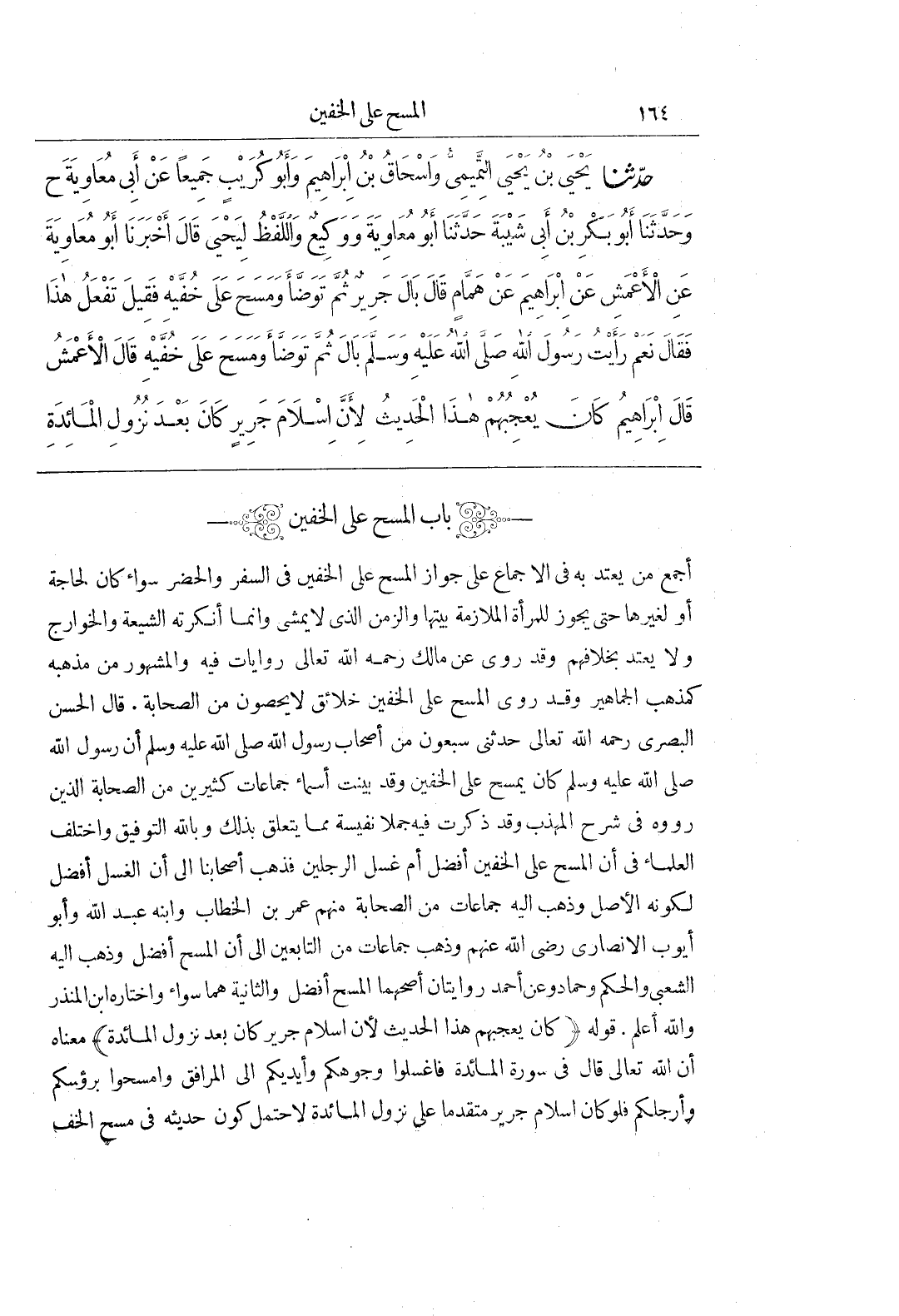 أَجْمَعَ مَنْ يُعْتَدُّ بِهِ فِي الْإِجْمَاعِ عَلَى جَوَازِ الْمَسْحِ عَلَى الْخُفَّيْنِ فِي السَّفَرِ وَالْحَضَرِ سَوَاءٌ كَانَ لِحَاجَةٍ أَوْ لِغَيْرِهَا حَتَّى يَجُوزَ لِلْمَرْأَةِ الْمُلَازِمَةِ بَيْتَهَا وَالزَّمِنِ الَّذِي لَا يَمْشِي وَإِنَّمَا أَنْكَرَتْهُ الشِّيعَةُ وَالْخَوَارِجُ وَلَا يُعْتَدُّ بِخِلَافِهِمْ وَقَدْ رُوِيَ عَنْ مَالِكٍ رَحِمَهُ اللَّهُ تَعَالَى رِوَايَاتٌ فِيهِ وَالْمَشْهُورُ مِنْ مَذْهَبِهِ كَمَذْهَبِ الْجَمَاهِيرِ وَقَدْ رَوَى الْمَسْحَ عَلَى الْخُفَّيْنِ خَلَائِقُ لَا يُحْصَوْنَ مِنَ الصَّحَابَةِ قَالَ الْحَسَنُ الْبَصْرِيُّ رَحِمَهُ اللَّهُ تَعَالَى حَدَّثَنِي سَبْعُونَ مِنْ أَصْحَابِ رَسُولِ اللَّهِ صَلَّى اللَّهُ عَلَيْهِ وَسَلَّمَ أَنَّ رَسُولَ اللَّهِ صَلَّى اللَّهُ عَلَيْهِ وَسَلَّمَ كَانَ يَمْسَحُ عَلَى الْخُفَّيْنِ وَقَدْ بَيَّنْتُ أَسْمَاءَ جَمَاعَاتٍ كَثِيرِينَ مِنَ الصَّحَابَةِ الَّذِينَ رَوَوْهُ فِي شَرْحِ الْمُهَذَّبِ وَقَدْ ذَكَرْتُ فِيهِ جُمَلًا نَفِيسَةً مِمَّا يَتَعَلَّقُ بِذَلِكَ وَبِاللَّهِ التَّوْفِيقُ وَاخْتَلَفَ الْعُلَمَاءُ فِي أَنَّ الْمَسْحَ عَلَى الْخُفَّيْنِ أَفْضَلُ أَمْ غَسْلَ الرِّجْلَيْنِ فَذَهَبَ أَصْحَابُنَا إِلَى أَنَّ الْغَسْلَ أَفْضَلُ لِكَوْنِهِ الْأَصْلَ وَذَهَبَ إِلَيْهِ جَمَاعَاتٌ مِنَ الصَّحَابَةِ مِنْهُمْ عُمَرُ بْنُ الْخَطَّابِ وَابْنُهُ عَبْدُ اللَّهِ وَأَبُو أَيُّوبَ الْأَنْصَارِيُّ رَضِيَ اللَّهُ عَنْهُمْ وَذَهَبَ جَمَاعَاتٌ مِنَ التَّابِعِينَ إِلَى أن المسح أفضل وذهب إليه الشَّعْبِيُّ وَالْحَكَمُ وَحَمَّادٌ وَعَنْ أَحْمَدَ رِوَايَتَانِ أَصَحُّهُمَا المسح أفضل والثانية هما سواء واختاره بن المنذر والله أعلم قَوْلُهُ (كَانَ يُعْجِبهُمْ هَذَا الْحَدِيثُ لِأَنَّ إِسْلَامَ جَرِيرٍ كَانَ بَعْدَ نُزُولِ الْمَائِدَةِ) مَعْنَاهُ أَنَّ اللَّهَ تَعَالَى قَالَ فِي سُورَةِ الْمَائِدَةِ فَاغْسِلُوا وُجُوهَكُمْ وَأَيْدِيكُمْ إِلَى الْمَرَافِقِ وَامْسَحُوا بِرُءُوسِكُمْ وَأَرْجُلَكُمْ فَلَوْ كَانَ إِسْلَامُ جَرِيرٍ مُتَقَدِّمًا عَلَى نُزُولِ الْمَائِدَةِ لَاحْتُمِلَ كَوْنُ حَدِيثِهِ فِي مَسْحِ الْخُفِّ