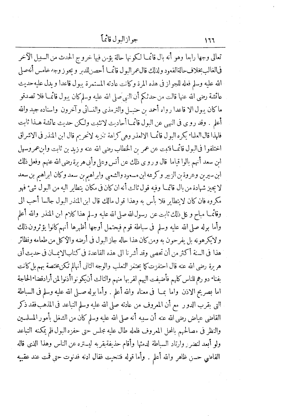 تَعَالَى وَجْهًا رَابِعًا وَهُوَ أَنَّهُ بَالَ قَائِمًا لِكَوْنِهَا حَالَةً يُؤْمَنُ فِيهَا خُرُوجُ الْحَدَثِ مِنَ السَّبِيلِ الْآخَرِ فِي الْغَالِبِ بِخِلَافِ حَالَةِ الْقُعُودِ وَلِذَلِكَ قَالَ عُمَرُ الْبَوْلُ قَائِمًا أَحْصَنُ لِلدُّبُرِ وَيَجُوزُ وَجْهٌ خَامِسٌ أَنَّهُ صَلَّى اللَّهُ عَلَيْهِ وَسَلَّمَ فَعَلَهُ لِلْجَوَازِ فِي هَذِهِ الْمَرَّةِ وَكَانَتْ عادته المستمرة يبول قاعدا ويدل عَلَيْهِ حَدِيثُ عَائِشَةَ رَضِيَ اللَّهُ عَنْهَا قَالَتْ مَنْ حَدَّثَكُمْ أَنَّ النَّبِيَّ صَلَّى اللَّهُ عَلَيْهِ وَسَلَّمَ كَانَ يَبُولُ قَائِمًا فَلَا تُصَدِّقُوهُ مَا كَانَ يَبُولُ إِلَّا قَاعِدًا رَوَاهُ أَحْمَدُ بْنُ حَنْبَلٍ وَالتِّرْمِذِيُّ وَالنَّسَائِيُّ وَآخَرُونَ وَإِسْنَادُهُ جَيِّدٌ وَاللَّهُ أَعْلَمُ وَقَدْ رُوِيَ فِي النَّهْيِ عَنِ الْبَوْلِ قَائِمًا أَحَادِيثُ لَا تَثْبُتُ وَلَكِنَّ حَدِيثَ عَائِشَةَ هَذَا ثَابِتٌ فَلِهَذَا قَالَ الْعُلَمَاءُ يُكْرَهُ الْبَوْلُ قَائِمًا إِلَّا لِعُذْرٍ وَهِيَ كَرَاهَةُ تَنْزِيهٍ لَا تحريم قال بن الْمُنْذِرِ فِي الْإِشْرَاقِ اخْتَلَفُوا فِي الْبَوْلِ قَائِمًا فَثَبَتَ عَنْ عُمَرَ بْنِ الْخَطَّابِ رَضِيَ اللَّهُ عَنْهُ وزيد بن ثابت وبن عُمَرَ وَسَهْلِ بْنِ سَعْدٍ أَنَّهُمْ بَالُوا قِيَامًا قَالَ وَرُوِيَ ذَلِكَ عَنْ أَنَسٍ وَعَلِيٍّ وَأَبِي هريرة رضى الله عنهم وفعل ذلك بن سيرين وعروة بن الزبير وكرهه بن مَسْعُودٍ وَالشَّعْبِيُّ وَإِبْرَاهِيمُ بْنُ سَعْدٍ وَكَانَ إِبْرَاهِيمُ بْنُ سَعْدٍ لَا يُجِيزُ شَهَادَةَ مَنْ بَالَ قَائِمًا وَفِيهِ قَوْلٌ ثَالِثٌ أَنَّهُ كَانَ فِي مكان يتطاير إليه من البول شئ فَهُوَ مَكْرُوهٌ فَإِنْ كَانَ لَا يَتَطَايَرُ فَلَا بأس به وهذا قول مالك قال بن الْمُنْذِرِ الْبَوْلُ جَالِسًا أَحَبُّ إِلَيَّ وَقَائِمًا مُبَاحٌ وَكُلُّ ذَلِكَ ثَابِتٌ عَنْ رَسُولِ اللَّهِ صَلَّى اللَّهُ عَلَيْهِ وَسَلَّمَ هذا كلام بن الْمُنْذِرِ وَاللَّهُ أَعْلَمُ وَأَمَّا بَوْلُهُ صَلَّى اللَّهُ عَلَيْهِ وَسَلَّمَ فِي سُبَاطَةِ قَوْمٍ فَيَحْتَمِلُ أَوْجُهًا أَظْهَرُهَا أَنَّهُمْ كَانُوا يُؤْثِرُونَ ذَلِكَ وَلَا يَكْرَهُونَهُ بَلْ يَفْرَحُونَ بِهِ وَمَنْ كَانَ هَذَا حَالَهُ جَازَ الْبَوْلُ فِي أَرْضِهِ وَالْأَكْلُ مِنْ طَعَامِهِ وَنَظَائِرُ هَذَا فِي السُّنَّةِ أَكْثَرُ مِنْ أَنْ تُحْصَى وَقَدْ أَشَرْنَا إِلَى هَذِهِ الْقَاعِدَةِ فِي كِتَابِ الْإِيمَانِ فِي حَدِيثِ أَبِي هُرَيْرَةَ رَضِيَ اللَّهُ عَنْهُ قَالَ احْتَفَزْتُ كَمَا يَحْتَفِزُ الثَّعْلَبُ وَالْوَجْهُ الثَّانِي أَنَّهَا لَمْ تَكُنْ مُخْتَصَّةً بِهِمْ بَلْ كَانَتْ بِفِنَاءِ دُورِهِمْ لِلنَّاسِ كُلِّهِمْ فَأُضِيفَتْ إِلَيْهِمْ لَقُرْبِهَا مِنْهُمْ وَالثَّالِثُ أَنْ يَكُونُوا أَذِنُوا لِمَنْ أَرَادَ قَضَاءَ الْحَاجَةِ إِمَّا بِصَرِيحِ الْإِذْنِ وَإِمَّا بِمَا فِي مَعْنَاهُ وَاللَّهُ أَعْلَمُ وَأَمَّا بَوْلُهُ صَلَّى اللَّهُ عَلَيْهِ وَسَلَّمَ فِي السُّبَاطَةِ الَّتِي بِقُرْبِ الدُّورِ مَعَ أَنَّ الْمَعْرُوفَ مِنْ عَادَتِهِ صَلَّى اللَّهُ عَلَيْهِ وَسَلَّمَ التَّبَاعُدُ فِي الْمَذْهَبِ فَقَدْ ذَكَرَ الْقَاضِي عِيَاضٌ رَضِيَ اللَّهُ عَنْهُ أَنَّ سَبَبَهُ أَنَّهُ صَلَّى اللَّهُ عَلَيْهِ وَسَلَّمَ كَانَ مِنَ الشُّغْلِ بِأُمُورِ الْمُسْلِمِينَ وَالنَّظَرِ فِي مَصَالِحِهِمْ بِالْمَحَلِّ الْمَعْرُوفِ فَلَعَلَّهُ طَالَ عَلَيْهِ مَجْلِسٌ حَتَّى حَفَزَهُ الْبَوْلُ فَلَمْ يُمْكِنْهُ التَّبَاعُدُ وَلَوْ أَبْعَدَ لَتَضَرَّرَ وَارْتَادَ السُّبَاطَةَ لِدَمَثِهَا وَأَقَامَ حُذَيْفَةُ بِقُرْبِهِ لِيَسْتُرَهُ عَنِ النَّاسِ وَهَذَا الَّذِي قَالَهُ الْقَاضِي حَسَنٌ ظَاهِرٌ 