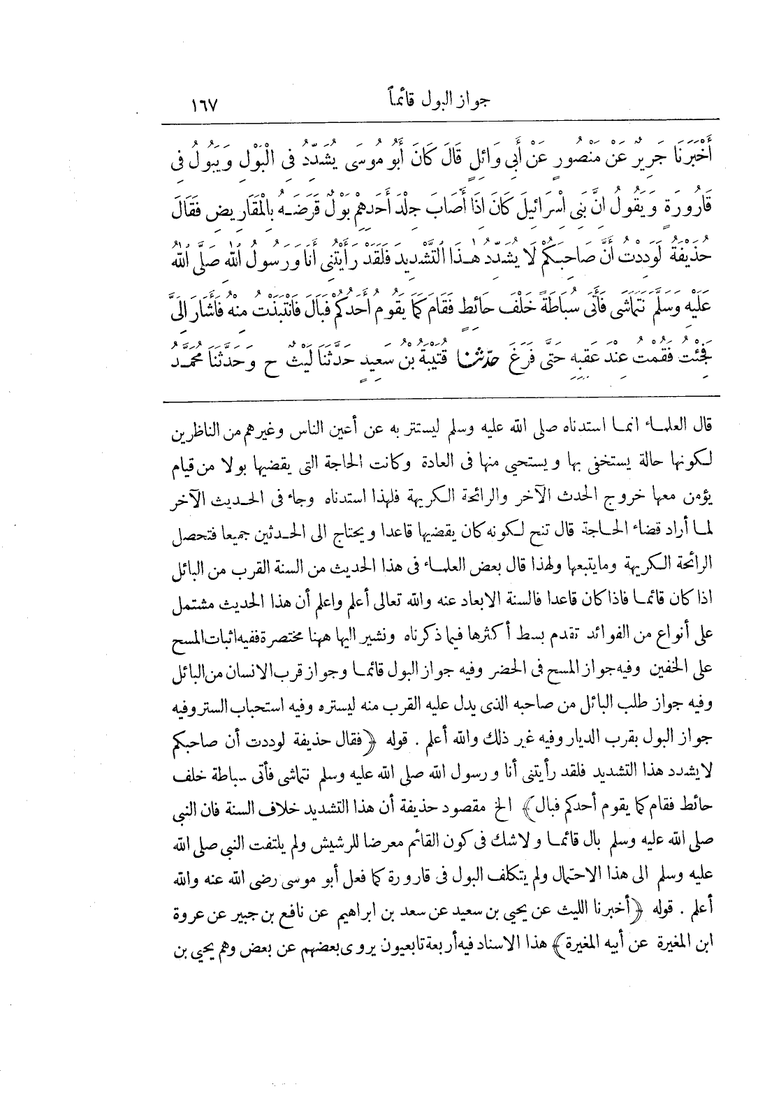 قَالَ الْعُلَمَاءُ إِنَّمَا اسْتَدْنَاهُ صَلَّى اللَّهُ عَلَيْهِ وَسَلَّمَ لِيَسْتَتِرَ بِهِ عَنْ أَعْيُنِ النَّاسِ وَغَيْرِهِمْ من الناظرين لكونها حالة يستخفى بها ويستحي مِنْهَا فِي الْعَادَةِ وَكَانَتِ الْحَاجَةُ الَّتِي يَقْضِيهَا بَوْلًا مِنْ قِيَامٍ يُؤْمَنُ مَعَهَا خُرُوجُ الْحَدَثِ الْآخَرِ وَالرَّائِحَةِ الْكَرِيهَةِ فَلِهَذَا اسْتَدْنَاهُ وَجَاءَ فِي الْحَدِيثِ الْآخَرِ لَمَّا أَرَادَ قَضَاءَ الْحَاجَةِ قَالَ تَنَحَّ لِكَوْنِهِ كَانَ يَقْضِيهَا قَاعِدًا وَيَحْتَاجُ إِلَى الحديثين جَمِيعًا فَتَحْصُلُ الرَّائِحَةُ الْكَرِيهَةُ وَمَا يَتْبَعُهَا وَلِهَذَا قَالَ بَعْضُ الْعُلَمَاءِ فِي هَذَا الْحَدِيثِ مِنَ السُّنَّةِ الْقُرْبُ مِنَ الْبَائِلِ إِذَا كَانَ قَائِمًا فَإِذَا كَانَ قَاعِدًا فَالسُّنَّةُ الْإِبْعَادُ عَنْهُ وَاللَّهُ تَعَالَى أَعْلَمُ وَاعْلَمْ أَنَّ هَذَا الْحَدِيثَ مُشْتَمِلٌ عَلَى أَنْوَاعٍ مِنَ الْفَوَائِدِ تَقَدَّمَ بَسْطُ أَكْثَرِهَا فيما ذكرناه ونشير اليها ها هنا مُخْتَصَرَةً فَفِيهِ إِثْبَاتُ الْمَسْحِ عَلَى الْخُفَّيْنِ وَفِيهِ جَوَازُ الْمَسْحِ فِي الْحَضَرِ وَفِيهِ جَوَازُ الْبَوْلِ قَائِمًا وَجَوَازُ قُرْبِ الْإِنْسَانِ مِنَ الْبَائِلِ وَفِيهِ جَوَازُ طَلَبِ الْبَائِلِ مِنْ صَاحِبِهِ الَّذِي يَدُلُّ عَلَيْهِ الْقُرْبُ مِنْهُ لِيَسْتُرَهُ وَفِيهِ اسْتِحْبَابُ السِّتْرِ وَفِيهِ جَوَازُ الْبَوْلِ بِقُرْبِ الدِّيَارِ وَفِيهِ غَيْرُ ذَلِكَ وَاللَّهُ أَعْلَمُ قَوْلُهُ (فَقَالَ حُذَيْفَةُ لَوَدِدْتُ أَنَّ صَاحِبكُمْ لَا يُشَدِّدُ هَذَا التَّشْدِيدَ فَلَقَدْ رَأَيْتُنِي أَنَا وَرَسُولُ اللَّهِ صَلَّى اللَّهُ عَلَيْهِ وَسَلَّمَ نَتَمَاشَى فَأَتَى سُبَاطَةً خَلْفَ حَائِطٍ فَقَامَ كَمَا يَقُومُ أَحَدُكُمْ فَبَالَ) إِلَخْ مَقْصُودُ حُذَيْفَةَ أَنَّ هَذَا التَّشْدِيدَ خِلَافُ السُّنَّةِ فَإِنَّ النَّبِيَّ صَلَّى اللَّهُ عَلَيْهِ وَسَلَّمَ بَالَ قَائِمًا وَلَا شَكَّ فِي كَوْنِ الْقَائِمِ مُعَرَّضًا لِلرَّشِيشِ وَلَمْ يَلْتَفِتِ النَّبِيُّ صَلَّى اللَّهُ عَلَيْهِ وَسَلَّمَ إِلَى هَذَا الِاحْتِمَالِ وَلَمْ يَتَكَلَّفِ الْبَوْلَ فِي قَارُورَةٍ كَمَا فَعَلَ أَبُو مُوسَى رَضِيَ اللَّهُ عَنْهُ وَاللَّهُ أَعْلَمُ قَوْلُهُ (أَخْبَرَنَا اللَّيْثُ عَنْ يَحْيَى بْنِ سَعِيدٍ عَنْ سَعْدِ بْنِ إِبْرَاهِيمَ عَنْ نَافِعِ بْنِ جُبَيْرٍ عَنْ عُرْوَةَ بْنِ الْمُغِيرَةِ عَنْ أَبِيهِ الْمُغِيرَةِ) هَذَا الْإِسْنَادُ فِيهِ أَرْبَعَةٌ تَابِعِيُّونَ يَرْوِي بَعْضُهُمْ عَنْ بَعْضٍ وَهُمْ يَحْيَى بْنُ
