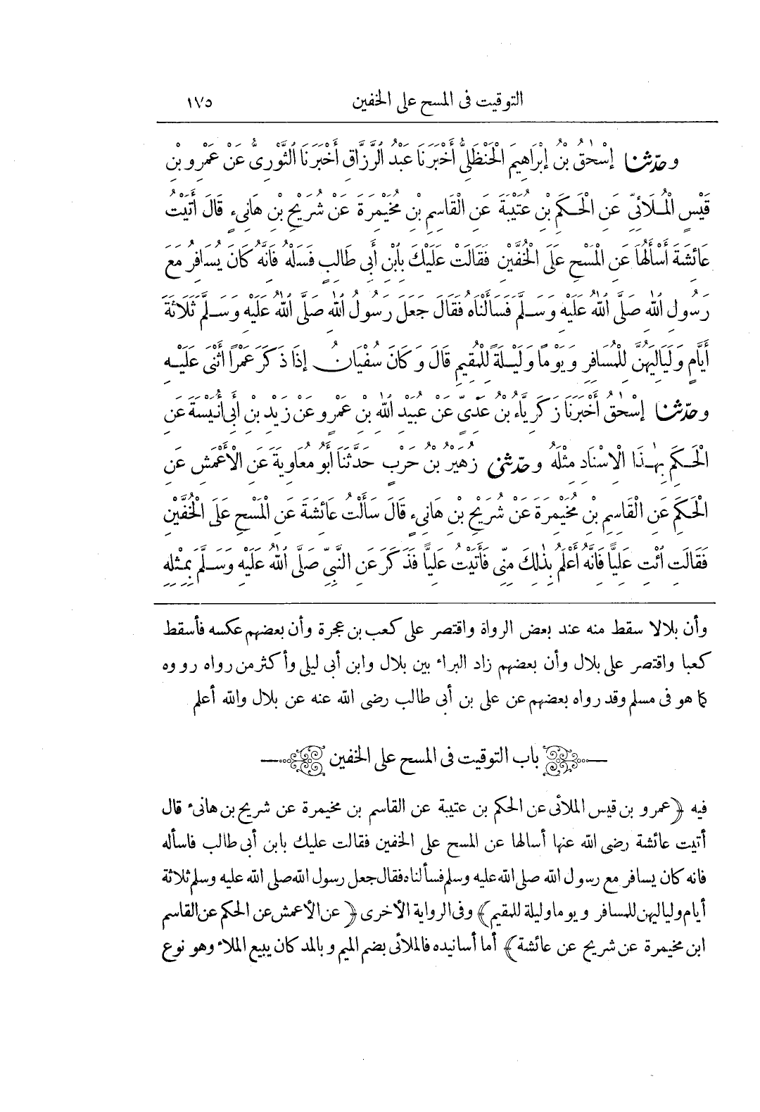 فِيهِ (عَمْرُو بْنُ قَيْسٍ الْمُلَائِيُّ عَنِ الْحَكَمِ بْنِ عُتَيْبَةَ عَنِ الْقَاسِمِ بْنِ مُخَيْمِرَةَ عَنْ شُرَيْحِ بْنِ هَانِئٍ قَالَ أَتَيْتُ عَائِشَةَ رَضِيَ اللَّهُ عَنْهَا أَسْأَلُهَا عَنِ الْمَسْحِ عَلَى الْخُفَّيْنِ فَقَالَتْ عَلَيْكَ بِابْنِ أَبِي طَالِبٍ فَاسْأَلْهُ فَإِنَّهُ كَانَ يُسَافِرُ مَعَ رَسُولِ اللَّهِ صَلَّى اللَّهُ عَلَيْهِ وَسَلَّمَ فَسَأَلْنَاهُ فَقَالَ جَعَلَ رَسُولُ اللَّهِ صَلَّى اللَّهُ عَلَيْهِ وَسَلَّمَ ثَلَاثَةَ أَيَّامٍ وَلَيَالِيهِنَّ لِلْمُسَافِرِ وَيَوْمًا وَلَيْلَةً لِلْمُقِيمِ) وَفِي الرِّوَايَةِ الْأُخْرَى (عَنِ الْأَعْمَشِ عَنِ الْحَكَمِ عَنِ الْقَاسِمِ بْنِ مُخَيْمِرَةَ عَنْ شُرَيْحٍ عَنْ عَائِشَةَ) أَمَّا أَسَانِيدُهُ فَالْمُلَائِيُّ بِضَمِّ الْمِيمِ وَبِالْمَدِّ كَانَ يَبِيعُ الْمُلَاءَ وَهُوَ نَوْعٌ