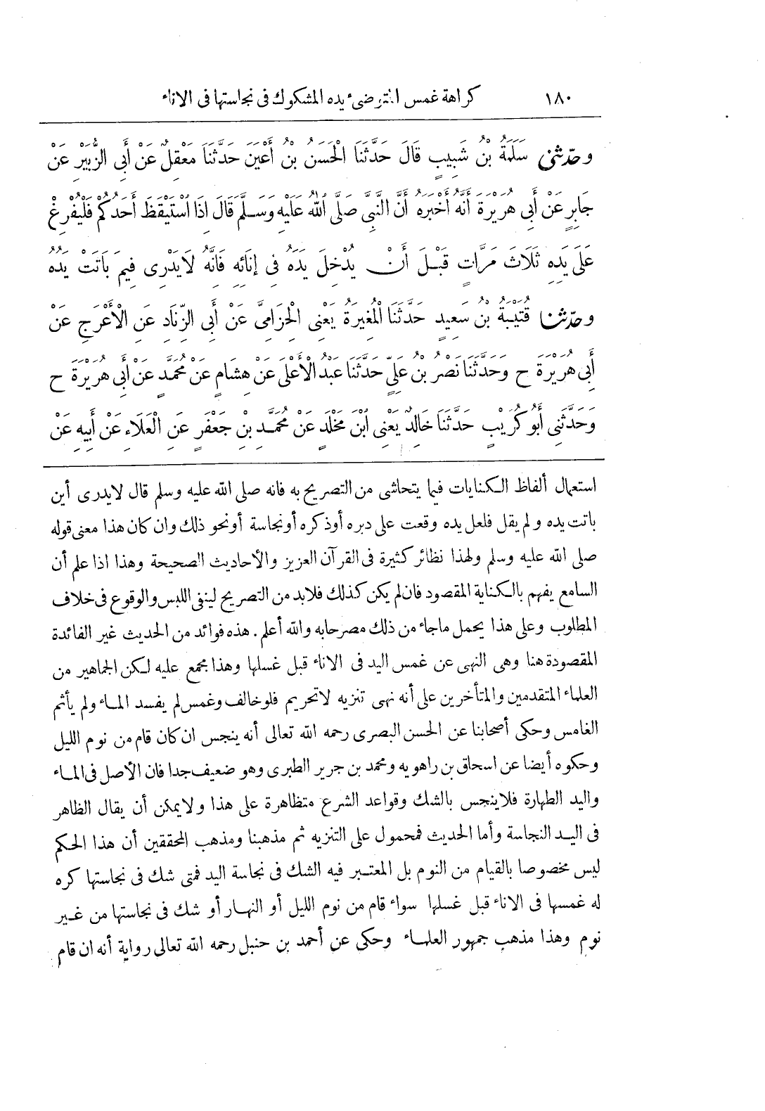 اسْتِعْمَالِ أَلْفَاظِ الْكِنَايَاتِ فِيمَا يُتَحَاشَى مِنَ التَّصْرِيحِ بِهِ فَإِنَّهُ صَلَّى اللَّهُ عَلَيْهِ وَسَلَّمَ قَالَ لَا يَدْرِي أَيْنَ بَاتَتْ يَدُهُ وَلَمْ يَقُلْ فَلَعَلَّ يَدَهُ وَقَعَتْ عَلَى دُبُرِهِ أَوْ ذَكَرِهِ أَوْ نَجَاسَةٍ أَوْ نَحْوِ ذَلِكَ وَإِنْ كَانَ هَذَا مَعْنَى قَوْلِهِ صَلَّى اللَّهُ عَلَيْهِ وَسَلَّمَ وَلِهَذَا نَظَائِرُ كَثِيرَةٌ فِي الْقُرْآنِ الْعَزِيزِ وَالْأَحَادِيثِ الصَّحِيحَةِ وَهَذَا إِذَا عَلِمَ أَنَّ السَّامِعَ يَفْهَمُ بِالْكِنَايَةِ الْمَقْصُودَ فَإِنْ لَمْ يَكُنْ كَذَلِكَ فَلَا بُدَّ مِنَ التَّصْرِيحِ لِيَنْفِيَ اللَّبْسَ وَالْوُقُوعَ فِي خلاف المطلوب وعلى هذا يُحْمَلُ مَا جَاءَ مِنْ ذَلِكَ مُصَرَّحًا بِهِ وَاللَّهُ أَعْلَمُ هَذِهِ فَوَائِدُ مِنَ الْحَدِيثِ غَيْرُ الْفَائِدَةِ الْمَقْصُودَةِ هُنَا وَهِيَ النَّهْيُ عَنْ غَمْسِ الْيَدِ فِي الْإِنَاءِ قَبْلَ غَسْلِهَا وَهَذَا مُجْمَعٌ عَلَيْهِ لَكِنَّ الْجَمَاهِيرَ مِنَ الْعُلَمَاءِ الْمُتَقَدِّمِينَ وَالْمُتَأَخِّرِينَ عَلَى أَنَّهُ نَهْيُ تَنْزِيهٍ لَا تَحْرِيمٍ فَلَوْ خَالَفَ وَغَمَسَ لَمْ يَفْسُدِ الْمَاءُ وَلَمْ يَأْثَمِ الْغَامِسُ وَحَكَى أَصْحَابُنَا عَنِ الْحَسَنِ الْبَصْرِيِّ رَحِمَهُ اللَّهُ تَعَالَى أَنَّهُ يَنْجُسُ إِنْ كَانَ قَامَ مِنْ نَوْمِ اللَّيْلِ وَحَكَوْهُ أَيْضًا عَنْ إِسْحَاقَ بْنِ رَاهَوَيْهِ وَمُحَمَّدِ بْنِ جَرِيرٍ الطَّبَرِيِّ وَهُوَ ضَعِيفٌ جِدًّا فَإِنَّ الْأَصْلَ فِي الْمَاءِ وَالْيَدِ الطَّهَارَةُ فَلَا يَنْجُسُ بِالشَّكِّ وَقَوَاعِدُ الشَّرْعِ مُتَظَاهِرَةٌ عَلَى هَذَا وَلَا يُمْكِنُ أَنْ يُقَالَ الظَّاهِرُ فِي الْيَدِ النَّجَاسَةُ وَأَمَّا الْحَدِيثُ فَمَحْمُولٌ عَلَى التَّنْزِيهِ ثُمَّ مَذْهَبُنَا وَمَذْهَبُ الْمُحَقِّقِينَ أَنَّ هَذَا الْحُكْمَ لَيْسَ مَخْصُوصًا بِالْقِيَامِ مِنَ النَّوْمِ بَلِ الْمُعْتَبَرُ فِيهِ الشَّكُّ فِي نَجَاسَةِ الْيَدِ فَمَتَى شَكَّ فِي نَجَاسَتِهَا كُرِهَ لَهُ غَمْسُهَا فِي الاناء قبل غسلها سواء قَامَ مِنْ نَوْمِ اللَّيْلِ أَوِ النَّهَارِ أَوْ شَكَّ فِي نَجَاسَتِهَا مِنْ غَيْرِ نَوْمٍ وَهَذَا مَذْهَبُ جُمْهُورِ الْعُلَمَاءِ وَحُكِيَ عَنْ أَحْمَدَ بْنِ حَنْبَلٍ رَحِمَهُ اللَّهُ تَعَالَى رِوَايَةً أَنَّهُ إِنْ قام