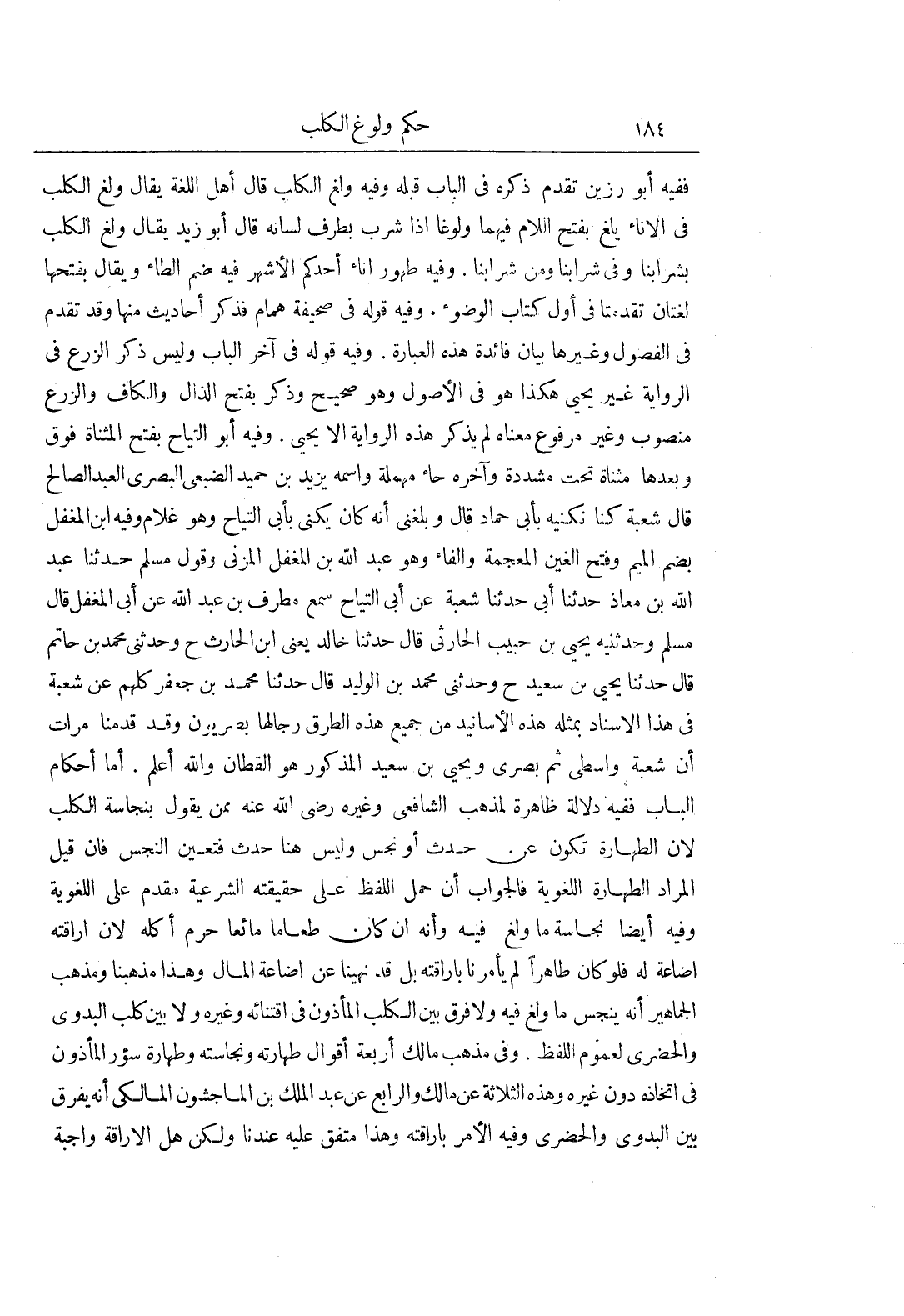 فَفِيهِ أَبُو رَزِينٍ تَقَدَّمَ ذِكْرُهُ فِي الْبَابِ قَبْلَهُ وَفِيهِ وَلَغَ الْكَلْبُ قَالَ أَهْلُ اللُّغَةِ يُقَالُ وَلَغَ الْكَلْبُ فِي الْإِنَاءِ يَلَغُ بِفَتْحِ اللام فيهما ولوغا إذا شَرِبَ بِطَرَفِ لِسَانِهِ قَالَ أَبُو زَيْدٍ يُقَالُ وَلَغَ الْكَلْبُ بِشَرَابِنَا وَفِي شَرَابِنَا وَمِنْ شَرَابِنَا وَفِيهِ طُهُورُ إِنَاءِ أَحَدِكُمْ الْأَشْهَرُ فِيهِ ضَمُّ الطَّاءِ وَيُقَالُ بِفَتْحِهَا لُغَتَانِ تَقَدَّمَتَا فِي أَوَّلِ كِتَابِ الْوُضُوءِ وَفِيهِ قَوْلُهُ فِي صَحِيفَةِ هَمَّامٍ فَذَكَرَ أَحَادِيثَ مِنْهَا وَقَدْ تَقَدَّمَ فِي الْفُصُولِ وَغَيْرِهَا بَيَانُ فَائِدَةِ هَذِهِ الْعِبَارَةِ وَفِيهِ قَوْلُهُ فِي آخِرِ الْبَابِ وَلَيْسَ ذَكَرَ الزَّرْعَ فِي الرواية غير يحيى هكذا هو فِي الْأُصُولِ وَهُوَ صَحِيحٌ وَذَكَرَ بِفَتْحِ الذَّالِ وَالْكَافِ وَالزَّرْعَ مَنْصُوبٌ وَغَيْرُ مَرْفُوعٌ مَعْنَاهُ لَمْ يذكر هذه الرواية الا يحيى وفيه أبوالتياح بِفَتْحِ الْمُثَنَّاةِ فَوْقُ وَبَعْدَهَا مُثَنَّاةٌ تَحْتُ مُشَدَّدَةٌ وَآخِرُهُ حَاءٌ مُهْمَلَةٌ وَاسْمُهُ يَزِيدُ بْنُ حُمَيْدٍ الضُّبَعِيُّ الْبَصْرِيُّ الْعَبْدُ الصَّالِحُ قَالَ شُعْبَةُ كُنَّا نُكَنِّيهِ بِأَبِي حَمَّادٍ قَالَ وَبَلَغَنِي أَنَّهُ كَانَ يكنى بأبى التياح وهو غلام وفيه بن الْمُغَفَّلِ بِضَمِّ الْمِيمِ وَفَتْحِ الْغَيْنِ الْمُعْجَمَةِ وَالْفَاءِ وَهُوَ عَبْدُ اللَّهِ بْنُ الْمُغَفَّلِ الْمُزَنِيُّ وَقَوْلُ مُسْلِمٍ حَدَّثَنَا عَبْدُ اللَّهِ بْنُ مُعَاذٍ حَدَّثَنَا أَبِي حَدَّثَنَا شُعْبَةُ عَنْ أَبِي التَّيَّاحِ سَمِعَ مُطَرِّفَ بْنَ عَبْدِ اللَّهِ عَنْ أَبِي الْمُغَفَّلِ قَالَ مُسْلِمٌ وَحَدَّثَنِيهِ يَحْيَى بْنُ حَبِيبٍ الْحَارِثِيُّ قال حدثنا خالد يعنى بن الْحَارِثِ ح وَحَدَّثَنِي مُحَمَّدُ بْنُ حَاتِمٍ قَالَ حَدَّثَنَا يَحْيَى بْنُ سَعِيدٍ ح وَحَدَّثَنِي مُحَمَّدُ بْنُ الْوَلِيدِ قَالَ حَدَّثَنَا مُحَمَّدُ بْنُ جَعْفَرٍ كُلُّهُمْ عَنْ شُعْبَةَ فِي هَذَا الْإِسْنَادِ بِمِثْلِهِ هَذِهِ الْأَسَانِيدُ مِنْ جَمِيعِ هَذِهِ الطُّرُقِ رِجَالُهَا بَصْرِيُّونَ وَقَدْ قَدَّمْنَا مَرَّاتٍ أَنَّ شُعْبَةَ وَاسِطِيٌّ ثُمَّ بَصْرِيٌّ وَيَحْيَى بْنُ سَعِيدٍ الْمَذْكُورُ هُوَ الْقَطَّانُ وَاللَّهُ أَعْلَمُ أَمَّا أَحْكَامُ الْبَابِ فَفِيهِ دَلَالَةٌ ظَاهِرَةٌ لِمَذْهَبِ الشَّافِعِيِّ وَغَيْرِهِ رَضِيَ اللَّهُ عَنْهُ مِمَّنْ يَقُولُ بِنَجَاسَةِ الْكَلْبِ لِأَنَّ الطَّهَارَةَ تَكُونُ عَنْ حَدَثٍ أَوْ نَجَسٍ وَلَيْسَ هُنَا حَدَثٌ فَتَعَيَّنَ النَّجَسُ فَإِنْ قِيلَ الْمُرَادُ الطَّهَارَةُ اللُّغَوِيَّةُ فَالْجَوَابُ أَنَّ حَمْلَ اللَّفْظِ عَلَى حَقِيقَتِهِ الشَّرْعِيَّةِ مُقَدَّمٌ عَلَى اللُّغَوِيَّةِ وَفِيهِ أَيْضًا نَجَاسَةُ مَا وَلَغَ فِيهِ وَأَنَّهُ إِنْ كَانَ طَعَامًا مَائِعًا حَرُمَ أَكْلُهُ لِأَنَّ إِرَاقَتَهُ إِضَاعَةٌ لَهُ فَلَوْ كَانَ طَاهِرًا لَمْ يَأْمُرْنَا بِإِرَاقَتِهِ بَلْ قَدْ نُهِينَا عَنْ إِضَاعَةِ الْمَالِ وَهَذَا مَذْهَبُنَا وَمَذْهَبُ الْجَمَاهِيرِ أَنَّهُ يَنْجُسُ مَا وَلَغَ فِيهِ وَلَا فَرْقَ بَيْنَ الْكَلْبِ الْمَأْذُونِ فِي اقْتِنَائِهِ وَغَيْرِهِ وَلَا بَيْنَ كَلْبِ الْبَدَوِيِّ وَالْحَضَرِيِّ لِعُمُومِ اللَّفْظِ وَفِي مَذْهَبِ مَالِكٍ أَرْبَعَةُ أَقْوَالٍ طَهَارَتُهُ وَنَجَاسَتُهُ وَطَهَارَةُ سُؤْرِ الْمَأْذُونِ فِي اتِّخَاذِهِ دُونَ غَيْرِهِ وَهَذِهِ الثَّلَاثَةُ عَنْ مَالِكٍ وَالرَّابِعُ عَنْ عَبْدِ الْمَلِكِ بْنِ الْمَاجِشُونِ الْمَالِكِيِّ أَنَّهُ يُفَرَّقُ بَيْنَ الْبَدَوِيِّ وَالْحَضَرِيِّ وَفِيهِ الْأَمْرُ بِإِرَاقَتِهِ وَهَذَا مُتَّفَقٌ عَلَيْهِ عِنْد
