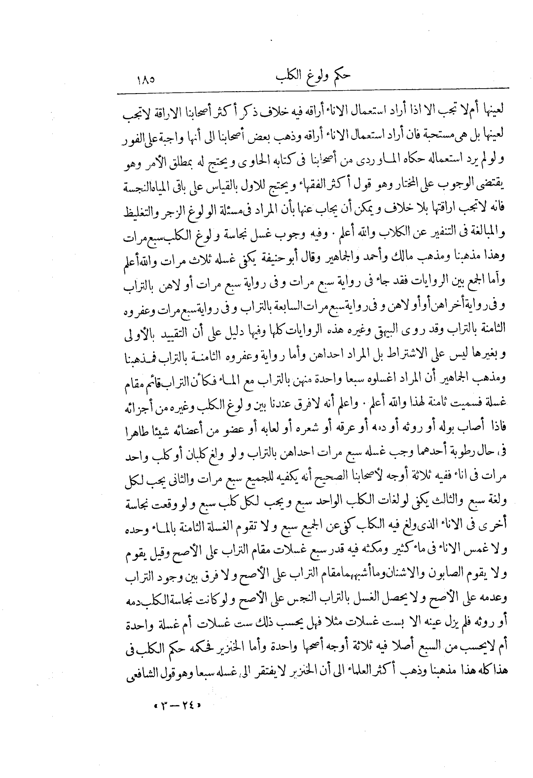 لِعَيْنِهَا أَمْ لَا تَجِبُ إِلَّا إِذَا أَرَادَ اسْتِعْمَالَ الْإِنَاءِ أَرَاقَهُ فِيهِ خِلَافٌ ذَكَرَ أَكْثَرُ أصحابنا الْإِرَاقَةَ لَا تَجِبُ لِعَيْنِهَا بَلْ هِيَ مُسْتَحَبَّةٌ فَإِنْ أَرَادَ اسْتِعْمَالَ الْإِنَاءِ أَرَاقَهُ وَذَهَبَ بَعْضُ أَصْحَابِنَا إِلَى أَنَّهَا وَاجِبَةٌ عَلَى الْفَوْرِ وَلَوْ لَمْ يُرِدِ اسْتِعْمَالَهُ حَكَاهُ الْمَاوَرْدِيُّ مِنْ أَصْحَابِنَا فِي كِتَابِهِ الْحَاوِي وَيَحْتَجُّ لَهُ بِمُطْلَقِ الْأَمْرِ وَهُوَ يَقْتَضِي الْوُجُوبَ عَلَى الْمُخْتَارِ وَهُوَ قَوْلُ أَكْثَرِ الْفُقَهَاءِ وَيُحْتَجُّ لِلْأَوَّلِ بِالْقِيَاسِ عَلَى بَاقِي الْمِيَاهِ النَّجِسَةِ فَإِنَّهُ لَا تَجِبُ إِرَاقَتُهَا بِلَا خِلَافٍ وَيُمْكِنُ أَنْ يُجَابَ عَنْهَا بِأَنَّ الْمُرَادَ فِي مَسْأَلَةِ الْوُلُوغِ الزَّجْرُ وَالتَّغْلِيظُ وَالْمُبَالَغَةُ فِي التَّنْفِيرِ عَنِ الْكِلَابِ وَاللَّهُ أَعْلَمُ وَفِيهِ وُجُوبُ غَسْلِ نَجَاسَةِ وُلُوغِ الْكَلْبِ سَبْعَ مَرَّاتٍ وَهَذَا مَذْهَبُنَا وَمَذْهَبُ مَالِكٍ وَأَحْمَدَ وَالْجَمَاهِيرِ وَقَالَ أَبُو حَنِيفَةَ يَكْفِي غَسْلُهُ ثَلَاثَ مَرَّاتٍ وَاللَّهُ أَعْلَمُ وَأَمَّا الْجَمْعُ بَيْنَ الرِّوَايَاتِ فَقَدْ جَاءَ فِي رِوَايَةٍ سَبْعَ مَرَّاتٍ وَفِي رِوَايَةٍ سَبْعَ مَرَّاتٍ أُولَاهُنَّ بِالتُّرَابِ وَفِي رِوَايَةٍ أُخْرَاهُنَّ أَوْ أُولَاهُنَّ وَفِي رِوَايَةٍ سَبْعَ مَرَّاتٍ السَّابِعَةُ بِالتُّرَابِ وَفِي رِوَايَةٍ سَبْعَ مَرَّاتٍ وَعَفِّرُوهُ الثَّامِنَةَ بِالتُّرَابِ وَقَدْ رَوَى الْبَيْهَقِيُّ وَغَيْرُهُ هَذِهِ الرِّوَايَاتِ كُلَّهَا وَفِيهَا دَلِيلٌ عَلَى أَنَّ التَّقْيِيدَ بِالْأُولَى وَبِغَيْرِهَا لَيْسَ عَلَى الِاشْتِرَاطِ بَلِ الْمُرَادُ إِحْدَاهُنَّ وَأَمَّا رِوَايَةُ وَعَفِّرُوهُ الثَّامِنَةَ بِالتُّرَابِ فَمَذْهَبُنَا وَمَذْهَبُ الْجَمَاهِيرِ أَنَّ الْمُرَادَ اغْسِلُوهُ سَبْعًا وَاحِدَةٌ مِنْهُنَّ بِالتُّرَابِ مَعَ الْمَاءِ فَكَأَنَّ التُّرَابَ قَائِمٌ مَقَامَ غَسْلَةٍ فَسُمِّيَتْ ثَامِنَةً لِهَذَا وَاللَّهُ أَعْلَمُ وَاعْلَمْ أَنَّهُ لَا فَرْقَ عِنْدَنَا بَيْنَ وُلُوغِ الْكَلْبِ وَغَيْرِهِ مِنْ أَجْزَائِهِ فَإِذَا أَصَابَ بَوْلُهُ أَوْ رَوْثُهُ أَوْ دَمُهُ أَوْ عَرَقُهُ أَوْ شَعْرُهُ أَوْ لُعَابُهُ أَوْ عُضْوٌ مِنْ أَعْضَائِهِ شَيْئًا طَاهِرًا فِي حَالِ رُطُوبَةِ أَحَدِهِمَا وَجَبَ غَسْلُهُ سَبْعَ مَرَّاتٍ إِحْدَاهُنَّ بِالتُّرَابِ وَلَوْ وَلَغَ كَلْبَانِ أَوْ كَلْبٌ وَاحِدٌ مَرَّاتٍ فِي إِنَاءٍ فَفِيهِ ثَلَاثَةُ أَوْجُهٍ لِأَصْحَابِنَا الصَّحِيحُ أَنَّهُ يَكْفِيهِ لِلْجَمِيعِ سَبْعَ مَرَّاتٍ وَالثَّانِي يَجِبُ لِكُلِّ وَلْغَةٍ سَبْعٌ وَالثَّالِثُ يَكْفِي لِوَلَغَاتِ الْكَلْبِ الْوَاحِدِ سَبْعٌ وَيَجِبُ لِكُلِّ كَلْبٍ سَبْعٌ وَلَوْ وَقَعَتْ نَجَاسَةٌ أُخْرَى فِي الْإِنَاءِ الَّذِي وَلَغَ فِيهِ الْكَلْبُ كَفَى عَنِ الْجَمِيعِ سَبْعٌ وَلَا تَقُومُ الْغَسْلَةُ الثَّامِنَةُ بِالْمَاءِ وَحْدَهُ وَلَا غَمْسُ الْإِنَاءِ فِي مَاءٍ كَثِيرٍ وَمُكْثُهُ فِيهِ قَدْرَ سَبْعِ غَسَلَاتٍ مَقَامَ التُّرَابِ عَلَى الأصح وقيل يقوم ولا يَقُومُ الصَّابُونُ وَالْأُشْنَانُ وَمَا أَشْبَهَهُمَا مَقَامَ التُّرَابِ عَلَى الْأَصَحِّ وَلَا فَرْقَ بَيْنَ وُجُودِ التُّرَابِ وَعَدَمِهِ عَلَى الْأَصَحِّ وَلَا يَحْصُلُ الْغَسْلُ بِالتُّرَابِ النَّجِسِ عَلَى الْأَصَحِّ وَلَوْ كَانَتْ نَجَاسَةُ الْكَلْبِ دَمَهُ أَوْ رَوْثَهُ فَلَمْ يَزُلْ عَيْنُهُ إِلَّا بست غسلات مثلا فهل يحسب ذلك ست غَسَلَاتٍ أَمْ غَسْلَةً وَاحِدَةً أَمْ لَا يُحْسَبُ مِنَ السَّبْعِ أَصْلًا فِيهِ ثَلَاثَةُ أَوْجُهٍ أَصَحُّهَا وَاحِدَ