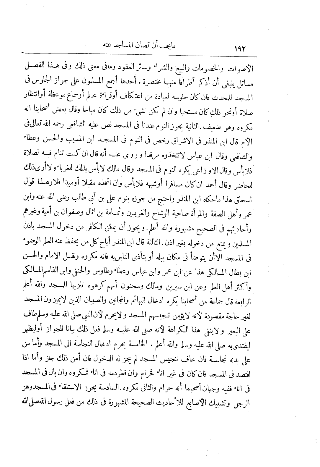 الْأَصْوَاتِ وَالْخُصُومَاتِ وَالْبَيْعِ وَالشِّرَاءِ وَسَائِرِ الْعُقُودِ وَمَا فِي مَعْنَى ذَلِكَ وَفِي هَذَا الْفَصْلِ مَسَائِلُ يَنْبَغِي أَنْ أَذْكُرَ أَطْرَافًا مِنْهَا مُخْتَصَرَةً أَحَدُهَا أَجْمَعَ الْمُسْلِمُونَ عَلَى جَوَازِ الْجُلُوسِ فِي الْمَسْجِدِ لِلْمُحْدِثِ فَإِنْ كَانَ جُلُوسُهُ لِعِبَادَةٍ مِنَ اعْتِكَافٍ أَوْ قِرَاءَةِ عِلْمٍ أَوْ سَمَاعِ مَوْعِظَةٍ أَوِ انْتِظَارِ صَلَاةٍ أَوْ نَحْوِ ذَلِكَ كَانَ مُسْتَحَبًّا وان لم يكن لشئ مِنْ ذَلِكَ كَانَ مُبَاحًا وَقَالَ بَعْضُ أَصْحَابِنَا إِنَّهُ مَكْرُوهٌ وَهُوَ ضَعِيفٌ الثَّانِيَةُ يَجُوزُ النَّوْمُ عِنْدَنَا فِي الْمَسْجِدِ نَصَّ عَلَيْهِ الشَّافِعِيُّ رَحِمَهُ الله تعالى في الأم قال بن الْمُنْذِرِ فِي الْإِشْرَاقِ رَخَّصَ فِي النَّوْمِ فِي المسجد بن المسيب والحسن وعطاء والشافعي وقال بن عباس لاتتخذوه مَرْقَدًا وَرُوِيَ عَنْهُ أَنَّهُ قَالَ إِنْ كُنْتَ تَنَامُ فِيهِ لِصَلَاةٍ فَلَا بَأْسَ وَقَالَ الْأَوْزَاعِيُّ يُكْرَهُ النَّوْمُ فِي الْمَسْجِدِ وَقَالَ مَالِكٌ لَا بَأْسَ بِذَلِكَ لِلْغُرَبَاءِ وَلَا أَرَى ذَلِكَ لِلْحَاضِرِ وَقَالَ أَحْمَدُ إِنْ كَانَ مُسَافِرًا أَوْ شِبْهَهُ فَلَا بَأْسَ وَإِنِ اتَّخَذَهُ مَقِيلًا أَوْ مَبِيتًا فَلَا وَهَذَا قَوْلُ إِسْحَاقَ هَذَا مَا حَكَاهُ بن الْمُنْذِرِ وَاحْتَجَّ مَنْ جَوَّزَهُ بِنَوْمِ عَلِيِّ بْنِ أَبِي طَالِبٍ رَضِيَ اللَّهُ عَنْهُ وبن عُمَرَ وَأَهْلِ الصُّفَّةِ وَالْمَرْأَةِ صَاحِبَةِ الْوِشَاحِ وَالْغَرِيبِينِ وَثُمَامَةَ بْنِ أُثَالٍ وَصَفْوَانَ بْنِ أُمَيَّةَ وَغَيْرِهِمْ وَأَحَادِيثُهُمْ فِي الصَّحِيحِ مَشْهُورَةٌ وَاللَّهُ أَعْلَمُ وَيَجُوزُ أَنْ يُمَكَّنَ الْكَافِرُ مِنْ دُخُولِ الْمَسْجِدِ بِإِذْنِ الْمُسْلِمِينَ وَيُمْنَعُ مِنْ دُخُولِهِ بِغَيْرِ إِذْنٍ الثَّالِثَةُ قال بن الْمُنْذِرِ أَبَاحَ كُلُّ مَنْ يُحْفَظُ عَنْهُ الْعِلْمُ الْوُضُوءَ فِي الْمَسْجِدِ إِلَّا أَنْ يَتَوَضَّأَ فِي مَكَانٍ يَبُلُّهُ أَوْ يَتَأَذَّى النَّاسُ بِهِ فَإِنَّهُ مَكْرُوهٌ وَنَقَلَ الْإِمَامُ وَالْحَسَنُ بْنُ بَطَّالٍ الْمَالِكِيُّ هذا عن بن عمر وبن عباس وعطاء وطاوس والحنفي وبن القاسم المالكي وأكثر أهل العلم وعن بن سِيرِينَ وَمَالِكٍ وَسَحْنُونَ أَنَّهُمْ كَرِهُوهُ تَنْزِيهًا لِلْمَسْجِدِ وَاللَّهُ أَعْلَمُ الرَّابِعَةُ قَالَ جَمَاعَةٌ مِنْ أَصْحَابِنَا يُكْرَهُ إِدْخَالُ الْبَهَائِمِ وَالْمَجَانِينِ وَالصِّبْيَانِ الَّذِينَ لَا يُمَيِّزُونَ الْمَسْجِدَ لِغَيْرِ حَاجَةٍ مَقْصُودَةٍ لِأَنَّهُ لَا يُؤْمَنُ تَنْجِيسُهُمُ الْمَسْجِدَ وَلَا يَحْرُمُ لِأَنَّ النَّبِيَّ صَلَّى اللَّهُ عَلَيْهِ وَسَلَّمَ طَافَ عَلَى الْبَعِيرِ وَلَا يَنْفِي هَذَا الْكَرَاهَةَ لِأَنَّهُ صَلَّى اللَّهُ عَلَيْهِ وَسَلَّمَ فَعَلَ ذَلِكَ بَيَانًا لِلْجَوَازِ أَوْ لِيَظْهَرَ لِيُقْتَدَى بِهِ صَلَّى اللَّهُ عَلَيْهِ وَسَلَّمَ وَاللَّهُ أَعْلَمُ الْخَامِسَةُ يَحْرُمُ إِدْخَالُ النَّجَاسَةِ إِلَى الْمَسْجِدِ وَأَمَّا مَنْ عَلَى بَدَنِهِ نَجَاسَةٌ فَإِنْ خَافَ تَنْجِيسَ الْمَسْجِدِ لَمْ يَجُزْ لَهُ الدُّخُولُ فَإِنْ أَمِنَ ذَلِكَ جَازَ وَأَمَّا إِذَا افْتَصَدَ فِي الْمَسْجِدِ فَإِنْ كَانَ فِي غَيْرِ إِنَاءٍ فَحَرَامٌ وَإِنْ قَطَرَ دَمُهُ فِي إِنَاءٍ فَمَكْرُوهٌ وَإِنْ بَالَ فِي الْمَسْجِدِ فِي إِنَاءٍ فَفِيهِ وَجْهَانِ أَصَحُّهُمَا أَنَّهُ حَرَامٌ وَالثَّانِي مَكْرُوهٌ السَّادِسَةُ يَجُوزُ الِاسْتِلْقَاءُ فِي الْمَسْجِدِ وَهَزُّ الرِّجْلِ وَتَشْبِيكُ الْأَصَابِعِ لِلْأَحَادِيثِ الصَّحِيحَةِ الْمَشْهُورَةِ فِي ذَلِكَ مِنْ فِعْلِ رَسُولِ اللَّهِ صَلَّى اللَّهُ