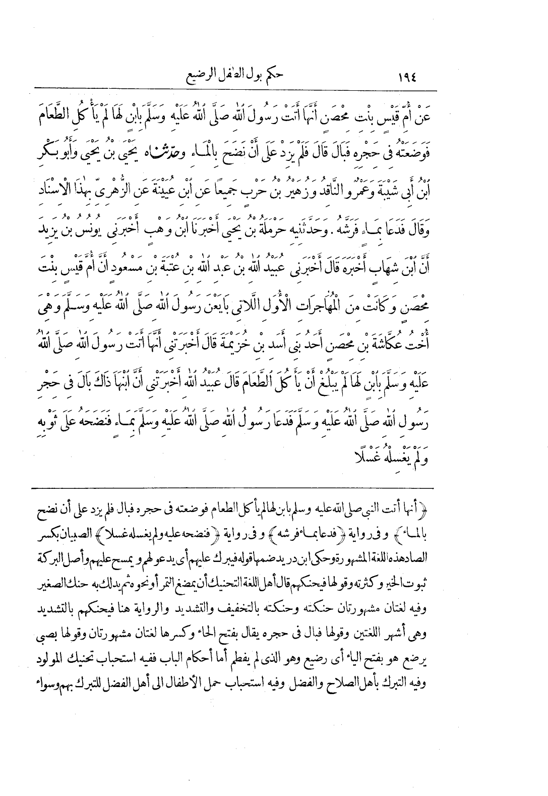 (أَنَّهَا أَتَتِ النَّبِيَّ صَلَّى اللَّهُ عَلَيْهِ وَسَلَّمَ بِابْنٍ لَهَا لَمْ يَأْكُلِ الطَّعَامَ فَوَضَعَتْهُ فِي حِجْرِهِ فَبَالَ فَلَمْ يَزِدْ عَلَى أَنْ نَضَحَ بِالْمَاءِ) وَفِي رِوَايَةٍ (فَدَعَا بِمَاءٍ فَرَشَّهُ) وَفِي رِوَايَةٍ (فَنَضَحَهُ عَلَيْهِ وَلَمْ يَغْسِلْهُ غَسْلًا) الصِّبْيَانُ بكسر الصاد هذه اللغة المشهورة وحكى بن دُرَيْدٍ ضَمَّهَا قَوْلُهُ فَيُبَرِّكُ عَلَيْهِمْ أَيْ يَدْعُو لَهُمْ وَيَمْسَحُ عَلَيْهِمْ وَأَصْلُ الْبَرَكَةِ ثُبُوتُ الْخَيْرِ وَكَثْرَتُهُ وَقَوْلُهَا فَيُحَنِّكُهُمْ قَالَ أَهْلُ اللُّغَةِ التَّحْنِيكُ أَنْ يَمْضُغَ التَّمْرَ أَوْ نَحْوَهُ ثُمَّ يُدَلِّكُ بِهِ حَنَكَ الصَّغِيرِ وَفِيهِ لُغَتَانِ مَشْهُورَتَانِ حَنَّكْتُهُ وَحَنَكْتُهُ بِالتَّخْفِيفِ وَالتَّشْدِيدِ وَالرِّوَايَةُ هُنَا فَيُحَنِّكُهُمْ بِالتَّشْدِيدِ وَهِيَ أَشْهَرُ اللُّغَتَيْنِ وَقَوْلُهَا فَبَالَ فِي حِجْرِهِ يُقَالُ بِفَتْحِ الْحَاءِ وَكَسْرِهَا لُغَتَانِ مَشْهُورَتَانِ وَقَوْلُهَا بِصَبِيٍّ يَرْضَعُ هُوَ بِفَتْحِ الْيَاءِ أَيْ رَضِيعٌ وَهُوَ الَّذِي لَمْ يُفْطَمْ أَمَّا أَحْكَامُ الْبَابِ فَفِيهِ اسْتِحْبَابُ تَحْنِيكِ الْمَوْلُودِ وَفِيهِ التَّبَرُّكُ بِأَهْلِ الصَّلَاحِ وَالْفَضْلِ وَفِيهِ اسْتِحْبَابُ حَمْلِ الْأَطْفَالِ إِلَى أَهْلِ الْفَضْلِ لِلتَّبَرُّكِ بِهِمْ وَسَوَاءٌ