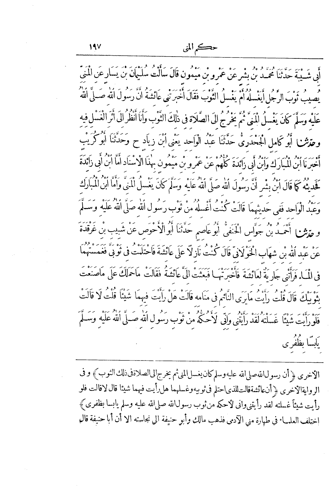 الْأُخْرَى (أَنَّ رَسُولَ اللَّهِ صَلَّى اللَّهُ عَلَيْهِ وَسَلَّمَ كَانَ يَغْسِلُ الْمَنِيَّ ثُمَّ يَخْرُجُ إِلَى الصَّلَاةِ فِي ذَلِكَ الثَّوْبِ) وَفِي الرِّوَايَةِ الْأُخْرَى (أَنَّ عَائِشَةَ قَالَتْ لِلَّذِي احْتَلَمَ فِي ثَوْبَيْهِ وَغَسَلَهُمَا هَلْ رَأَيْتَ فِيهِمَا شَيْئًا قَالَ لَا قَالَتْ فَلَوْ رَأَيْتَ شَيْئًا غَسَلْتَهُ لَقَدْ رَأَيْتُنِي وَإِنِّي لَأَحُكُّهُ مِنْ ثَوْبِ رَسُولِ اللَّهِ صَلَّى اللَّهُ عَلَيْهِ وَسَلَّمَ يَابِسًا بِظُفْرِي) اخْتَلَفَ الْعُلَمَاءُ فِي طَهَارَةِ مِنِّيِ الْآدَمِيِّ فَذَهَبَ مَالِكٌ وَأَبُو حنيفة إلى نجاسته الاان أَبَا حَنِيفَةَ قَالَ