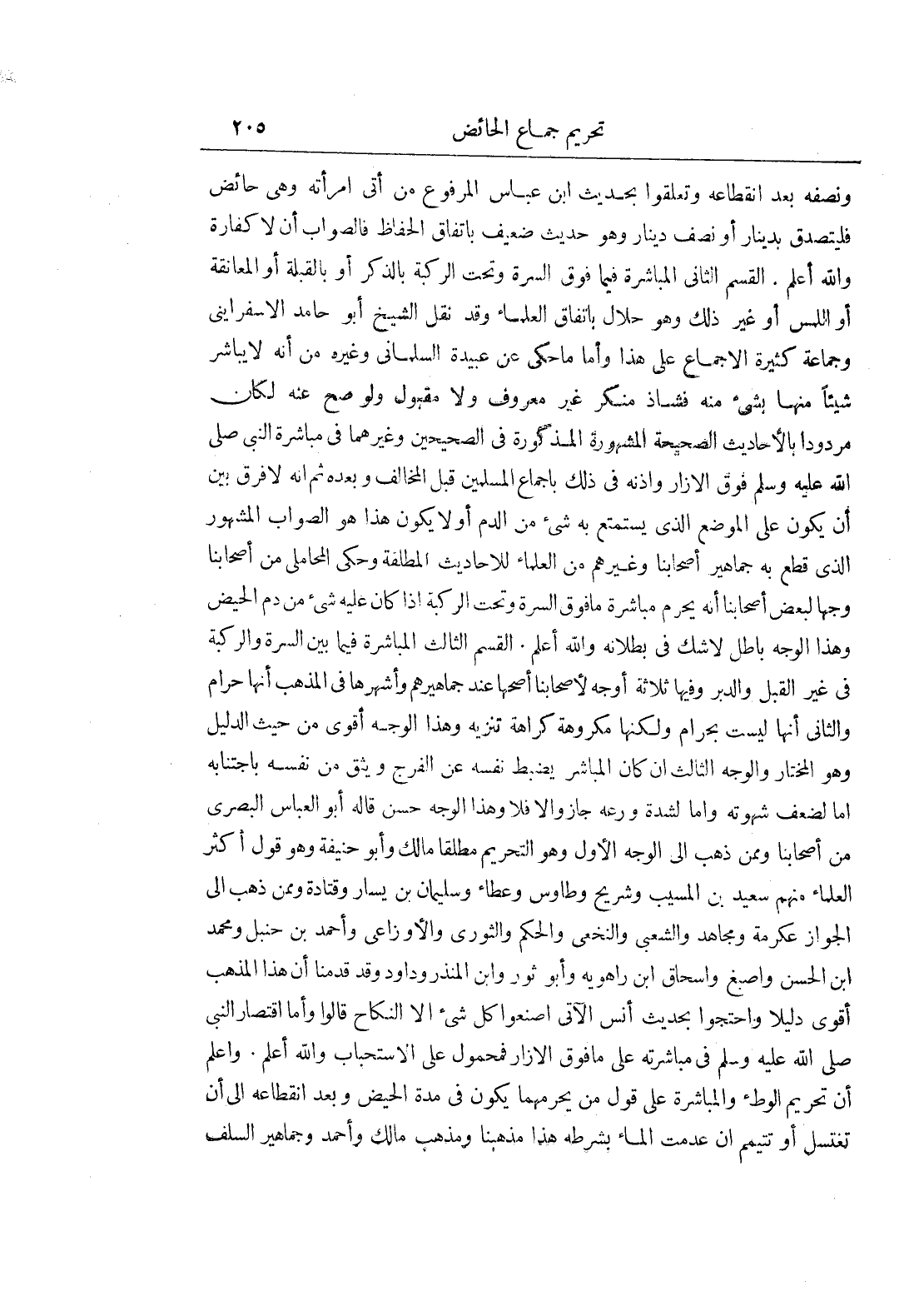 ونصفه بعد انقطاعه وتعلقوا بحديث بن عَبَّاسٍ الْمَرْفُوعِ مَنْ أَتَى امْرَأَتَهُ وَهِيَ حَائِضٌ فَلْيَتَصَدَّقْ بِدِينَارٍ أَوْ نِصْفِ دِينَارٍ وَهُوَ حَدِيثٌ ضعيف باتفاق الحفاظ فالصواب ألا كَفَّارَةَ وَاللَّهُ أَعْلَمُ الْقِسْمُ الثَّانِي الْمُبَاشَرَةُ فِيمَا فَوْقَ السُّرَّةِ وَتَحْتَ الرُّكْبَةِ بِالذَّكَرِ أَوْ بِالْقُبْلَةِ أَوِ الْمُعَانَقَةِ أَوِ اللَّمْسِ أَوْ غَيْرَ ذَلِكَ وَهُوَ حَلَالٌ بِاتِّفَاقِ الْعُلَمَاءِ وَقَدْ نَقَلَ الشَّيْخُ أبو حامد الاسفراينى وَجَمَاعَةٌ كَثِيرَةٌ الْإِجْمَاعَ عَلَى هَذَا وَأَمَّا مَا حُكِيَ عَنْ عُبَيْدَةَ السَّلْمَانِيِّ وَغَيْرِهِ مِنْ أَنَّهُ لا يباشر شيئا منها بشئ مِنْهُ فَشَاذٌّ مُنْكَرٌ غَيْرُ مَعْرُوفٍ وَلَا مَقْبُولٍ وَلَوْ صَحَّ عَنْهُ لَكَانَ مَرْدُودًا بِالْأَحَادِيثِ الصَّحِيحَةِ الْمَشْهُورَةِ الْمَذْكُورَةِ فِي الصَّحِيحَيْنِ وَغَيْرِهِمَا فِي مُبَاشَرَةِ النَّبِيِّ صَلَّى اللَّهُ عَلَيْهِ وَسَلَّمَ فَوْقَ الْإِزَارِ وَإِذْنِهِ فِي ذَلِكَ بِإِجْمَاعِ الْمُسْلِمِينَ قَبْلَ الْمُخَالِفِ وَبَعْدَهُ ثُمَّ إِنَّهُ لَا فَرْقَ بَيْنَ أَنْ يكون على الموضع الذى يستمتع به شئ مِنَ الدَّمِ أَوْ لَا يَكُونَ هَذَا هُوَ الصَّوَابُ الْمَشْهُورُ الَّذِي قَطَعَ بِهِ جَمَاهِيرُ أَصْحَابِنَا وَغَيْرُهُمْ مِنَ الْعُلَمَاءِ لِلْأَحَادِيثِ الْمُطْلَقَةِ وَحَكَى الْمُحَامِلِيُّ مِنْ أَصْحَابِنَا وَجْهًا لِبَعْضِ أَصْحَابِنَا أَنَّهُ يَحْرُمُ مُبَاشَرَةُ مَا فَوْقَ السُّرَّةِ وَتَحْتَ الرُّكْبَةِ إِذَا كان عليه شئ مِنْ دَمِ الْحَيْضِ وَهَذَا الْوَجْهُ بَاطِلٌ لَا شَكَّ فِي بُطْلَانِهِ وَاللَّهُ أَعْلَمُ الْقِسْمُ الثَّالِثُ الْمُبَاشَرَةُ فِيمَا بَيْنَ السُّرَّةِ وَالرُّكْبَةِ فِي غَيْرِ الْقُبُلِ وَالدُّبُرِ وَفِيهَا ثَلَاثَةُ أَوْجُهٍ لِأَصْحَابِنَا أَصَحُّهَا عند جماهيرهم وأشهرها فِي الْمَذْهَبِ أَنَّهَا حَرَامٌ وَالثَّانِي أَنَّهَا لَيْسَتْ بِحَرَامٍ وَلَكِنَّهَا مَكْرُوهَةٌ كَرَاهَةَ تَنْزِيهٍ وَهَذَا الْوَجْهُ أَقْوَى مِنْ حَيْثُ الدَّلِيلُ وَهُوَ الْمُخْتَارُ وَالْوَجْهُ الثَّالِثُ إِنْ كَانَ الْمُبَاشِرُ يَضْبِطُ نَفْسَهُ عَنِ الْفَرْجِ وَيَثِقُ مِنْ نَفْسِهِ بِاجْتِنَابِهِ إِمَّا لِضَعْفِ شَهْوَتِهِ وَإِمَّا لِشِدَّةِ وَرَعِهِ جَازَ وَإِلَّا فَلَا وهذا الوجه حسن قاله أبوالعباس الْبَصْرِيُّ مِنْ أَصْحَابِنَا وَمِمَّنْ ذَهَبَ إِلَى الْوَجْهِ الْأَوَّلِ وَهُوَ التَّحْرِيمُ مُطْلَقًا مَالِكٌ وَأَبُو حَنِيفَةَ وَهُوَ قَوْلُ أَكْثَرِ الْعُلَمَاءِ مِنْهُمْ سَعِيدُ بْنُ الْمُسَيَّبِ وَشُرَيْحٌ وَطَاوُسٌ وَعَطَاءٌ وَسُلَيْمَانُ بْنُ يَسَارٍ وَقَتَادَةُ وَمِمَّنْ ذَهَبَ إِلَى الْجَوَازِ عِكْرِمَةُ وَمُجَاهِدٌ وَالشَّعْبِيُّ وَالنَّخَعِيُّ وَالْحَكَمُ وَالثَّوْرِيُّ وَالْأَوْزَاعِيُّ وَأَحْمَدُ بْنُ حَنْبَلٍ وَمُحَمَّدُ بْنُ الْحَسَنِ وَأَصْبَغُ وَإِسْحَاقُ بْنُ راهويه وأبو ثور وبن الْمُنْذِرِ وَدَاوُدُ وَقَدْ قَدَّمْنَا أَنَّ هَذَا الْمَذْهَبَ أَقْوَى دَلِيلًا وَاحْتَجُّوا بِحَدِيثِ أَنَسٍ الْآتِي اصْنَعُوا كل شئ إِلَّا النِّكَاحَ قَالُوا وَأَمَّا اقْتِصَارُ النَّبِيِّ صَلَّى اللَّهُ عَلَيْهِ وَسَلَّمَ فِي مُبَاشَرَتِهِ عَلَى مَا فَوْقَ الْإِزَارِ فَمَحْمُولٌ عَلَى الِاسْتِحْبَابِ وَاللَّهُ أَعْلَمُ وَاعْلَمْ أَنَّ تَحْرِيمَ الْوَطْءِ وَالْمُبَاشَرَةِ عَلَى قَوْلِ مَنْ يُحَرِّمُهُمَا يَكُونُ فِي مُدَّةِ الْحَيْضِ وَبَعْدَ انْقِطَاعِهِ إِلَى أَنْ تَغْتَسِلَ أَوْ تَتَيَمَّمَ إِنْ عَدِمَتِ الْمَاءَ بِشَرْطِهِ هَذَا مَذْهَبُنَا وَمَذْهَبُ مَالِكٍ وَأَحْمَدَ وَجَمَاهِيرِ السَّلَفِ
