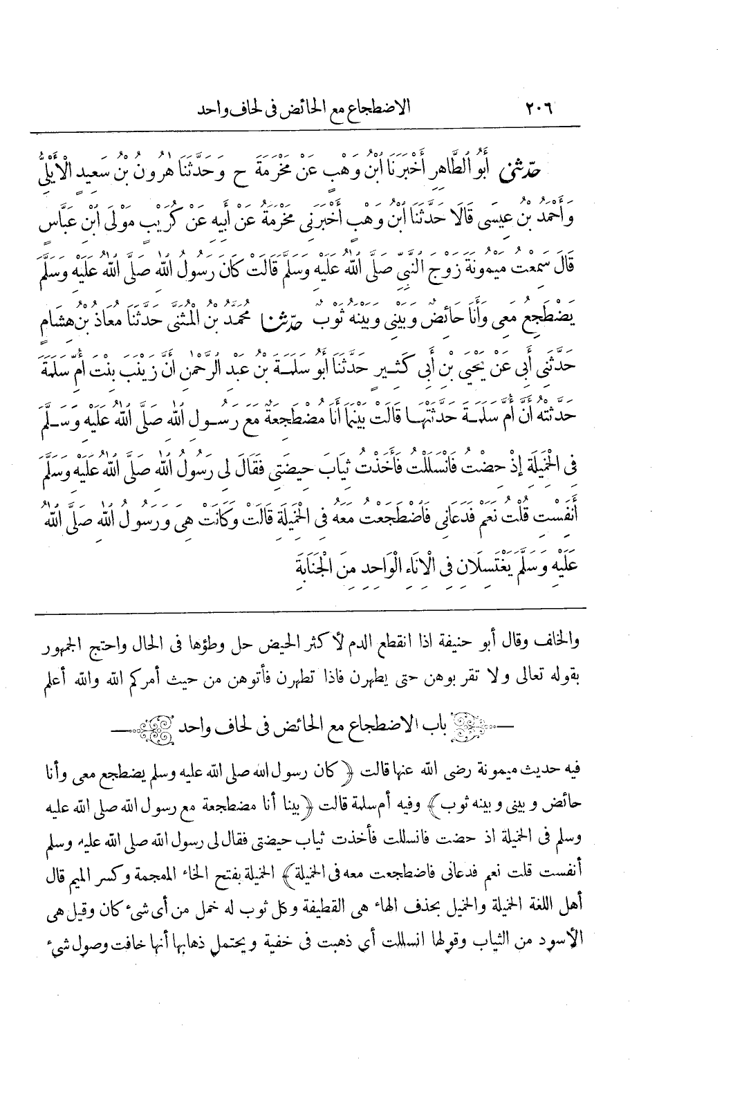فيه حَدِيثُ مَيْمُونَةَ رَضِيَ اللَّهُ عَنْهَا قَالَتْ (كَانَ رَسُولُ اللَّهِ صَلَّى اللَّهُ عَلَيْهِ وَسَلَّمَ يَضْطَجِعُ مَعِي وَأَنَا حَائِضٌ وَبَيْنِي وَبَيْنَهُ ثَوْبٌ) وَفِيهِ أُمُّ سَلَمَةَ قَالَتْ (بَيْنَا أَنَا مُضْطَجِعَةٌ مَعَ رَسُولِ اللَّهِ صَلَّى اللَّهُ عَلَيْهِ وَسَلَّمَ في الْخَمِيلَةِ إِذْ حِضْتُ فَانْسَلَلْتُ فَأَخَذْتُ ثِيَابَ حِيضَتِي فَقَالَ لِي رَسُولُ اللَّهِ صَلَّى اللَّهُ عَلَيْهِ وَسَلَّمَ أَنَفِسْتِ قُلْتُ نَعَمْ فَدَعَانِي فَاضْطَجَعْتُ مَعَهُ فِي الْخَمِيلَةِ) الْخَمِيلَةُ بِفَتْحِ الْخَاءِ الْمُعْجَمَةِ وَكَسْرِ الْمِيمِ قَالَ أَهْلُ اللُّغَةِ الْخَمِيلَةُ وَالْخَمِيلُ بِحَذْفِ الْهَاءِ هِيَ الْقَطِيفَةُ وَكُلُّ ثَوْبٍ لَهُ خَمْلٌ من أى شئ كَانَ وَقِيلَ هِيَ الْأَسْوَدُ مِنَ الثِّيَابِ وَقَوْلُهَا انْسَلَلْتُ أَيْ ذَهَبْتُ فِي خُفْيَةٍ وَيَحْتَمِلُ ذَهَابُهَا أنها خافت وصول شئ