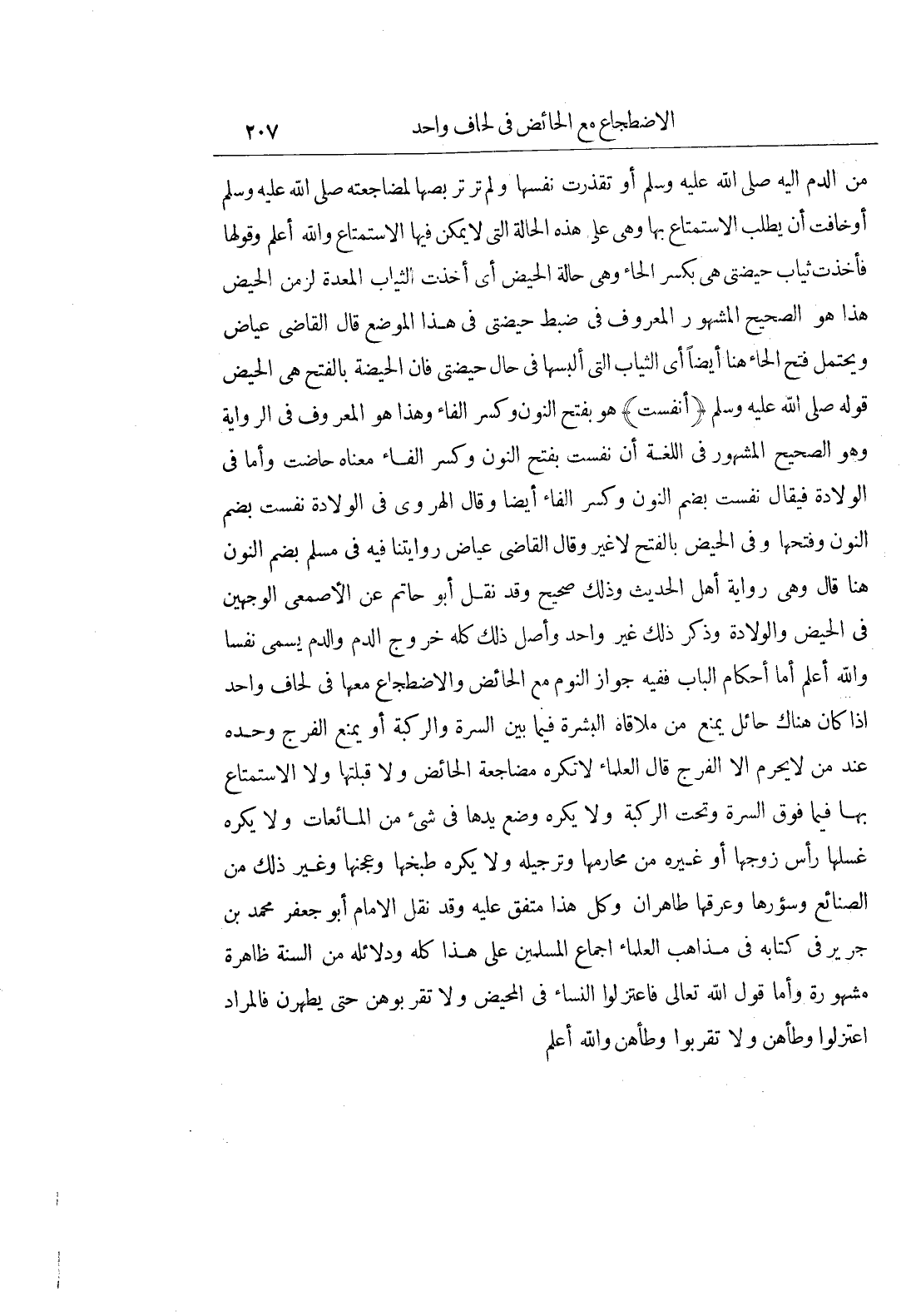 مِنَ الدَّمِ إِلَيْهِ صَلَّى اللَّهُ عَلَيْهِ وَسَلَّمَ أو تقذرت نفسها ولم ترتربصها لِمُضَاجَعَتِهِ صَلَّى اللَّهُ عَلَيْهِ وَسَلَّمَ أَوْ خَافَتْ أَنْ يَطْلُبَ الِاسْتِمْتَاعَ بِهَا وَهِيَ عَلَى هَذِهِ الْحَالَةِ الَّتِي لَا يُمْكِنُ فِيهَا الِاسْتِمْتَاعُ وَاللَّهُ أَعْلَمُ وَقَوْلُهَا فَأَخَذْتُ ثِيَابَ حِيضَتِي هِيَ بِكَسْرِ الْحَاءِ وَهِيَ حَالَةُ الْحَيْضِ أَيْ أَخَذْتُ الثِّيَابَ الْمُعَدَّةَ لِزَمَنِ الْحَيْضِ هَذَا هُوَ الصَّحِيحُ الْمَشْهُورُ الْمَعْرُوفُ فِي ضَبْطِ حِيضَتِي فِي هَذَا الْمَوْضِعِ قَالَ الْقَاضِي عِيَاضٌ وَيُحْتَمَلُ فَتْحُ الْحَاءِ هُنَا أَيْضًا أَيِ الثِّيَابُ الَّتِي أَلْبَسُهَا فِي حَالِ حِيضَتِي فَإِنَّ الْحَيْضَةَ بِالْفَتْحِ هِيَ الْحَيْضُ قَوْلُهُ صَلَّى اللَّهُ عَلَيْهِ وَسَلَّمَ (أَنَفِسْتِ) هُوَ بِفَتْحِ النُّونِ وَكَسْرِ الْفَاءِ وَهَذَا هُوَ الْمَعْرُوفُ فِي الرِّوَايَةِ وَهُوَ الصَّحِيحُ الْمَشْهُورُ فِي اللُّغَةِ أَنَّ نَفِسْتِ بِفَتْحِ النُّونِ وَكَسْرِ الْفَاءِ مَعْنَاهُ حَاضَتْ وَأَمَّا فِي الْوِلَادَةِ فَيُقَالُ نَفُسَتْ بِضَمِّ النُّونِ وَكَسْرِ الْفَاءِ أَيْضًا وَقَالَ الْهَرَوِيُّ فِي الْوِلَادَةِ نَفُسَتْ بِضَمِّ النُّونِ وَفَتْحِهَا وَفِي الْحَيْضِ بِالْفَتْحِ لَا غَيْرُ وَقَالَ الْقَاضِي عِيَاضٌ رِوَايَتُنَا فِيهِ فِي مُسْلِمٍ بِضَمِّ النُّونِ هُنَا قَالَ وَهِيَ رِوَايَةُ أَهْلِ الْحَدِيثِ وَذَلِكَ صَحِيحٌ وَقَدْ نَقَلَ أَبُو حَاتِمٍ عَنِ الْأَصْمَعِيِّ الْوَجْهَيْنِ فِي الْحَيْضِ وَالْوِلَادَةِ وَذَكَرَ ذَلِكَ غَيْرُ وَاحِدٍ وَأَصْلُ ذَلِكَ كُلِّهِ خُرُوجُ الدَّمِ وَالدَّمُ يُسَمَّى نَفَسًا وَاللَّهُ أَعْلَمُ وَأَمَّا أَحْكَامُ الْبَابِ فَفِيهِ جَوَازُ النَّوْمِ مَعَ الْحَائِضِ وَالِاضْطِجَاعِ مَعَهَا فِي لِحَافٍ وَاحِدٍ إِذَا كَانَ هُنَاكَ حَائِلٌ يَمْنَعُ مِنْ مُلَاقَاةِ الْبَشَرَةِ فِيمَا بَيْنَ السُّرَّةِ وَالرُّكْبَةِ أَوْ يَمْنَعُ الْفَرْجَ وَحْدَهُ عِنْدَ مَنْ لَا يُحَرِّمُ إِلَّا الْفَرْجَ قَالَ الْعُلَمَاءُ لَا تُكْرَهُ مُضَاجَعَةُ الْحَائِضِ وَلَا قُبْلَتُهَا وَلَا الِاسْتِمْتَاعُ بِهَا فِيمَا فَوْقَ السُّرَّةِ وَتَحْتَ الرُّكْبَةِ وَلَا يُكْرَهُ وَضْعُ يَدِهَا في شئ مِنَ الْمَائِعَاتِ وَلَا يُكْرَهُ غَسْلُهَا رَأْسَ زَوْجِهَا أَوْ غَيْرَهُ مِنْ مَحَارِمِهَا وَتَرْجِيلُهُ وَلَا يُكْرَهُ طَبْخُهَا وَعَجْنُهَا وَغَيْرُ ذَلِكَ مِنَ الصَّنَائِعِ وَسُؤْرُهَا وَعَرَقُهَا طَاهِرَانِ وَكُلُّ هَذَا مُتَّفَقٌ عَلَيْهِ وَقَدْ نَقَلَ الْإِمَامُ أَبُو جَعْفَرٍ مُحَمَّدُ بْنُ جَرِيرٍ فِي كِتَابِهِ فِي مَذَاهِبِ الْعُلَمَاءِ وَإِجْمَاعِ الْمُسْلِمِينَ عَلَى هَذَا كُلِّهِ وَدَلَائِلُهُ مِنَ السُّنَّةِ ظَاهِرَةٌ مَشْهُورَةٌ وَأَمَّا قَوْلُ اللَّهِ تَعَالَى فَاعْتَزِلُوا النِّسَاءَ في المحيض ولا تقربوهن حتى يطهرن فَالْمُرَادُ اعْتَزِلُوا وَطْأَهُنَّ وَلَا تَقْرَبُوا وَطْأَهُنَّ وَاللَّهُ أعلم