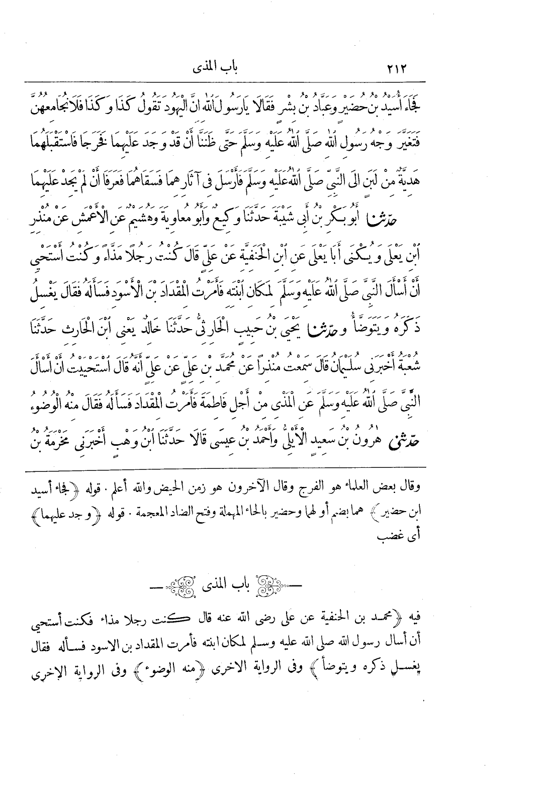 فيه (محمد بن الْحَنَفِيَّةِ عَنْ عَلِيٍّ رَضِيَ اللَّهُ عَنْهُ قَالَ كنت رجلا مذاء فكنت ستحيي أن سَأَلَ رَسُولَ اللَّهِ صَلَّى اللَّهُ عَلَيْهِ وَسَلَّمَ لِمَكَانِ ابْنَتِهِ فَأَمَرْتُ الْمِقْدَادَ بْنَ الْأَسْوَدِ فَسَأَلَهُ فَقَالَ يَغْسِلُ ذَكَرَهُ وَيَتَوَضَّأُ) وَفِي الرِّوَايَةِ الْأُخْرَى (مِنْهُ الْوُضُوءُ) وَفِي الرِّوَايَةِ الْأُخْرَى