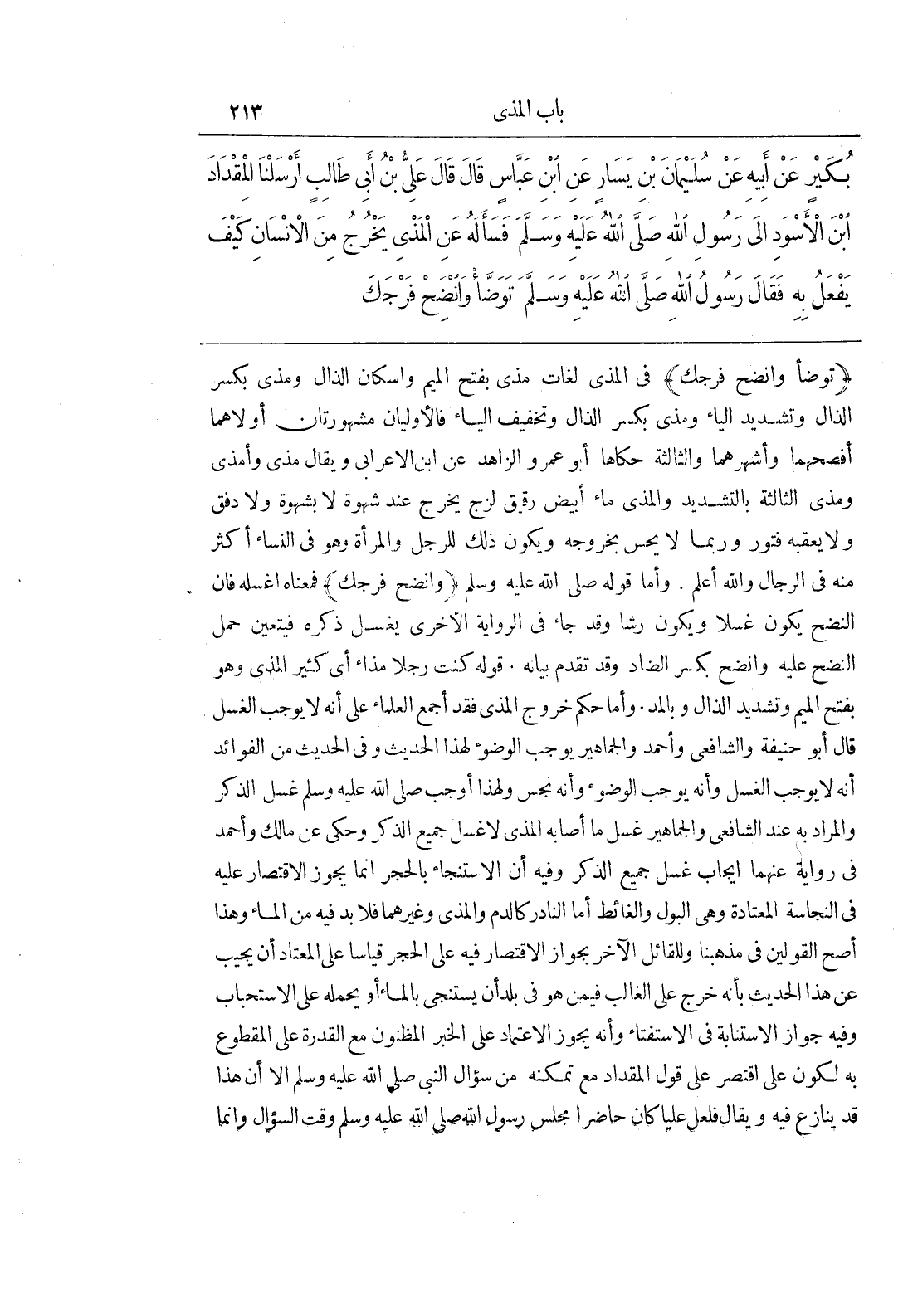 (تَوَضَّأْ وَانْضِحْ فَرْجَكَ) فِي الْمَذْيِ لُغَاتٌ مَذْيٌ بفتح الميم واسكان الذال ومذى بكسر الذال وتشديد الياء ومذى بكسر الذال وتخفيف الياء فالأوليان مشهورتان أولاهما أَفْصَحُهُمَا وَأَشْهَرُهُمَا وَالثَّالِثَةُ حَكَاهَا أَبُو عَمْرٍو الزَّاهِدُ عن بن الاعرابي ويقال مذي وأمذي ومدي الثالثة بالتشديد والمذي ماء أبيض دقيق لَزِجٌ يَخْرُجُ عِنْدَ شَهْوَةٍ لَا بِشَهْوَةٍ وَلَا دَفْقٍ وَلَا يَعْقُبُهُ فُتُورٌ وَرُبَّمَا لَا يُحَسُّ بِخُرُوجِهِ وَيَكُونُ ذَلِكَ لِلرَّجُلِ وَالْمَرْأَةِ وَهُوَ فِي النِّسَاءِ أَكْثَرُ مِنْهُ فِي الرِّجَالِ وَاللَّهُ أَعْلَمُ وَأَمَّا قَوْلُهُ صَلَّى اللَّهُ عَلَيْهِ وَسَلَّمَ (وَانْضِحْ فَرْجَكَ) فَمَعْنَاهُ اغْسِلْهُ فَإِنَّ النَّضْحَ يَكُونُ غَسْلًا وَيَكُونُ رَشًّا وَقَدْ جَاءَ فِي الرِّوَايَةِ الْأُخْرَى يَغْسِلُ ذَكَرَهُ فَيَتَعَيَّنُ حَمْلُ النَّضْحِ عَلَيْهِ وَانْضِحْ بِكَسْرِ الضَّادِ وَقَدْ تَقَدَّمَ بَيَانُهُ قَوْلُهُ كُنْتُ رَجُلًا مَذَّاءً أَيْ كَثِيرَ الْمَذْيِ وَهُوَ بِفَتْحِ الْمِيمِ وَتَشْدِيدِ الذَّالِ وَبِالْمَدِّ وَأَمَّا حُكْمُ خُرُوجِ الْمَذْيِ فَقَدْ أَجْمَعَ الْعُلَمَاءُ عَلَى أَنَّهُ لَا يُوجِبُ الْغُسْلَ قَالَ أَبُو حَنِيفَةَ وَالشَّافِعِيُّ وَأَحْمَدُ وَالْجَمَاهِيرُ يُوجِبُ الْوُضُوءَ لِهَذَا الْحَدِيثِ وَفِي الْحَدِيثِ مِنَ الْفَوَائِدِ أَنَّهُ لَا يُوجِبَ الْغُسْلَ وَأَنَّهُ يُوجِبُ الْوُضُوءَ وَأَنَّهُ نَجَسٌ وَلِهَذَا أَوْجَبَ صَلَّى اللَّهُ عَلَيْهِ وَسَلَّمَ غَسْلَ الذَّكَرِ وَالْمُرَادُ بِهِ عِنْدَ الشَّافِعِيِّ وَالْجَمَاهِيرِ غَسْلُ مَا أَصَابَهُ الْمَذْيُ لَا غَسْلُ جَمِيعِ الذَّكَرِ وَحُكِيَ عَنْ مَالِكٍ وَأَحْمَدَ فِي رِوَايَةٍ عَنْهُمَا إِيجَابُ غَسْلِ جَمِيعِ الذَّكَرِ وَفِيهِ أَنَّ الِاسْتِنْجَاءَ بِالْحَجَرِ إِنَّمَا يَجُوزُ الِاقْتِصَارُ عَلَيْهِ فِي النَّجَاسَةِ الْمُعْتَادَةِ وَهِيَ الْبَوْلُ وَالْغَائِطُ أَمَّا النَّادِرُ كَالدَّمِ وَالْمَذْيِ وَغَيْرِهِمَا فَلَا بُدَّ فِيهِ مِنَ الْمَاءِ وَهَذَا أَصَحُّ الْقَوْلَيْنِ في مذهبنا وللقائل الْآخَرُ بِجَوَازِ الِاقْتِصَارِ فِيهِ عَلَى الْحَجَرِ قِيَاسًا عَلَى الْمُعْتَادِ أَنْ يُجِيبَ عَنْ هَذَا الْحَدِيثِ بِأَنَّهُ خُرِّجَ عَلَى الْغَالِبِ فِيمَنْ هُوَ فِي بَلَدٍ أَنْ يَسْتَنْجِيَ بِالْمَاءِ أَوْ يَحْمِلُهُ عَلَى الِاسْتِحْبَابِ وَفِيهِ جَوَازُ الِاسْتِنَابَةِ فِي الِاسْتِفْتَاءِ وَأَنَّهُ يَجُوزُ الِاعْتِمَادُ عَلَى الْخَبَرِ الْمَظْنُونِ مَعَ الْقُدْرَةِ عَلَى الْمَقْطُوعِ بِهِ لِكَوْنِ عَلِيٍّ اقْتَصَرَ عَلَى قَوْلِ الْمِقْدَادِ مَعَ تَمَكُّنِهِ مِنْ سُؤَالِ النَّبِيِّ صَلَّى اللَّهُ عَلَيْهِ وَسَلَّمَ إِلَّا أَنَّ هَذَا قَدْ يُنَازَعُ فِيهِ وَيُقَالُ فَلَعَلَّ عَلِيًّا كَانَ حَاضِرًا مَجْلِسَ رَسُولِ اللَّهِ صَلَّى اللَّهُ عَلَيْهِ وَسَلَّمَ وَقْتَ السُّؤَالِ وَإِنَّمَا