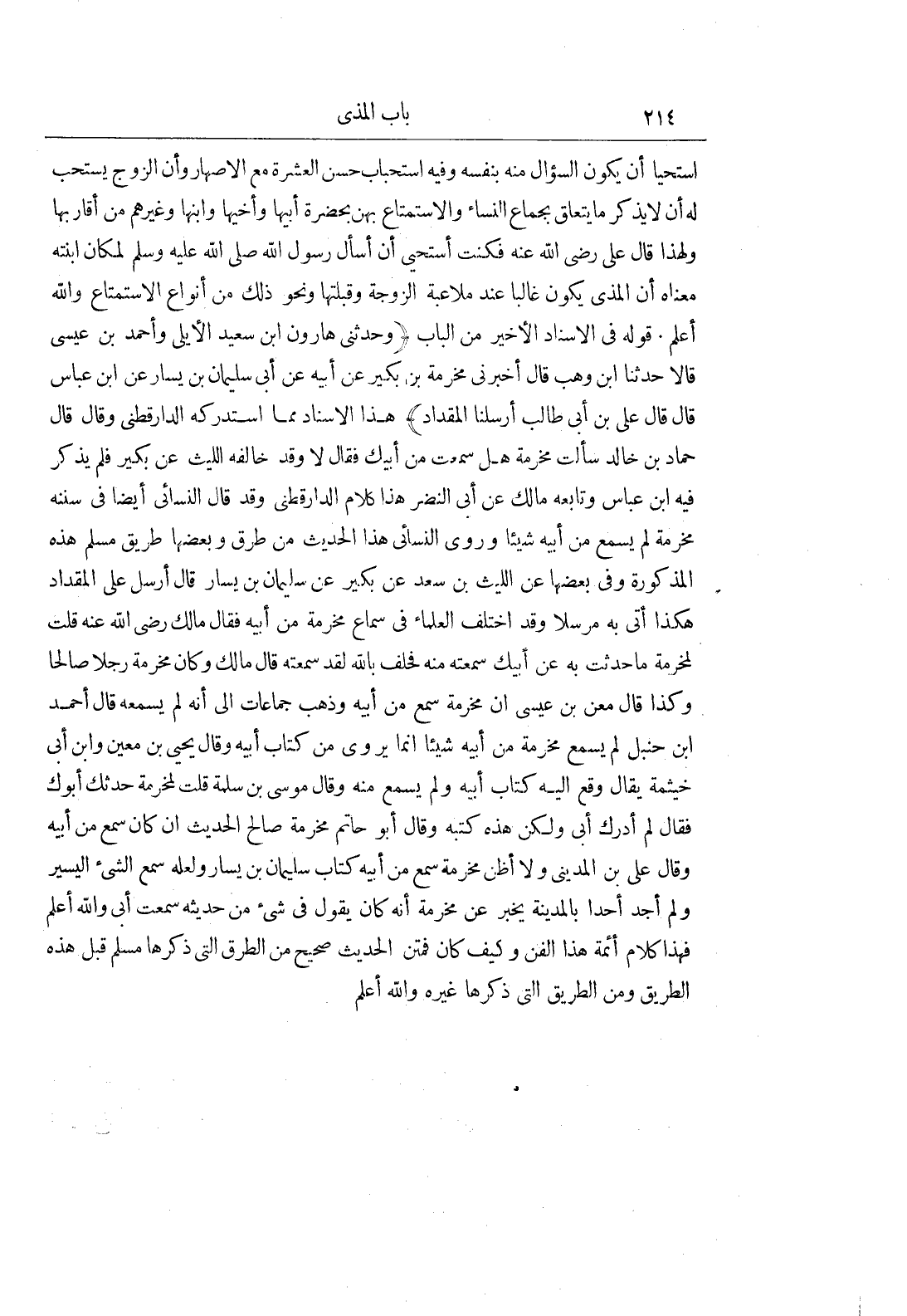 اسْتَحْيَا أَنْ يَكُونَ السُّؤَالُ مِنْهُ بِنَفْسِهِ وَفِيهِ اسْتِحْبَابُ حُسْنِ الْعِشْرَةِ مَعَ الْأَصْهَارِ وَأَنَّ الزَّوْجَ يستحب له أن لا يذكر بِجِمَاعِ النِّسَاءِ وَالِاسْتِمْتَاعِ بِهِنَّ بِحَضْرَةِ أَبِيهَا وَأَخِيهَا وَابْنِهَا وَغَيْرِهِمْ مِنْ أَقَارِبِهَا وَلِهَذَا قَالَ عَلِيٌّ رَضِيَ اللَّهُ عَنْهُ فَكُنْتُ أَسْتَحْيِي أَنْ أَسْأَلَ رَسُولَ اللَّهِ صَلَّى اللَّهُ عَلَيْهِ وَسَلَّمَ لِمَكَانِ ابْنَتِهِ مَعْنَاهُ أَنَّ الْمَذْيَ يَكُونُ غَالِبًا عِنْدَ مُلَاعَبَةِ الزَّوْجَةِ وَقُبْلَتِهَا وَنَحْوِ ذَلِكَ مِنْ أَنْوَاعِ الِاسْتِمْتَاعِ وَاللَّهُ أَعْلَمُ قَوْلُهُ فِي الْإِسْنَادِ الْأَخِيرِ مِنَ الْبَابِ (وَحَدَّثَنِي هَارُونُ بْنُ سَعِيدٍ الْأَيْلِيُّ وأحمد بن عيسى قالا حدثنا بن وَهْبٍ قَالَ أَخْبَرَنِي مَخْرَمَةُ بْنُ بُكَيْرٍ عَنْ أَبِيهِ عَنْ أَبِي سليمان بن يسار عن بن عَبَّاسٍ قَالَ قَالَ عَلِيُّ بْنُ أَبِي طَالِبٍ أَرْسَلْنَا الْمِقْدَادُ) هَذَا الْإِسْنَادُ مِمَّا اسْتَدْرَكَهُ الدَّارَقُطْنِيُّ وَقَالَ قَالَ حَمَّادُ بْنُ خَالِدٍ سَأَلْتُ مَخْرَمَةَ هَلْ سَمِعْتَ مِنْ أَبِيكَ فَقَالَ لَا وَقَدْ خَالَفَهُ اللَّيْثُ عَنْ بُكَيْرٍ فَلَمْ يَذْكُرْ فِيهِ بن عَبَّاسٍ وَتَابَعَهُ مَالِكٌ عَنْ أَبِي النَّضْرِ هَذَا كَلَامُ الدَّارَقُطْنِيِّ وَقَدْ قَالَ النَّسَائِيُّ أَيْضًا فِي سُنَنِهِ مَخْرَمَةُ لَمْ يَسْمَعْ مِنْ أَبِيهِ شَيْئًا وَرَوَى النَّسَائِيُّ هَذَا الْحَدِيثَ مِنْ طُرُقٍ وَبَعْضُهَا طَرِيقُ مُسْلِمٍ هَذِهِ الْمَذْكُورَةُ وَفِي بَعْضِهَا عَنِ اللَّيْثِ بْنِ سَعْدٍ عَنْ بُكَيْرٍ عَنْ سُلَيْمَانَ بْنِ يَسَارٍ قَالَ أَرْسَلَ عَلِيٌّ الْمِقْدَادَ هَكَذَا أَتَى بِهِ مُرْسَلًا وَقَدِ اخْتَلَفَ الْعُلَمَاءُ فِي سَمَاعِ مَخْرَمَةَ مِنْ أَبِيهِ فَقَالَ مَالِكٌ رَضِيَ اللَّهُ عَنْهُ قُلْتُ لِمَخْرَمَةَ مَا حَدَّثْتَ بِهِ عَنْ أَبِيكَ سَمِعْتَهُ مِنْهُ فَحَلَفَ بِاللَّهِ لَقَدْ سَمِعْتُهُ قَالَ مَالِكٌ وَكَانَ مَخْرَمَةُ رَجُلًا صَالِحًا وَكَذَا قَالَ مَعْنُ بْنُ عِيسَى إِنَّ مَخْرَمَةَ سَمِعَ مِنْ أَبِيهِ وَذَهَبَ جَمَاعَاتٌ إِلَى أَنَّهُ لَمْ يَسْمَعْهُ قَالَ أَحْمَدُ بْنُ حَنْبَلٍ لَمْ يَسْمَعْ مَخْرَمَةُ مِنْ أَبِيهِ شَيْئًا إِنَّمَا يَرْوِي من كتاب أبيه وقال يحيىبن معين وبن أَبِي خَيْثَمَةَ يُقَالُ وَقَعَ إِلَيْهِ كِتَابُ أَبِيهِ وَلَمْ يَسْمَعْ مِنْهُ وَقَالَ مُوسَى بْنُ سَلَمَةَ قُلْتُ لِمَخْرَمَةَ حَدَّثَكَ أَبُوكَ فَقَالَ لَمْ أُدْرِكْ أَبِي وَلَكِنْ هَذِهِ كُتُبُهُ وَقَالَ أَبُو حَاتِمٍ مَخْرَمَةُ صَالِحُ الْحَدِيثِ إِنْ كَانَ سَمِعَ مِنْ أَبِيهِ وَقَالَ عَلِيُّ بْنُ الْمَدِينِيِّ وَلَا أَظُنُّ مَخْرَمَةَ سَمِعَ مِنْ أَبِيهِ كِتَابَ سُلَيْمَانَ بْنِ يسار ولعله سمع الشئ الْيَسِيرَ وَلَمْ أَجِدْ أَحَدًا بِالْمَدِينَةِ يُخْبِرُ عَنْ مخرمة أنه كان يقول في شئ مِنْ حَدِيثِهِ سَمِعْتُ أَبِي وَاللَّهُ أَعْلَمُ فَهَذَا كَلَامُ أَئِمَّةِ هَذَا الْفَنِّ وَكَيْفَ كَانَ فَمَتْنُ الْحَدِيثِ صَحِيحٌ مِنَ الطُّرُقِ الَّتِي ذَكَرَهَا مُسْلِمٌ قيل هَذِهِ الطَّرِيقِ وَمِنَ الطَّرِيقِ الَّتِي ذَكَرَهَا غَيْرُهُ والله أعلم