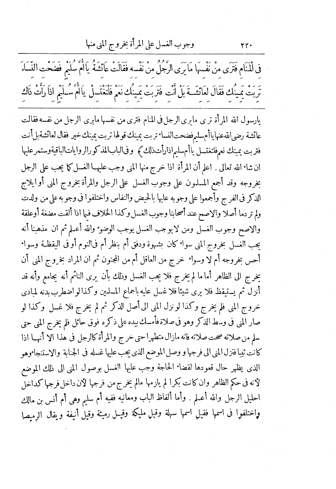 يَا رَسُولَ اللَّهِ الْمَرْأَةُ تَرَى مَا يَرَى الرَّجُلُ فِي الْمَنَامِ فَتَرَى مِنْ نَفْسِهَا مَا يَرَى الرَّجُلُ مِنْ نَفْسِهِ فَقَالَتْ عَائِشَةُ رَضِيَ اللَّهُ عَنْهَا يَا أُمَّ سُلَيْمٍ فَضَحْتِ النِّسَاءَ تَرِبَتْ يَمِينُكِ قَوْلُهَا تَرِبَتْ يَمِينُكِ خَيْرٌ فَقَالَ لِعَائِشَةَ بَلْ أَنْتِ فَتَرِبَتْ يَمِينُكِ نَعَمْ فَلْتَغْتَسِلْ يَا أُمَّ سُلَيْمٍ إِذَا رَأَتْ ذَلِكَ) وَفِي الْبَابِ الْمَذْكُورِ الرِّوَايَاتُ الْبَاقِيَةُ وَسَتَمُرَّ عَلَيْهَا إِنْ شَاءَ اللَّهِ تَعَالَى اعْلَمْ أَنَّ الْمَرْأَةَ إِذَا خَرَجَ مِنْهَا الْمَنِيُّ وَجَبَ عَلَيْهَا الْغُسْلُ كَمَا يَجِبُ عَلَى الرَّجُلِ بِخُرُوجِهِ وَقَدْ أَجْمَعَ الْمُسْلِمُونَ عَلَى وُجُوبِ الْغُسْلِ عَلَى الرَّجُلِ وَالْمَرْأَةِ بِخُرُوجِ الْمَنِيِّ أَوْ إِيلَاجِ الذَّكَرِ فِي الْفَرْجِ وَأَجْمَعُوا عَلَى وُجُوبِهِ عَلَيْهَا بِالْحَيْضِ وَالنِّفَاسِ وَاخْتَلَفُوا فِي وُجُوبِهِ عَلَى مَنْ وَلَدَتْ وَلَمْ تَرَ دَمًا أَصْلًا وَالْأَصَحُّ عِنْدَ أَصْحَابِنَا وُجُوبُ الْغُسْلِ وَكَذَا الْخِلَافُ فِيمَا إِذَا أَلْقَتْ مُضْغَةً أَوْ عَلَقَةً وَالْأَصَحُّ وُجُوبُ الْغُسْلِ وَمَنْ لَا يُوجِبُ الْغُسْلَ يُوجِبُ الْوُضُوءَ وَاللَّهُ أَعْلَمُ ثُمَّ إِنَّ مَذْهَبَنَا أَنَّهُ يَجِبُ الْغُسْلَ بِخُرُوجِ الْمَنِيِّ سَوَاءٌ كَانَ بِشَهْوَةٍ وَدَفْقٍ أَمْ بِنَظَرٍ أَمْ فِي النَّوْمِ أَوْ فِي الْيَقَظَةِ وَسَوَاءٌ أَحَسَّ بِخُرُوجِهِ أَمْ لَا وَسَوَاءٌ خَرَجَ مِنَ الْعَاقِلِ أَمْ مِنَ الْمَجْنُونِ ثُمَّ إِنَّ الْمُرَادَ بِخُرُوجِ الْمَنِيِّ أَنْ يَخْرُجَ إِلَى الظَّاهِرِ أَمَّا مَا لَمْ يَخْرُجْ فَلَا يَجِبُ الْغُسْلُ وَذَلِكَ بِأَنْ يَرَى النَّائِمُ أَنَّهُ يُجَامِعُ وَأَنَّهُ قَدْ أَنْزَلَ ثُمَّ يَسْتَيْقِظُ فَلَا يَرَى شَيْئًا فَلَا غُسْلَ عَلَيْهِ بِإِجْمَاعِ المسلمين وكذا لو اضطرب بدنه لمبادى خُرُوجِ الْمَنِيِّ فَلَمْ يَخْرُجْ وَكَذَا لَوْ نَزَلَ الْمَنِيُّ إِلَى أَصْلِ الذَّكَرِ ثُمَّ لَمْ يَخْرُجْ فَلَا غُسْلَ وَكَذَا لَوْ صَارَ الْمَنِيُّ فِي وَسَطِ الذَّكَرِ وَهُوَ فِي صَلَاةِ فَأَمْسَكَ بِيَدِهِ عَلَى ذَكَرِهِ فَوْقَ حَائِلٍ فَلَمْ يَخْرُجِ الْمَنِيُّ حَتَّى سَلَّمَ مِنْ صَلَاتِهِ صَحَّتْ صَلَاتُهُ فَإِنَّهُ مازال مُتَطَهِّرًا حَتَّى خَرَجَ وَالْمَرْأَةُ كَالرَّجُلِ فِي هَذَا إِلَّا أَنَّهَا إِذَا كَانَتْ ثَيِّبًا فَنَزَلَ الْمَنِيُّ إِلَى فَرْجِهَا وَوَصَلَ الْمَوْضِعَ الَّذِي يَجِبُ عَلَيْهَا غَسْلُهُ فِي الْجَنَابَةِ وَالِاسْتِنْجَاءِ وَهُوَ الَّذِي يَظْهَرُ حَالَ قُعُودِهَا لِقَضَاءِ الْحَاجَةِ وَجَبَ عَلَيْهَا الْغُسْلُ بوصول المنى إلى ذلك موضع لِأَنَّهُ فِي حُكْمِ الظَّاهِرِ وَإِنْ كَانَتْ بِكْرًا لَمْ يَلْزَمْهَا مَا لَمْ يَخْرُجْ مِنْ فَرْجِهَا لِأَنَّ دَاخِلَ فَرْجِهَا كَدَاخِلِ إِحْلِيلِ الرَّجُلِ وَاللَّهُ أَعْلَمُ وَأَمَّا أَلْفَاظُ الْبَابِ وَمَعَانِيهِ فَفِيهِ أُمُّ سُلَيْمٍ وَهِيَ أُمُّ أَنَسِ بْنِ مَالِكٍ وَاخْتَلَفُوا فِي اسْمِهَا فَقِيلَ اسْمُهَا سَهْلَةُ وَقِيلَ مُلَيْكَةُ وقيل رميثة وقيل أنيفة ويقال الرميضا