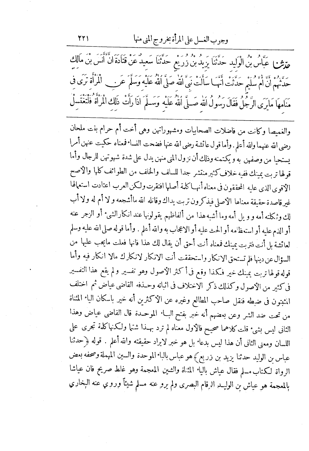 وَالْغُمَيْصَا وَكَانَتْ مِنْ فَاضِلَاتِ الصَّحَابِيَّاتِ وَمَشْهُورَاتِهِنَّ وَهِيَ أُخْتُ أُمِّ حَرَامٍ بِنْتِ مِلْحَانَ رَضِيَ اللَّهُ عَنْهُمَا وَاللَّهُ أَعْلَمُ وَأَمَّا قَوْلُ عَائِشَةَ رَضِيَ الله عنها فضحت النساء فمعناه حَكَيْتِ عَنْهُنَّ أَمْرًا يُسْتَحَيَا مِنْ وَصْفِهِنَّ بِهِ وَيَكْتُمْنَهُ وَذَلِكَ أَنَّ نُزُولَ الْمَنِيِّ مِنْهُنَّ يَدُلُّ عَلَى شِدَّةِ شَهْوَتِهِنَّ لِلرِّجَالِ وَأَمَّا قَوْلُهَا تَرِبَتْ يَمِينُكِ فَفِيهِ خِلَافٌ كَثِيرٌ مُنْتَشِرٌ جِدًّا لِلسَّلَفِ والخلف من الطوائف كلها ولأصح الْأَقْوَى الَّذِي عَلَيْهِ الْمُحَقِّقُونَ فِي مَعْنَاهُ أَنَّهَا كلمة أصلها افتقرت ولكن العرب اعتادت استعماله غَيْرَ قَاصِدَةٍ حَقِيقَةَ مَعْنَاهَا الْأَصْلِيِّ فَيَذْكُرُونَ تَرِبَتْ يَدَاكَ وَقَاتَلَهُ اللَّهُ مَا أَشْجَعَهُ وَلَا أُمَّ لَهُ وَلَا أَبَ لَكَ وَثَكِلَتْهُ أُمُّهُ وَوَيْلُ أمه وما أشبه هذا من ألفاظهم يقولنها عند انكار الشئ أو الزجر عنه أزجر عَنْهُ أَوِ الذَّمِّ عَلَيْهِ أَوِ اسْتِعْظَامِهِ أَوِ الْحَثُّ عَلَيْهِ أَوِ الْإِعْجَابِ بِهِ وَاللَّهُ أَعْلَمُ وَأَمَّا قَوْلُهُ صَلَّى اللَّهُ عَلَيْهِ وَسَلَّمَ لِعَائِشَةَ بَلْ أَنْتِ فَتَرِبَتْ يَمِينُكِ فَمَعْنَاهُ أَنْتِ أَحَقُّ أَنْ يُقَالَ لَكِ هَذَا فَإِنَّهَا فَعَلَتْ مَا يَجِبُ عَلَيْهَا مِنَ السُّؤَالِ عَنْ دِينِهَا فَلَمْ تَسْتَحِقَّ الْإِنْكَارَ وَاسْتَحْقَقْتِ أَنْتِ الْإِنْكَارَ لِإِنْكَارِكِ مَا لا انكار فيه وأما قوله قَوْلُهَا تَرِبَتْ يَمِينُكِ خَيْرٌ فَكَذَا وَقَعَ فِي أَكْثَرِ الْأُصُولِ وَهُوَ تَفْسِيرٌ وَلَمْ يَقَعْ هَذَا التَّفْسِيرُ فِي كَثِيرٍ مِنَ الْأُصُولِ وَكَذَلِكَ ذَكَرَ الِاخْتِلَافَ فِي إِثْبَاتِهِ وَحَذْفِهِ الْقَاضِي عِيَاضٌ ثُمَّ اخْتَلَفَ الْمُثْبِتُونَ فِي ضَبْطِهِ فَنَقَلَ صَاحِبُ الْمَطَالِعِ وَغَيْرُهُ عَنِ الْأَكْثَرِينَ أَنَّهُ خَيْرٌ بِإِسْكَانِ الْيَاءِ الْمُثَنَّاةِ مِنْ تَحْتُ ضِدَّ الشَّرِّ وَعَنْ بَعْضِهِمْ أَنَّهُ خَبَرٌ بِفَتْحِ الْبَاءِ الْمُوَحَّدَةِ قَالَ الْقَاضِي عياض وهذا الثانى ليس بشئ قُلْتُ كِلَاهُمَا صَحِيحٌ فَالْأَوَّلُ مَعْنَاهُ لَمْ تُرِدْ بِهَذَا شَتْمًا وَلَكِنَّهَا كَلِمَةٌ تَجْرِي عَلَى اللِّسَانِ وَمَعْنَى الثَّانِي أَنَّ هَذَا لَيْسَ بِدُعَاءٍ بَلْ هُوَ خَبَرٌ لَا يُرَادُ حَقِيقَتُهُ وَاللَّهُ أَعْلَمُ قَوْلُهُ (حَدَّثَنَا عَبَّاسُ بْنُ الْوَلِيدِ حَدَّثَنَا يَزِيدُ بْنُ زُرَيْعٍ) هُوَ عَبَّاسٌ بِالْبَاءِ الْمُوَحَّدَةِ وَالسِّينِ الْمُهْمَلَةِ وَصَحَّفَهُ بَعْضُ الرُّوَاةِ لِكِتَابِ مُسْلِمٍ فَقَالَ عَيَّاشٌ بِالْيَاءِ الْمُثَنَّاةِ وَالشِّينِ الْمُعْجَمَةِ وَهُوَ غَلَطٌ صَرِيحٌ فَإِنَّ عَيَّاشًا بِالْمُعْجَمَةِ هُوَ عَيَّاشُ بْنُ الْوَلِيدِ الرَّقَّامُ الْبَصْرِيُّ وَلَمْ يَرْوِ عَنْهُ مُسْلِمٌ شَيْئًا وَرَوَى عَنْهُ الْبُخَارِيُّ