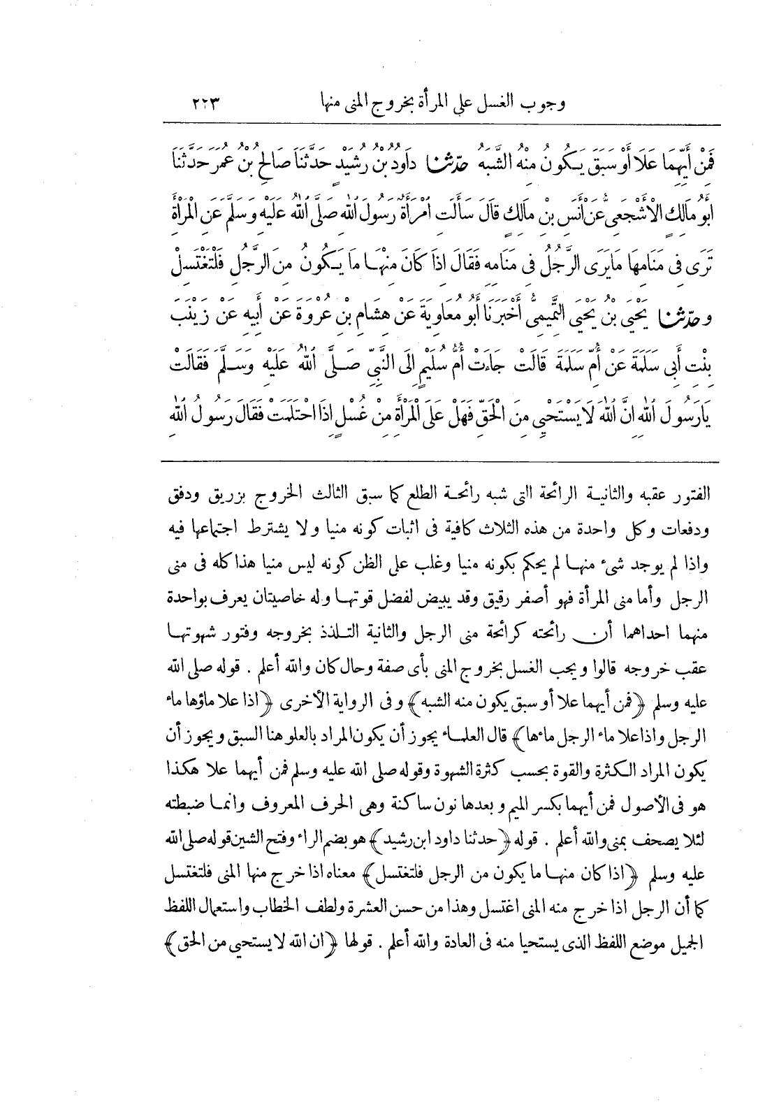 الفتور عقبه والثانية الرائحة التي شبه الطَّلْعِ كَمَا سَبَقَ الثَّالِثُ الْخُرُوجُ بِزُرَيْقٍ وَدَفْقٍ وَدَفَعَاتٍ وَكُلُّ وَاحِدَةٍ مِنْ هَذِهِ الثَّلَاثِ كَافِيَةٌ فِي إِثْبَاتِ كَوْنِهِ مَنِيًّا وَلَا يُشْتَرَطُ اجْتِمَاعُهَا فيه واذا لم يوجد شئ مِنْهَا لَمْ يُحْكَمْ بِكَوْنِهِ مَنِيًّا وَغَلَبَ عَلَى الظَّنِّ كَوْنُهُ لَيْسَ مَنِيًّا هَذَا كُلُّهُ فِي مَنِيِّ الرَّجُلِ وَأَمَّا مَنِيُّ الْمَرْأَةِ فَهُوَ أَصْفَرُ رَقِيقٌ وَقَدْ يَبْيَضُّ لِفَضْلِ قُوَّتِهَا وَلَهُ خَاصِّيَّتَانِ يُعْرَفُ بِوَاحِدَةٍ مِنْهُمَا إِحْدَاهُمَا أَنَّ رَائِحَتَهُ كَرَائِحَةِ مَنِيِّ الرَّجُلِ وَالثَّانِيَةُ التَّلَذُّذُ بِخُرُوجِهِ وَفُتُورُ شَهْوَتِهَا عَقِبَ خُرُوجِهِ قَالُوا وَيَجِبُ الْغُسْلُ بِخُرُوجِ الْمَنِيِّ بِأَيِّ صِفَةٍ وَحَالٍ كَانَ وَاللَّهُ أَعْلَمُ قَوْلُهُ صَلَّى اللَّهُ عَلَيْهِ وَسَلَّمَ (فَمِنْ أَيِّهِمَا عَلَا أَوْ سَبَقَ يَكُونُ مِنْهُ الشَّبَهُ) وَفِي الرِّوَايَةِ الْأُخْرَى (إِذَا عَلَا مَاؤُهَا مَاءَ الرَّجُلِ وَإِذَا عَلَا مَاءُ الرَّجُلِ مَاءَهَا) قَالَ الْعُلَمَاءُ يَجُوزُ أَنْ يَكُونَ الْمُرَادُ بِالْعُلُوِّ هُنَا السَّبْقُ وَيَجُوزُ أَنْ يَكُونَ الْمُرَادُ الْكَثْرَةُ وَالْقُوَّةُ بِحَسَبِ كَثْرَةِ الشَّهْوَةِ وَقَوْلُهُ صَلَّى اللَّهُ عَلَيْهِ وَسَلَّمَ فَمِنْ أَيِّهِمَا عَلَا هَكَذَا هُوَ فِي الْأُصُولِ فَمِنْ أَيِّهِمَا بِكَسْرِ الْمِيمِ وَبَعْدَهَا نُونٌ سَاكِنَةٌ وَهِيَ الْحَرْفُ الْمَعْرُوفُ وَإِنَّمَا ضَبَطْتُهُ لِئَلَّا يُصَحَّفَ بِمَنِيٍّ وَاللَّهُ أَعْلَمُ قَوْلُهُ (حَدَّثَنَا دَاوُدُ بْنُ رُشَيْدٍ) هُوَ بِضَمِّ الرَّاءِ وَفَتْحِ الشِّينِ قَوْلُهُ صَلَّى اللَّهُ عَلَيْهِ وَسَلَّمَ (إِذَا كَانَ مِنْهَا مَا يَكُونُ مِنَ الرَّجُلِ فَلْتَغْتَسِلْ) مَعْنَاهُ إِذَا خَرَجَ مِنْهَا الْمَنِيُّ فَلْتَغْتَسِلْ كَمَا أَنَّ الرَّجُلَ إِذَا خَرَجَ مِنْهُ الْمَنِيُّ اغْتَسَلَ وَهَذَا مِنْ حُسْنِ الْعِشْرَةِ وَلُطْفِ الْخِطَابِ وَاسْتِعْمَالُ اللَّفْظِ الْجَمِيلِ مَوْضِعَ اللَّفْظِ الَّذِي يُسْتَحَيَا مِنْهُ فِي الْعَادَةِ وَاللَّهُ أعلم قولها (إن الله لا يستحي من الحق