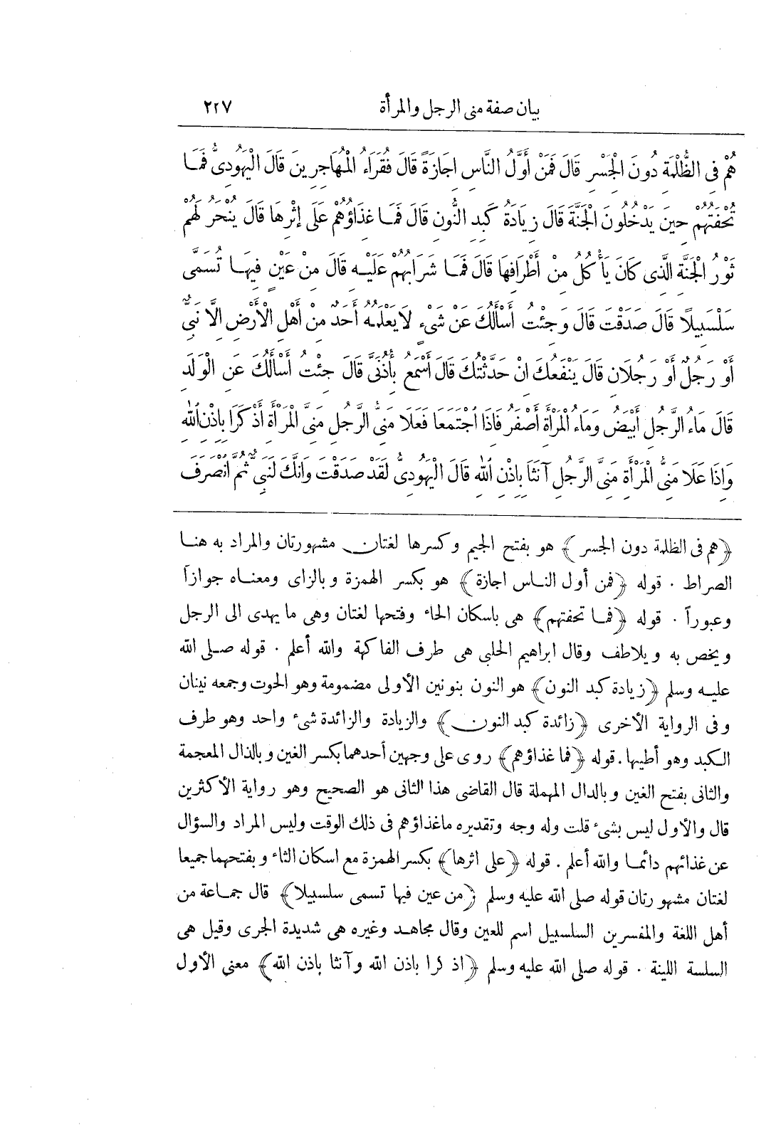 (هُمْ فِي الظُّلْمَةِ دُونَ الْجِسْرِ) هُوَ بِفَتْحِ الْجِيمِ وَكَسْرِهَا لُغَتَانِ مَشْهُورَتَانِ وَالْمُرَادُ بِهِ هُنَا الصراط قوله صلى الله عليه وسلم (فَمَنْ أَوَّلُ النَّاسِ إِجَازَةً) هُوَ بِكَسْرِ الْهَمْزَةِ وَبِالزَّايِ وَمَعْنَاهُ جَوَازًا وَعُبُورًا قَوْلُهُ (فَمَا تُحْفَتُهُمْ) هِيَ بِإِسْكَانِ الْحَاءِ وَفَتْحِهَا لُغَتَانِ وَهِيَ مَا يُهْدَى إِلَى الرَّجُلِ وَيُخَصُّ بِهِ وَيُلَاطَفُ وَقَالَ إِبْرَاهِيمُ الْحَلَبِيُّ هِيَ طَرَفُ الْفَاكِهَةِ وَاللَّهُ أَعْلَمُ قَوْلُهُ صَلَّى اللَّهُ عَلَيْهِ وَسَلَّمَ (زِيَادَةُ كَبِدِ النُّونِ) هُوَ النُّونُ بِنُونَيْنِ الْأُولَى مَضْمُومَةٌ وَهُوَ الْحُوتُ وَجَمْعُهُ نِينَانٌ وَفِي الرِّوَايَةِ الْأُخْرَى (زَائِدَةُ كبد النون) والزيادة والزائدة شئ وَاحِدٌ وَهُوَ طَرَفُ الْكَبِدِ وَهُوَ أَطْيَبُهَا قَوْلُهُ (فَمَا غِذَاؤُهُمْ) رُوِيَ عَلَى وَجْهَيْنِ أَحَدُهُمَا بِكَسْرِ الْغَيْنِ وَبِالذَّالِ الْمُعْجَمَةِ وَالثَّانِي بِفَتْحِ الْغَيْنِ وَبِالدَّالِ الْمُهْمَلَةِ قَالَ الْقَاضِي عِيَاضٌ هَذَا الثَّانِي هُوَ الصَّحِيحُ وَهُوَ رِوَايَةُ الْأَكْثَرِينَ قَالَ وَالْأَوَّلُ لَيْسَ بشئ قُلْتُ وَلَهُ وَجْهٌ وَتَقْدِيرُهُ مَا غِذَاؤُهُمْ فِي ذَلِكَ الْوَقْتِ وَلَيْسَ الْمُرَادُ وَالسُّؤَالُ عَنْ غِذَائِهِمْ دَائِمًا وَاللَّهُ أَعْلَمُ قَوْلُهُ (عَلَى إِثْرِهَا) بِكَسْرِ الْهَمْزَةِ مَعَ إِسْكَانِ الثَّاءِ وَبِفَتْحِهِمَا جَمِيعًا لُغَتَانِ مَشْهُورَتَانِ قَوْلُهُ صَلَّى اللَّهُ عَلَيْهِ وَسَلَّمَ (مِنْ عَيْنٍ فِيهَا تُسَمَّى سَلْسَبِيلَا) قَالَ جَمَاعَةٌ مِنْ أَهْلِ اللُّغَةِ وَالْمُفَسِّرِينَ السَّلْسَبِيلُ اسْمٌ لِلْعَيْنِ وَقَالَ مُجَاهِدٌ وَغَيْرُهُ هِيَ شَدِيدَةُ الْجَرْيِ وَقِيلَ هِيَ السلسة اللَّيِّنَةُ قَوْلُهُ صَلَّى اللَّهُ عَلَيْهِ وَسَلَّمَ (أَذْكَرَا بِإِذْنِ اللَّهِ وَآنَثَا بِإِذْنِ اللَّهِ) مَعْنَى الْأَوَّلِ