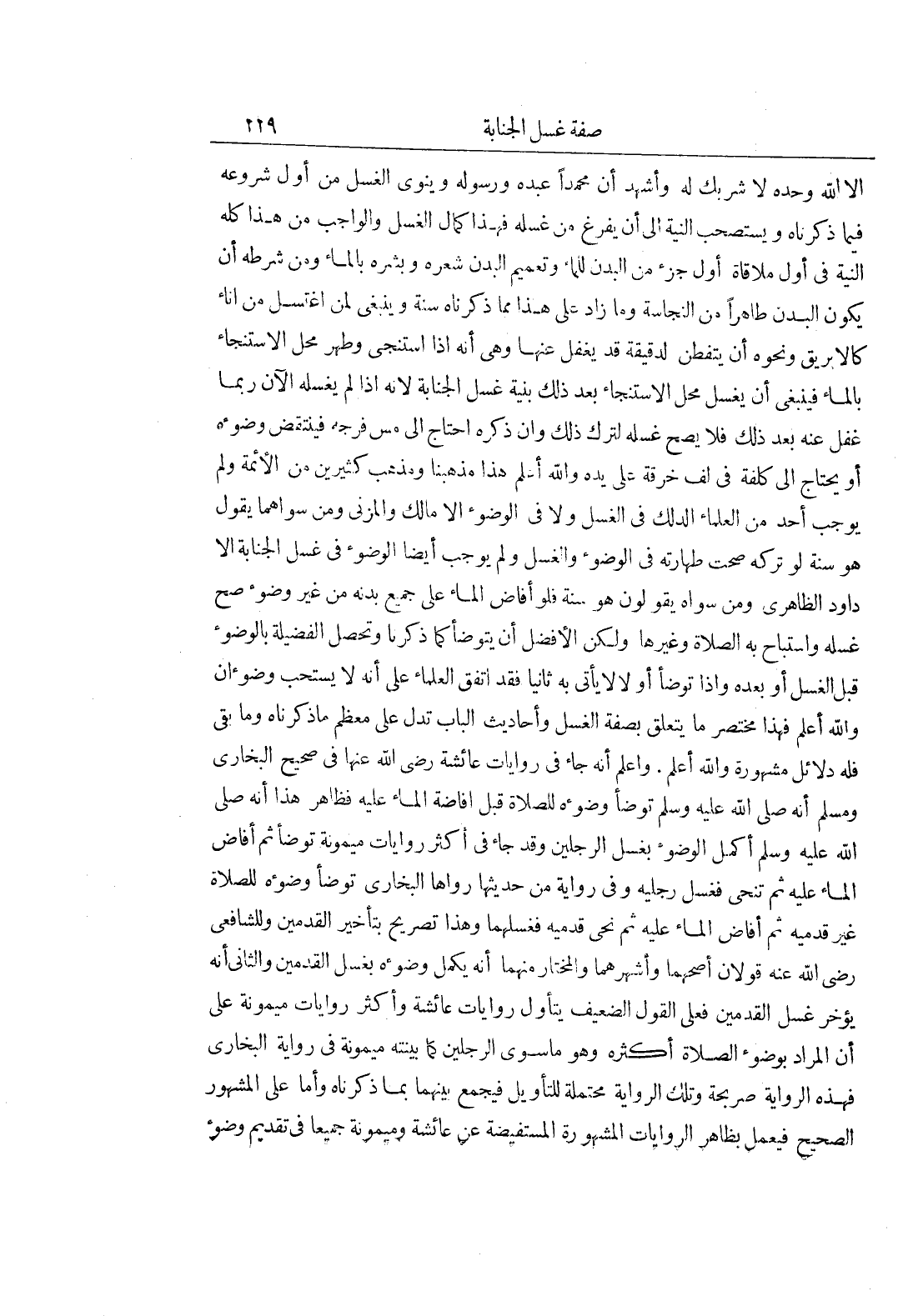 إِلَّا اللَّهُ وَحْدَهُ لَا شَرِيكَ لَهُ وَأَشْهَدُ أَنَّ مُحَمَّدًا عَبْدُهُ وَرَسُولُهُ وَيَنْوِيَ الْغُسْلَ مِنْ أَوَّلِ شُرُوعِهِ فِيمَا ذَكَرْنَاهُ وَيَسْتَصْحِبَ النِّيَّةَ إِلَى أَنْ يَفْرُغَ مِنْ غُسْلِهِ فَهَذَا كَمَالُ الْغُسْلِ وَالْوَاجِبُ مِنْ هَذَا كُلِّهِ النِّيَّةُ فِي أَوَّلِ مُلَاقَاةِ أَوَّلِ جُزْءٍ مِنَ الْبَدَنِ لِلْمَاءِ وَتَعْمِيمِ الْبَدَنِ شَعْرِهِ وَبَشَرِهِ بِالْمَاءِ وَمِنْ شَرْطِهِ أَنْ يَكُونَ الْبَدَنُ طَاهِرًا مِنَ النَّجَاسَةِ وَمَا زَادَ عَلَى هَذَا مِمَّا ذَكَرْنَاهُ سُنَّةٌ وَيَنْبَغِي لِمَنِ اغْتَسَلَ مِنْ إِنَاءٍ كَالْإِبْرِيقِ وَنَحْوِهِ أَنْ يَتَفَطَّنَ لِدَقِيقَةٍ قَدْ يَغْفُلُ عَنْهَا وَهِيَ أَنَّهُ إِذَا اسْتَنْجَى وَطَهَّرَ مَحَلَّ الِاسْتِنْجَاءِ بِالْمَاءِ فَيَنْبَغِي أَنْ يَغْسِلَ مَحَلَّ الِاسْتِنْجَاءِ بَعْدَ ذَلِكَ بِنِيَّةِ غُسْلِ الْجَنَابَةِ لِأَنَّهُ إِذَا لَمْ يَغْسِلْهُ الْآنَ رُبَّمَا غَفَلَ عَنْهُ بَعْدَ ذَلِكَ فَلَا يَصِحُّ غَسْلُهُ لِتَرْكِ ذَلِكَ وَإِنْ ذَكَرَهُ احْتَاجَ إِلَى مَسِّ فَرْجِهِ فَيَنْتَقِضُ وُضُوءُهُ أَوْ يَحْتَاجُ إِلَى كُلْفَةٍ فِي لَفِّ خِرْقَةٍ عَلَى يَدِهِ وَاللَّهُ أَعْلَمُ هَذَا مَذْهَبُنَا وَمَذْهَبُ كَثِيرِينَ مِنَ الْأَئِمَّةِ وَلَمْ يُوجِبْ أَحَدٌ مِنَ الْعُلَمَاءِ الدَّلْكَ فِي الْغُسْلِ وَلَا فِي الْوُضُوءِ إِلَّا مَالِكٌ وَالْمُزَنِيُّ وَمَنْ سِوَاهُمَا يَقُولُ هُوَ سُنَّةٌ لَوْ تَرَكَهُ صَحَّتْ طَهَارَتُهُ فِي الْوُضُوءِ وَالْغُسْلِ وَلَمْ يُوجِبْ أَيْضًا الْوُضُوءَ فِي غُسْلِ الْجَنَابَةِ إِلَّا دَاوُدَ الظَّاهِرِيَّ وَمَنْ سِوَاهُ يَقُولُونَ هُوَ سُنَّةٌ فَلَوْ أَفَاضَ الْمَاءَ عَلَى جَمِيعِ بَدَنِهِ مِنْ غَيْرِ وُضُوءٍ صَحَّ غُسْلُهُ وَاسْتَبَاحَ بِهِ الصَّلَاةَ وَغَيْرَهَا وَلَكِنَّ الْأَفْضَلَ أَنْ يَتَوَضَّأَ كَمَا ذَكَرْنَا وَتَحْصُلُ الْفَضِيلَةُ بِالْوُضُوءِ قَبْلَ الْغُسْلِ أَوْ بَعْدَهُ وَإِذَا تَوَضَّأَ أَوَّلًا لَا يَأْتِي بِهِ ثَانِيًا فَقَدِ اتَّفَقَ الْعُلَمَاءُ عَلَى أَنَّهُ لَا يُسْتَحَبُّ وُضُوءَانِ وَاللَّهُ أَعْلَمُ فَهَذَا مُخْتَصَرُ مَا يَتَعَلَّقُ بِصِفَةِ الْغُسْلِ وَأَحَادِيثُ الْبَابِ تَدُلُّ عَلَى مُعْظَمِ مَا ذَكَرْنَاهُ وَمَا بَقِيَ فَلَهُ دَلَائِلُ مَشْهُورَةٌ وَاللَّهُ أَعْلَمُ وَاعْلَمْ أَنَّهُ جَاءَ فِي رِوَايَاتِ عَائِشَةَ رَضِيَ اللَّهُ عَنْهَا فِي صَحِيحِ الْبُخَارِيِّ وَمُسْلِمٍ أَنَّهُ صَلَّى اللَّهُ عَلَيْهِ وَسَلَّمَ تَوَضَّأَ وُضُوءَهُ لِلصَّلَاةِ قَبْلَ إِفَاضَةِ الْمَاءِ عَلَيْهِ فَظَاهِرُ هَذَا أَنَّهُ صَلَّى اللَّهُ عَلَيْهِ وَسَلَّمَ أَكْمَلَ الْوُضُوءَ بِغَسْلِ الرِّجْلَيْنِ وَقَدْ جَاءَ فِي أَكْثَرِ رِوَايَاتِ مَيْمُونَةَ تَوَضَّأَ ثُمَّ أَفَاضَ الْمَاءَ عَلَيْهِ ثُمَّ تَنَحَّى فَغَسَلَ رِجْلَيْهِ وَفِي رِوَايَةٍ مِنْ حَدِيثِهَا رَوَاهَا الْبُخَارِيُّ تَوَضَّأَ وُضُوءَهُ لِلصَّلَاةِ غَيْرَ قَدَمَيْهِ ثُمَّ أَفَاضَ الْمَاءَ عَلَيْهِ ثُمَّ نَحَّى قَدَمَيْهِ فَغَسَلَهُمَا وَهَذَا تَصْرِيحٌ بِتَأْخِيرِ الْقَدَمَيْنِ وَلِلشَّافِعِيِّ رَضِيَ اللَّهُ عَنْهُ قَوْلَانِ أَصَحُّهُمَا وَأَشْهَرُهُمَا وَالْمُخْتَارُ مِنْهُمَا أَنَّهُ يُكْمِلُ وُضُوءَهُ بِغَسْلِ الْقَدَمَيْنِ وَالثَّانِي أَنَّهُ يُؤَخِّرُ غَسْلَ الْقَدَمَيْنِ فَعَلَى الْقَوْلِ الضَّعِيفِ يَتَأَوَّلُ رِوَايَاتِ عَائِشَةَ وَأَكْثَرَ رِوَايَاتِ مَيْمُونَةَ عَلَى أَنَّ الْمُرَادَ بِوُضُوءِ الصَّلَاةِ أَكْثَرَهُ وَهُوَ مَا سِوَى الرِّجْلَيْنِ كَمَا بَيَّنَتْهُ مَيْمُونَةُ فِي رِوَايَةِ الْبُخَارِيِّ فَهَذِهِ الرِّوَايَةُ صَرِيحَةٌ وَتِلْ