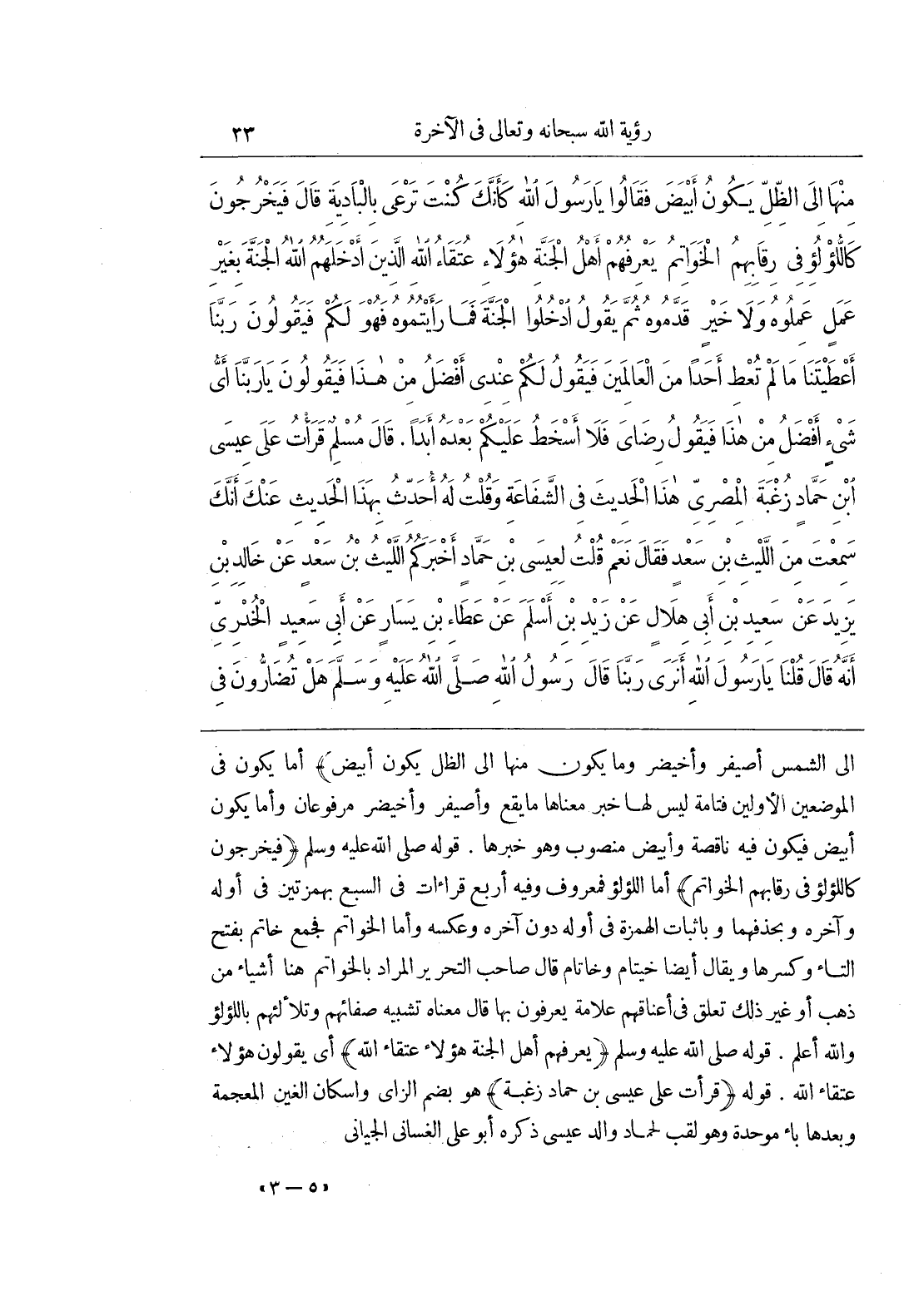 إِلَى الشَّمْسِ أُصَيْفِرُ وَأُخَيْضِرُ وَمَا يَكُونُ مِنْهَا إِلَى الظِّلِّ يَكُونُ أَبْيَضَ) أَمَّا يَكُونُ فِي الْمَوْضِعَيْنِ الْأَوَّلَيْنِ فَتَامَّةٌ لَيْسَ لَهَا خَبَرٌ مَعْنَاهَا مَا يَقَعُ وَأُصَيْفِرُ وَأُخَيْضِرُ مَرْفُوعَانِ وَأَمَّا يَكُونُ أَبْيَضُ فَيَكُونُ فِيهِ نَاقِصَةٌ وَأَبْيَضُ مَنْصُوبٌ وَهُوَ خَبَرُهَا قَوْلُهُ صَلَّى اللَّهُ عَلَيْهِ وَسَلَّمَ (فَيَخْرُجُونَ كَاللُّؤْلُؤِ فِي رِقَابِهِمُ الْخَوَاتِمُ) أَمَّا اللُّؤْلُؤُ فَمَعْرُوفٌ وَفِيهِ أَرْبَعُ قِرَاءَاتٍ فِي السَّبْعِ بِهَمْزَتَيْنِ فِي أَوَّلِهِ وَآخِرِهِ وَبِحَذْفِهِمَا وَبِإِثْبَاتِ الْهَمْزَةِ فِي أَوَّلِهِ دُونَ آخِرِهِ وَعَكْسِهِ وَأَمَّا الْخَوَاتِمُ فَجَمْعُ خَاتَمٍ بِفَتْحِ التَّاءِ وَكَسْرِهَا وَيُقَالُ أَيْضًا خَيْتَامٌ وَخَاتَامٌ قَالَ صَاحِبُ التَّحْرِيرِ الْمُرَادُ بِالْخَوَاتِمِ هُنَا أَشْيَاءُ مِنْ ذَهَبٍ أَوْ غَيْرِ ذَلِكَ تُعَلَّقُ فِي أَعْنَاقِهِمْ عَلَامَةً يُعْرَفُونَ بِهَا قَالَ مَعْنَاهُ تَشْبِيهُ صَفَائِهِمْ وَتَلَأْلُئِهِمْ بِاللُّؤْلُؤِ وَاللَّهُ أَعْلَمُ قَوْلُهُ صَلَّى اللَّهُ عَلَيْهِ وَسَلَّمَ (يَعْرِفُهُمْ أَهْلُ الْجَنَّةِ هَؤُلَاءِ عُتَقَاءُ اللَّهِ) أَيْ يَقُولُونَ هَؤُلَاءِ عُتَقَاءُ اللَّهِ قَوْلُهُ (قَرَأْتُ عَلَى عِيسَى بْنِ حَمَّادٍ زُغْبَةَ) هُوَ بِضَمِّ الزَّايِ وَإِسْكَانِ الْغَيْنِ الْمُعْجَمَةِ وَبَعْدَهَا بَاءٌ مُوَحَّدَةٌ وَهُوَ لَقَبٌ لِحَمَّادٍ وَالِدِ عِيسَى ذَكَرَهُ أَبُو عَلِيٍّ الْغَسَّانِيُّ الْجَيَّانِيُّ