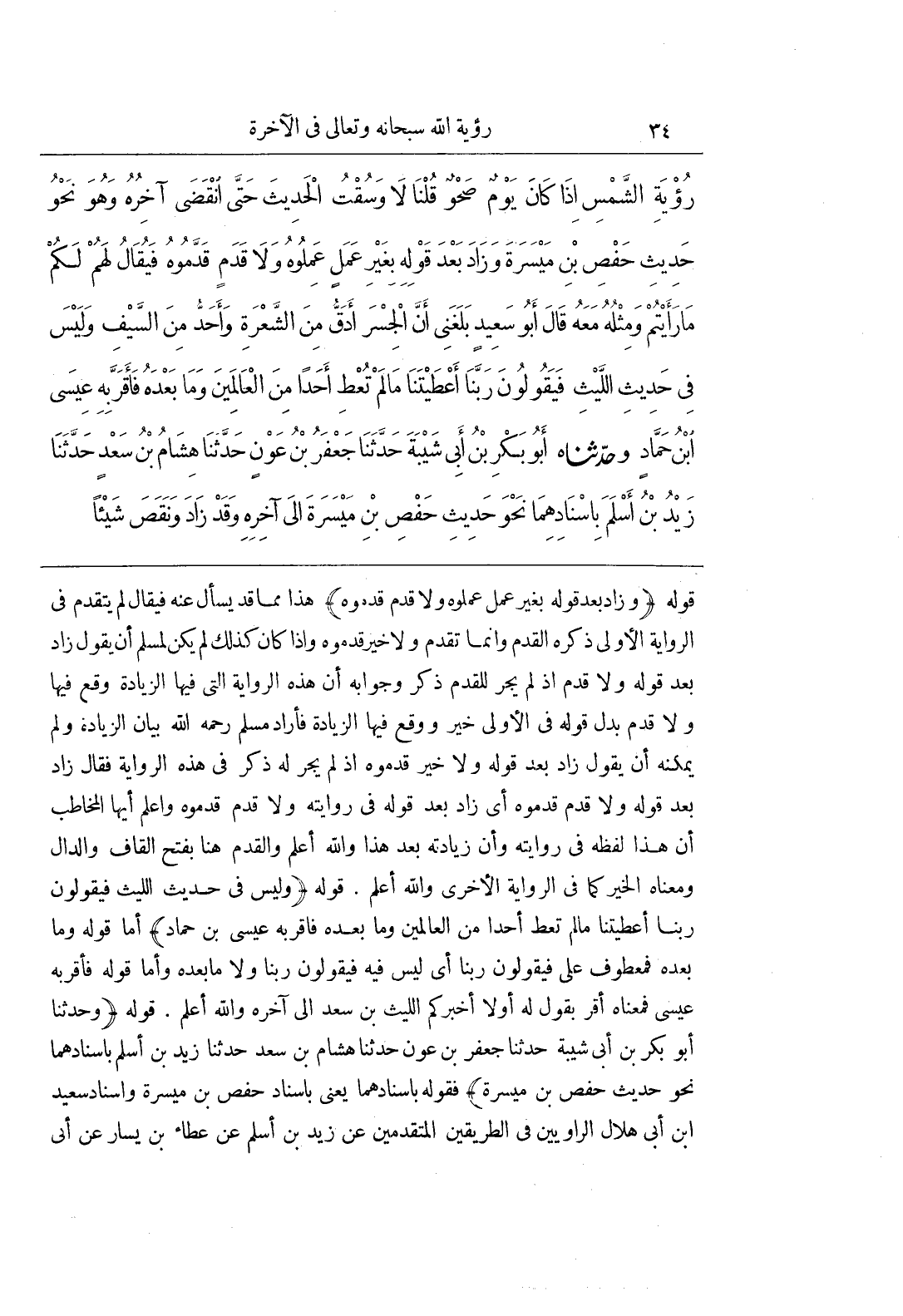 قَوْلُهُ (وَزَادَ بَعْدَ قَوْلِهِ بِغَيْرِ عَمَلٍ عَمِلُوهُ وَلَا قَدَمٍ قَدَّمُوهُ) هَذَا مِمَّا قَدْ يُسْأَلُ عَنْهُ فَيُقَالُ لَمْ يَتَقَدَّمْ فِي الرِّوَايَةِ الْأُولَى ذِكْرُهُ الْقَدَمَ وَإِنَّمَا تَقَدَّمَ وَلَا خَيْرٍ قَدَّمُوهُ وَإِذَا كَانَ كَذَلِكَ لَمْ يَكُنْ لِمُسْلِمٍ أَنْ يَقُولَ زَادَ بَعْدَ قَوْلِهِ وَلَا قَدَمٍ إِذْ لَمْ يَجْرِ لِلْقَدَمِ ذِكْرٌ وَجَوَابُهُ أَنَّ هَذِهِ الرِّوَايَةَ الَّتِي فِيهَا الزِّيَادَةُ وَقَعَ فِيهَا وَلَا قَدَمٍ بَدَلَ قَوْلِهِ فِي الْأُولَى خَيْرٍ وَوَقَعَ فِيهَا الزِّيَادَةُ فَأَرَادَ مُسْلِمٌ رَحِمَهُ اللَّهُ بَيَانَ الزِّيَادَةِ وَلَمْ يُمْكِنْهُ أَنْ يَقُولَ زَادَ بَعْدَ قَوْلِهِ وَلَا خَيْرٍ قَدَّمُوهُ إِذْ لَمْ يَجْرِ لَهُ ذِكْرٌ فِي هَذِهِ الرِّوَايَةِ فَقَالَ زَادَ بَعْدَ قَوْلِهِ وَلَا قَدَمٍ قَدَّمُوهُ أَيْ زَادَ بَعْدَ قَوْلِهِ فِي رِوَايَتِهِ وَلَا قَدَمٍ قَدَّمُوهُ وَاعْلَمْ أَيُّهَا الْمُخَاطَبُ أَنَّ هَذَا لَفْظُهُ فِي رِوَايَتِهِ وَأَنَّ زِيَادَتَهُ بَعْدَ هَذَا وَاللَّهُ أَعْلَمُ وَالْقَدَمُ هُنَا بِفَتْحِ الْقَافِ وَالدَّالِ وَمَعْنَاهُ الْخَيْرُ كَمَا فِي الرِّوَايَةِ الْأُخْرَى وَاللَّهُ أَعْلَمُ قَوْلُهُ (وَلَيْسَ فِي حَدِيثِ اللَّيْثِ فَيَقُولُونَ رَبَّنَا أَعْطَيْتَنَا مالم تعط أحدا من العالمين وما بعده فاقربه عِيسَى بْنُ حَمَّادٍ أَمَّا قَوْلُهُ وَمَا بَعْدَهُ فَمَعْطُوفٌ عَلَى فَيَقُولُونَ رَبَّنَا أَيْ لَيْسَ فِيهِ فَيَقُولُونَ رَبَّنَا وَلَا مَا بَعْدَهُ وَأَمَّا قَوْلُهُ فأقربه عِيسَى فَمَعْنَاهُ أَقَرَّ بِقَوْلٍ لَهُ أَوَّلًا أَخْبَرَكُمُ اللَّيْثُ بْنُ سَعْدٍ إِلَى آخِرِهِ وَاللَّهُ أَعْلَمُ قَوْلُهُ وَحَدَّثَنَا أَبُو بَكْرِ بْنُ أَبِي شَيْبَةَ حَدَّثَنَا جَعْفَرُ بْنُ عَوْنٍ حَدَّثَنَا هِشَامُ بْنُ سَعْدٍ حَدَّثَنَا زَيْدُ بْنُ أَسْلَمَ بِإِسْنَادِهِمَا نَحْوَ حَدِيثِ حَفْصِ بْنِ مَيْسَرَةَ) فَقَوْلُهُ بِإِسْنَادِهِمَا يَعْنِي باسناد حفص بن مَيْسَرَةَ وَإِسْنَادِ سَعِيدِ بْنِ أَبِي هِلَالٍ الرَّاوِيَيْنِ فِي الطَّرِيقَيْنِ الْمُتَقَدِّمَيْنِ عَنْ زَيْدِ بْنِ أَسْلَمَ عَنْ عَطَاءِ بْنِ يَسَارٍ عَنْ أَبِي