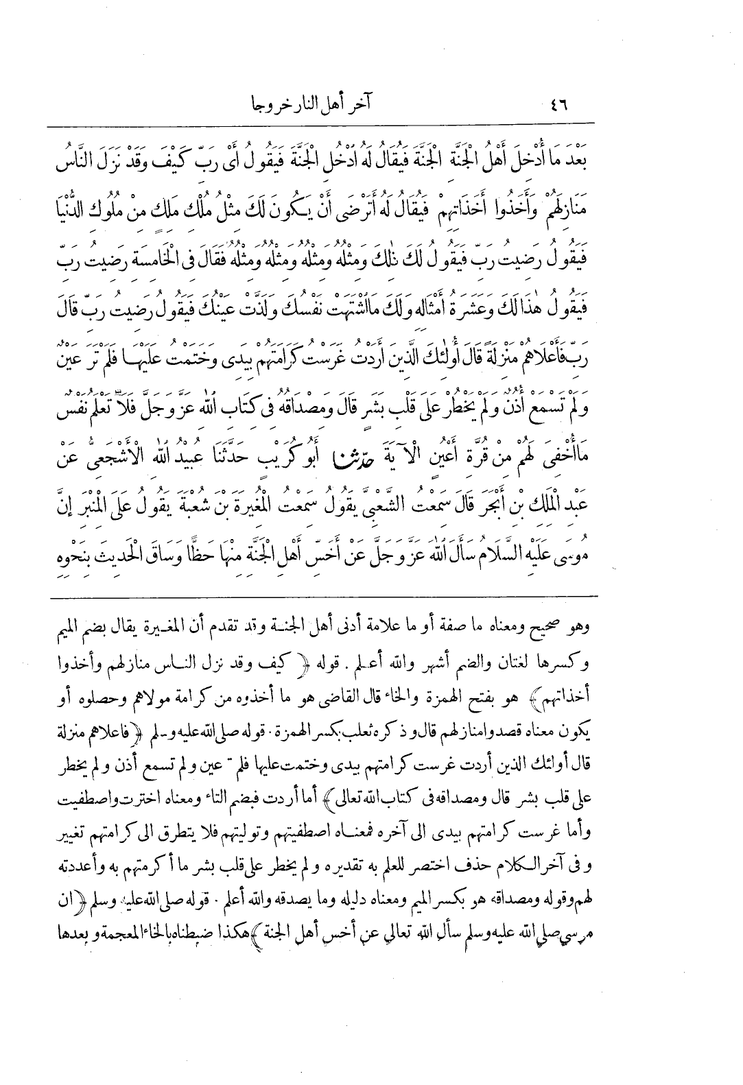 وَهُوَ صَحِيحٌ وَمَعْنَاهُ مَا صِفَةُ أَوْ مَا عَلَامَةُ أَدْنَى أَهْلِ الْجَنَّةِ وَقَدْ تَقَدَّمَ أَنَّ الْمُغِيرَةَ يُقَالُ بِضَمِّ الْمِيمِ وَكَسْرِهَا لُغَتَانِ وَالضَّمُّ أَشْهَرُ وَاللَّهُ أَعْلَمُ قَوْلُهُ (كَيْفَ وَقَدْ نَزَلَ النَّاسُ مَنَازِلَهُمْ وَأَخَذُوا أَخَذَاتِهِمْ) هُوَ بِفَتْحِ الْهَمْزَةِ وَالْخَاءِ قَالَ الْقَاضِي هُوَ مَا أَخَذُوهُ مِنْ كَرَامَةِ مَوْلَاهُمْ وَحَصَّلُوهُ أَوْ يَكُونُ مَعْنَاهُ قَصَدُوا منازلهم قال وذكره ثَعْلَبٌ بِكَسْرِ الْهَمْزَةِ قَوْلُهُ صَلَّى اللَّهُ عَلَيْهِ وَسَلَّمَ (فَأَعْلَاهُمْ مَنْزِلَةً قَالَ أُولَئِكَ الَّذِينَ أَرَدْتُ غَرَسْتُ كَرَامَتَهُمْ بِيَدِي وَخَتَمْتُ عَلَيْهَا فَلَمْ تَرَ عَيْنٌ وَلَمْ تَسْمَعْ أُذُنٌ وَلَمْ يَخْطُرْ عَلَى قَلْبِ بَشَرٍ قَالَ وَمِصْدَاقُهُ فِي كِتَابِ اللَّهِ تَعَالَى) أَمَّا أَرَدْتُ فَبِضَمِّ التَّاءِ وَمَعْنَاهُ اخْتَرْتُ وَاصْطَفَيْتُ وَأَمَّا غَرَسْتُ كَرَامَتَهُمْ بِيَدِي إِلَى آخِرِهِ فَمَعْنَاهُ اصْطَفَيْتُهُمْ وَتَوَلَّيْتُهُمْ فَلَا يَتَطَرَّقُ إِلَى كَرَامَتِهِمْ تَغْيِيرٌ وَفِي آخِرِ الْكَلَامِ حَذْفٌ اخْتُصِرَ لِلْعِلْمِ بِهِ تَقْدِيرُهُ وَلَمْ يَخْطُرْ عَلَى قَلْبِ بَشَرٍ مَا أَكْرَمْتُهُمْ بِهِ وَأَعْدَدْتُهُ لَهُمْ وَقَوْلُهُ وَمِصْدَاقُهُ هُوَ بِكَسْرِ الْمِيمِ وَمَعْنَاهُ دَلِيلُهُ وَمَا يُصَدِّقُهُ وَاللَّهُ أَعْلَمُ قَوْلُهُ صَلَّى اللَّهُ عَلَيْهِ وَسَلَّمَ (إِنَّ مُوسَى صَلَّى اللَّهُ عَلَيْهِ وَسَلَّمَ سَأَلَ اللَّهَ تَعَالَى عَنْ أَخَسِّ أَهْلِ الْجَنَّةِ) هَكَذَا ضَبَطْنَاهُ بِالْخَاءِ الْمُعْجَمَةِ وَبَعْدَهَا