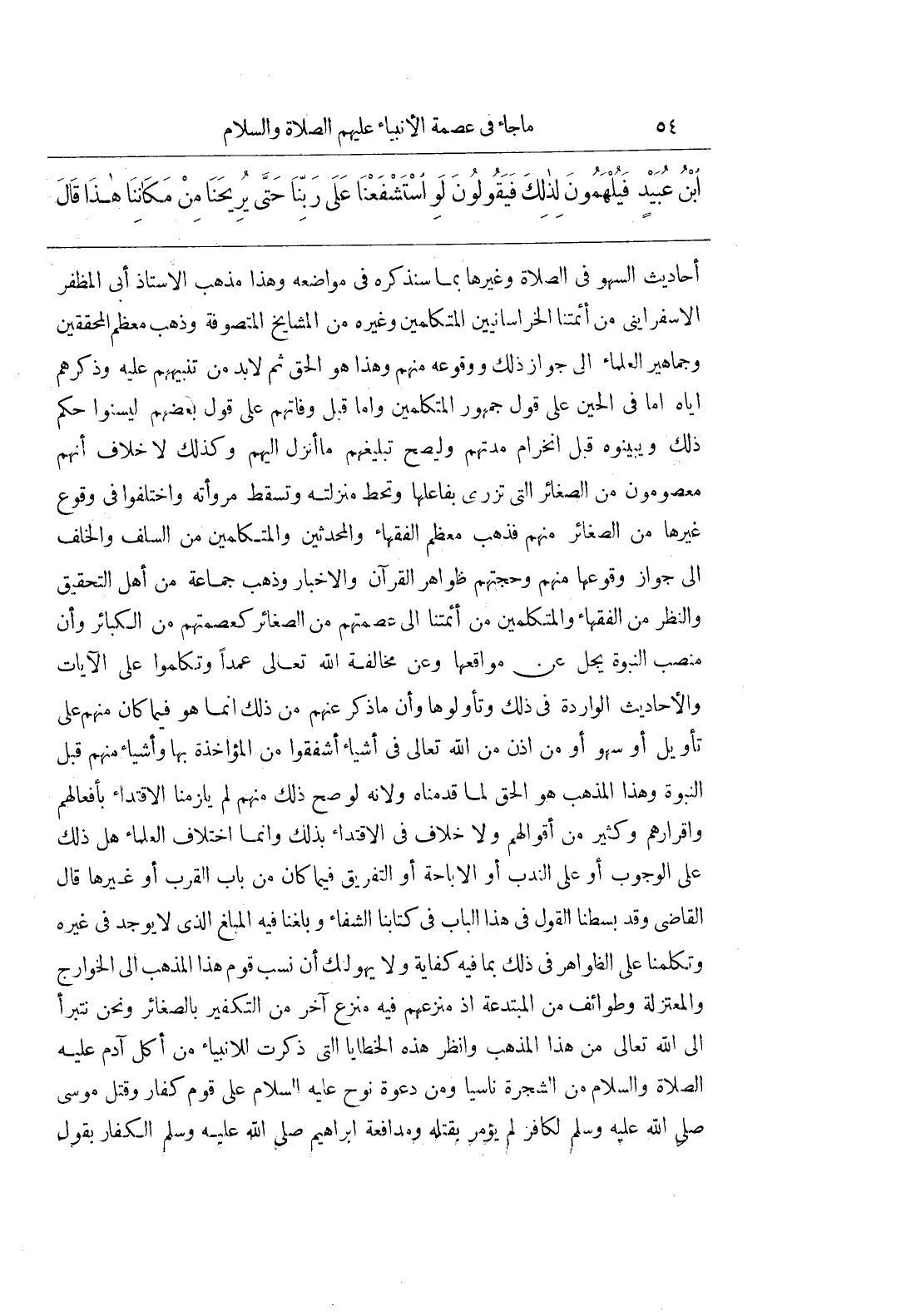 أَحَادِيثَ السَّهْوِ فِي الصَّلَاةِ وَغَيْرِهَا بِمَا سَنَذْكُرُهُ فِي مَوَاضِعِهِ وَهَذَا مَذْهَبُ الْأُسْتَاذِ أَبِي الْمُظَفَّرِ الْإِسْفَرَايِنِيُّ مِنْ أَئِمَّتِنَا الْخُرَاسَانِيِّينَ الْمُتَكَلِّمِينَ وَغَيْرِهِ مِنَ الْمَشَايِخِ الْمُتَصَوِّفَةِ وَذَهَبَ مُعْظَمُ الْمُحَقِّقِينَ وَجَمَاهِيرُ الْعُلَمَاءِ إِلَى جَوَازِ ذَلِكَ وَوُقُوعِهِ مِنْهُمْ وَهَذَا هُوَ الْحَقُّ ثُمَّ لَا بُدَّ مِنْ تَنْبِيهِهِمْ عَلَيْهِ وَذِكْرِهِمْ إِيَّاهُ إِمَّا فِي الْحِينِ عَلَى قَوْلِ جُمْهُورِ الْمُتَكَلِّمِينَ وَإِمَّا قَبْلَ وَفَاتِهِمْ عَلَى قَوْلِ بَعْضِهِمْ لِيَسُنُّوا حُكْمَ ذَلِكَ وَيُبَيِّنُوهُ قَبْلَ انْخِرَامِ مُدَّتِهِمْ وَلِيَصِحَّ تَبْلِيغُهُمْ مَا أُنْزِلَ إِلَيْهِمْ وَكَذَلِكَ لَا خِلَافَ أَنَّهُمْ مَعْصُومُونَ مِنَ الصَّغَائِرِ الَّتِي تزرى بفاعلها وتحط منزلته وتسقط مروأته وَاخْتَلَفُوا فِي وُقُوعِ غَيْرِهَا مِنَ الصَّغَائِرِ مِنْهُمْ فَذَهَبَ مُعْظَمُ الْفُقَهَاءِ وَالْمُحَدِّثِينَ وَالْمُتَكَلِّمِينَ مِنَ السَّلَفِ وَالْخَلَفِ إِلَى جَوَازِ وُقُوعِهَا مِنْهُمْ وَحُجَّتُهُمْ ظَوَاهِرُ الْقُرْآنِ وَالْأَخْبَارِ وَذَهَبَ جَمَاعَةٌ مِنْ أَهْلِ التَّحْقِيقِ وَالنَّظَرِ مِنَ الْفُقَهَاءِ وَالْمُتَكَلِّمِينَ مِنْ أَئِمَّتنَا إِلَى عِصْمَتِهِمْ مِنَ الصَّغَائِرِ كَعِصْمَتِهِمْ مِنَ الْكَبَائِرِ وَأَنَّ منصب النبوة يجل عن مواقعها وَعَنْ مُخَالَفَةِ اللَّهِ تَعَالَى عَمْدًا وَتَكَلَّمُوا عَلَى الْآيَاتِ وَالْأَحَادِيثِ الْوَارِدَةِ فِي ذَلِكَ وَتَأَوَّلُوهَا وَأَنَّ مَا ذُكِرَ عَنْهُمْ مِنْ ذَلِكَ إِنَّمَا هُوَ فِيمَا كَانَ مِنْهُمْ عَلَى تَأْوِيلٍ أَوْ سَهْوٍ أَوْ مِنْ إِذْنٍ مِنَ اللَّهِ تَعَالَى فِي أَشْيَاءَ أَشْفَقُوا مِنَ الْمُؤَاخَذَةِ بِهَا وَأَشْيَاءَ مِنْهُمْ قَبْلَ النُّبُوَّةِ وَهَذَا الْمَذْهَبُ هُوَ الْحَقُّ لِمَا قَدَّمْنَاهُ وَلِأَنَّهُ لَوْ صَحَّ ذَلِكَ مِنْهُمْ لَمْ يَلْزَمْنَا الِاقْتِدَاءُ بِأَفْعَالِهِمْ وَإِقْرَارِهِمْ وَكَثِيرٌ مِنْ أَقْوَالِهِمْ وَلَا خِلَافَ فِي الِاقْتِدَاءِ بِذَلِكَ وَإِنَّمَا اخْتِلَافُ الْعُلَمَاءِ هَلْ ذَلِكَ عَلَى الْوُجُوبِ أَوْ عَلَى النَّدْبِ أَوِ الْإِبَاحَةِ أَوِ التَّفْرِيقِ فِيمَا كَانَ مِنْ بَابِ الْقُرَبِ أَوْ غَيْرِهَا قَالَ الْقَاضِي وَقَدْ بَسَطْنَا الْقَوْلَ فِي هَذَا الْبَابِ فِي كِتَابِنَا الشِّفَاءُ وَبَلَغْنَا فِيهِ الْمَبْلَغَ الَّذِي لَا يُوجَدُ فِي غَيْرِهِ وَتَكَلَّمْنَا عَلَى الظَّوَاهِرِ فِي ذَلِكَ بِمَا فِيهِ كِفَايَةٌ وَلَا يَهُولُكَ أَنْ نَسَبَ قَوْمٌ هَذَا الْمَذْهَبَ إِلَى الْخَوَارِجِ وَالْمُعْتَزِلَةِ وَطَوَائِفَ مِنَ الْمُبْتَدِعَةِ إِذْ مَنْزِعُهُمْ فِيهِ مَنْزِعٌ آخَرُ مِنَ التَّكْفِيرِ بِالصَّغَائِرِ وَنَحْنُ نَتَبَرَّأُ إِلَى اللَّهِ تَعَالَى مِنْ هَذَا الْمَذْهَبِ وَانْظُرْ هَذِهِ الْخَطَايَا الَّتِي ذُكِرَتْ لِلْأَنْبِيَاءِ مِنْ أَكْلِ آدَمَ عَلَيْهِ الصَّلَاةُ وَالسَّلَامُ مِنَ الشَّجَرَةِ نَاسِيًا وَمِنْ دَعْوَةِ نُوحٍ عَلَيْهِ السَّلَامُ عَلَى قَوْمٍ كُفَّارٍ وقتل موسى صلى الله عليه وسلم لكافر لَمْ يُؤْمَرْ بِقَتْلِهِ وَمُدَافَعَةِ إِبْرَاهِيمَ صَلَّى اللَّهُ عليه وسلم الكفار بقوله
