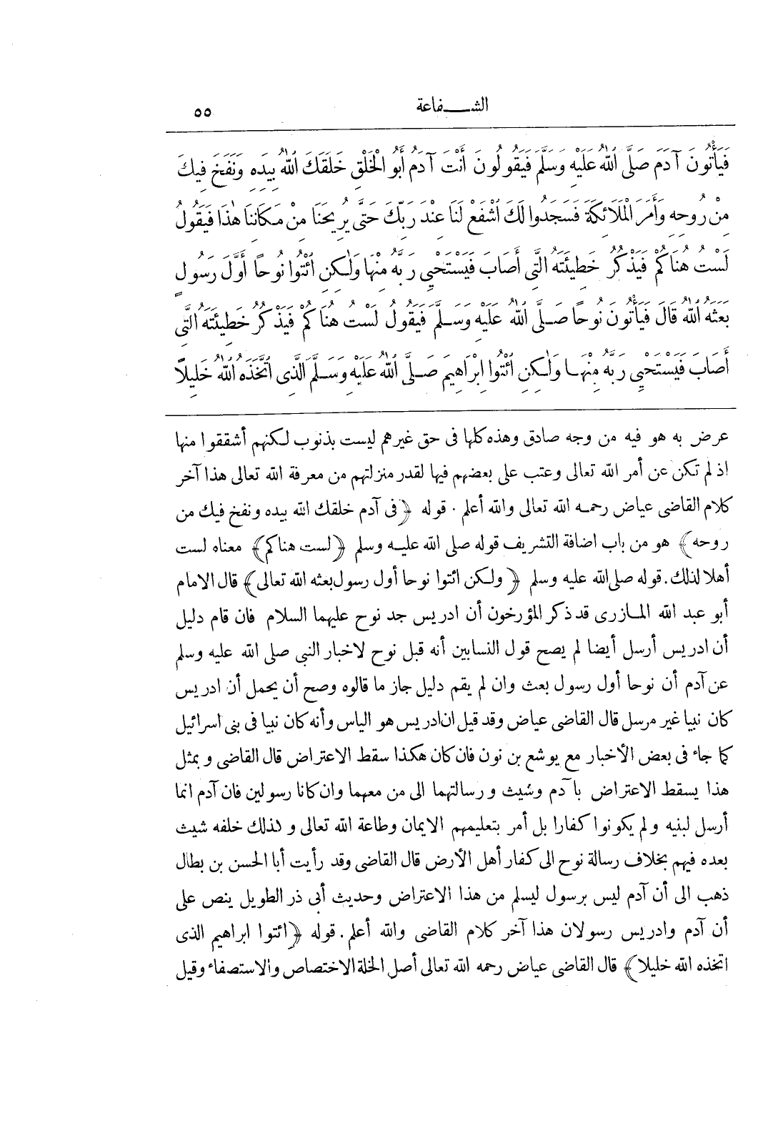 عَرَّضَ بِهِ هُوَ فِيهِ مِنْ وَجْهٍ صَادِقٍ وَهَذِهِ كُلُّهَا فِي حَقِّ غَيْرِهِمْ لَيْسَتْ بِذُنُوبٍ لَكِنَّهُمْ أَشْفَقُوا مِنْهَا إِذْ لَمْ تَكُنْ عَنْ أَمْرِ اللَّهِ تَعَالَى وَعَتَبَ عَلَى بَعْضِهِمْ فِيهَا لِقَدْرِ مَنْزِلَتِهِمْ مِنْ مَعْرِفَةِ اللَّهِ تَعَالَى هَذَا آخِرُ كَلَامِ الْقَاضِي عِيَاضٍ رَحِمَهُ اللَّهُ تَعَالَى وَاللَّهُ أَعْلَمُ قَوْلُهُ (فِي آدَمَ خَلَقَكَ اللَّهُ بِيَدِهِ وَنَفَخَ فِيكَ مِنْ رُوحِهِ) هُوَ مِنْ بَابِ إِضَافَةِ التَّشْرِيفِ قَوْلُهُ صَلَّى اللَّهُ عَلَيْهِ وَسَلَّمَ (لَسْتَ هُنَاكُمْ) مَعْنَاهُ لَسْتَ أَهْلًا لِذَلِكَ قَوْلُهُ صَلَّى اللَّهُ عَلَيْهِ وَسَلَّمَ (وَلَكِنِ ائْتُوا نُوحًا أَوَّلَ رَسُولٍ بَعَثَهُ اللَّهُ تَعَالَى) قَالَ الْإِمَامُ أَبُو عَبْدِ اللَّهِ الْمَازِرِيُّ قَدْ ذَكَرَ الْمُؤَرِّخُونَ أَنَّ إِدْرِيسَ جَدُّ نُوحٍ عَلَيْهِمَا السَّلَامُ فَإِنْ قَامَ دَلِيلٌ أَنَّ إِدْرِيسَ أُرْسِلَ أَيْضًا لَمْ يَصِحَّ قَوْلُ النَّسَّابِينَ أَنَّهُ قَبْلَ نُوحٍ لِإِخْبَارِ النَّبِيِّ صَلَّى اللَّهُ عَلَيْهِ وَسَلَّمَ عَنْ آدَمَ أَنَّ نُوحًا أَوَّلُ رَسُولٍ بُعِثَ وَإِنْ لَمْ يَقُمْ دَلِيلٌ جَازَ مَا قَالُوهُ وَصَحَّ أَنْ يُحْمَلَ أَنَّ إِدْرِيسَ كَانَ نَبِيًّا غَيْرَ مرسل قال القاضي عياض وقد قِيلَ إِنَّ إِدْرِيسَ هُوَ إِلْيَاسُ وَأَنَّهُ كَانَ نَبِيًّا فِي بَنِي إِسْرَائِيلَ كَمَا جَاءَ فِي بَعْضِ الْأَخْبَارِ مَعَ يُوشَعَ بْنِ نُونٍ فَإِنْ كَانَ هَكَذَا سَقَطَ الِاعْتِرَاضُ قَالَ الْقَاضِي وَبِمِثْلِ هَذَا يَسْقُطُ الِاعْتِرَاضُ بِآدَمَ وَشِيثَ وَرِسَالَتِهِمَا إِلَى مَنْ مَعَهُمَا وَإِنْ كَانَا رَسُولَيْنِ فَإِنَّ آدَمَ إِنَّمَا أُرْسِلَ لِبَنِيهِ وَلَمْ يَكُونُوا كُفَّارًا بَلْ أُمِرَ بِتَعْلِيمِهِمُ الْإِيمَانَ وَطَاعَةِ اللَّهِ تَعَالَى وَكَذَلِكَ خَلَفَهُ شِيثٌ بَعْدَهُ فِيهِمْ بِخِلَافِ رِسَالَةِ نُوحٍ إِلَى كُفَّارِ أَهْلِ الْأَرْضِ قَالَ الْقَاضِي وَقَدْ رَأَيْتُ أَبَا الْحَسَنِ بْنَ بَطَّالٍ ذَهَبَ إِلَى أَنَّ آدَمَ لَيْسَ بِرَسُولٍ لِيَسْلَمَ مِنْ هَذَا الِاعْتِرَاضِ وَحَدِيثُ أَبِي ذَرٍّ الطَّوِيلُ يَنُصُّ عَلَى أَنَّ آدَمَ وَإِدْرِيسَ رَسُولَانِ هَذَا آخِرُ كَلَامِ الْقَاضِي وَاللَّهُ أَعْلَمُ قَوْلُهُ (ائْتُوا إِبْرَاهِيمَ الَّذِي اتَّخَذَهُ اللَّهُ خَلِيلًا) قَالَ الْقَاضِي عِيَاضٌ رَحِمَهُ اللَّهُ تَعَالَى أَصْلُ الْخَلَّةِ الِاخْتِصَاصُ وَالِاسْتِصْفَاءُ وَقِيلَ
