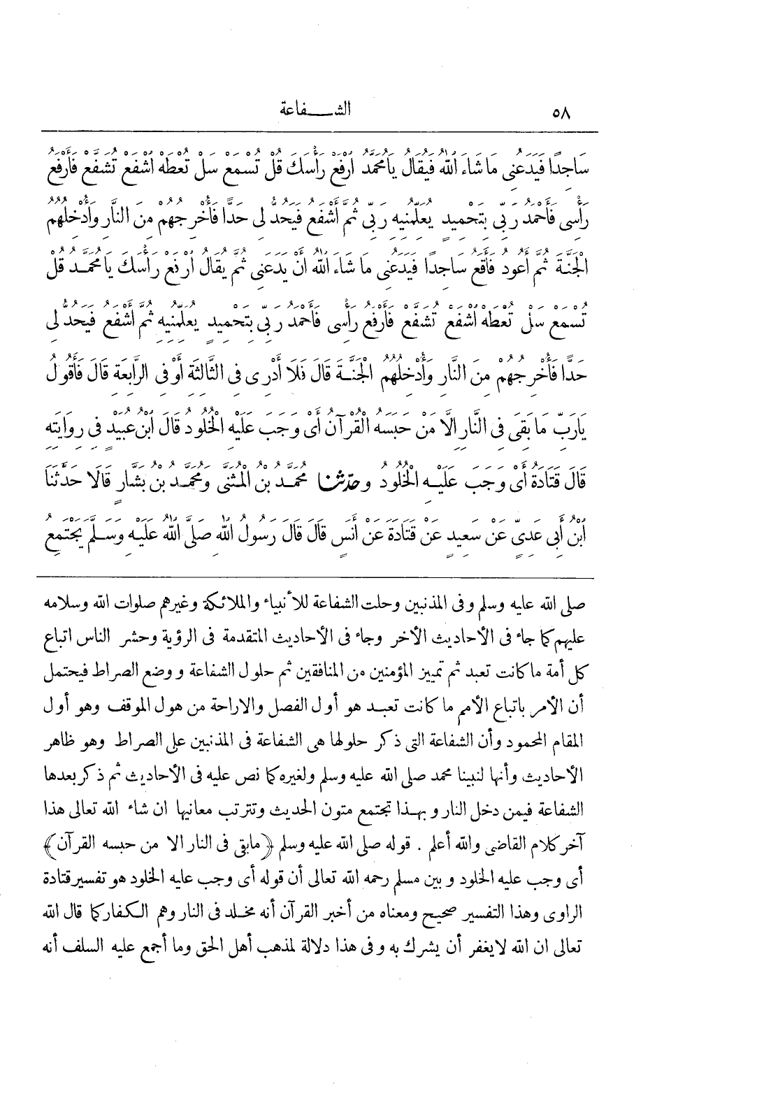 (وَفِي الْمُذْنِبِينَ وَحَلَّتِ الشَّفَاعَةُ لِلْأَنْبِيَاءِ وَالْمَلَائِكَةِ وَغَيْرِهِمْ صَلَوَاتُ اللَّهِ وَسَلَامُهُ عَلَيْهِمْ كَمَا جَاءَ فِي الْأَحَادِيثِ الْأُخَرِ وَجَاءَ فِي الْأَحَادِيثِ الْمُتَقَدِّمَةِ فِي الرُّؤْيَةِ وَحَشْرِ النَّاسِ اتِّبَاعُ كُلِّ أَمَةٍ مَا كَانَتْ تَعْبُدُ ثُمَّ تَمْيِيزُ الْمُؤْمِنِينَ مِنَ الْمُنَافِقِينَ ثُمَّ حُلُولُ الشَّفَاعَةِ وَوَضْعُ الصِّرَاطِ فَيَحْتَمِلُ أَنَّ الْأَمْرَ بِاتِّبَاعِ الْأُمَمِ مَا كَانَتْ تَعْبُدُ هُوَ أَوَّلُ الْفَصْلِ وَالْإِرَاحَةِ مِنْ هَوْلِ الْمَوْقِفِ وَهُوَ أَوَّلُ الْمَقَامِ الْمَحْمُودِ وَأَنَّ الشَّفَاعَةَ الَّتِي ذَكَرَ حُلُولَهَا هِيَ الشَّفَاعَةُ فِي الْمُذْنِبِينَ عَلَى الصِّرَاطِ وَهُوَ ظَاهِرُ الْأَحَادِيثِ وَأَنَّهَا لِنَبِيِّنَا مُحَمَّدٍ صَلَّى اللَّهُ عَلَيْهِ وَسَلَّمَ وَلِغَيْرِهِ كَمَا نَصَّ عَلَيْهِ فِي الْأَحَادِيثِ ثُمَّ ذَكَرَ بَعْدَهَا الشَّفَاعَةَ فِيمَنْ دَخَلَ النَّارَ وَبِهَذَا تَجْتَمِعُ مُتُونُ الْحَدِيثِ وَتَتَرَتَّبَ مَعَانِيهَا إِنْ شَاءَ اللَّهُ تَعَالَى هَذَا آخِرُ كَلَامِ الْقَاضِي وَاللَّهُ أَعْلَمُ قَوْلُهُ صَلَّى اللَّهُ عَلَيْهِ وَسَلَّمَ (مَا بَقِيَ فِي النَّارِ إِلَّا مَنْ حَبَسَهُ الْقُرْآنُ) أَيْ وَجَبَ عَلَيْهِ الْخُلُودُ وَبَيَّنَ مُسْلِمٌ رَحِمَهُ اللَّهُ تَعَالَى أَنَّ قَوْلَهُ أَيْ وَجَبَ عَلَيْهِ الْخُلُودُ هُوَ تَفْسِيرُ قَتَادَةَ الرَّاوِي وَهَذَا التَّفْسِيرُ صَحِيحٌ وَمَعْنَاهُ مَنْ أَخْبَرَ الْقُرْآنُ أَنَّهُ مُخَلَّدٌ فِي النَّارِ وَهُمُ الْكُفَّارُ كَمَا قَالَ اللَّهُ تَعَالَى إِنَّ اللَّهَ لَا يَغْفِرُ أَنْ يُشْرَكَ به وَفِي هَذَا دَلَالَةٌ لِمَذْهَبِ أَهْلِ الْحَقِّ وَمَا أَجْمَعَ عَلَيْهِ السَّلَفُ أَنَّهُ)