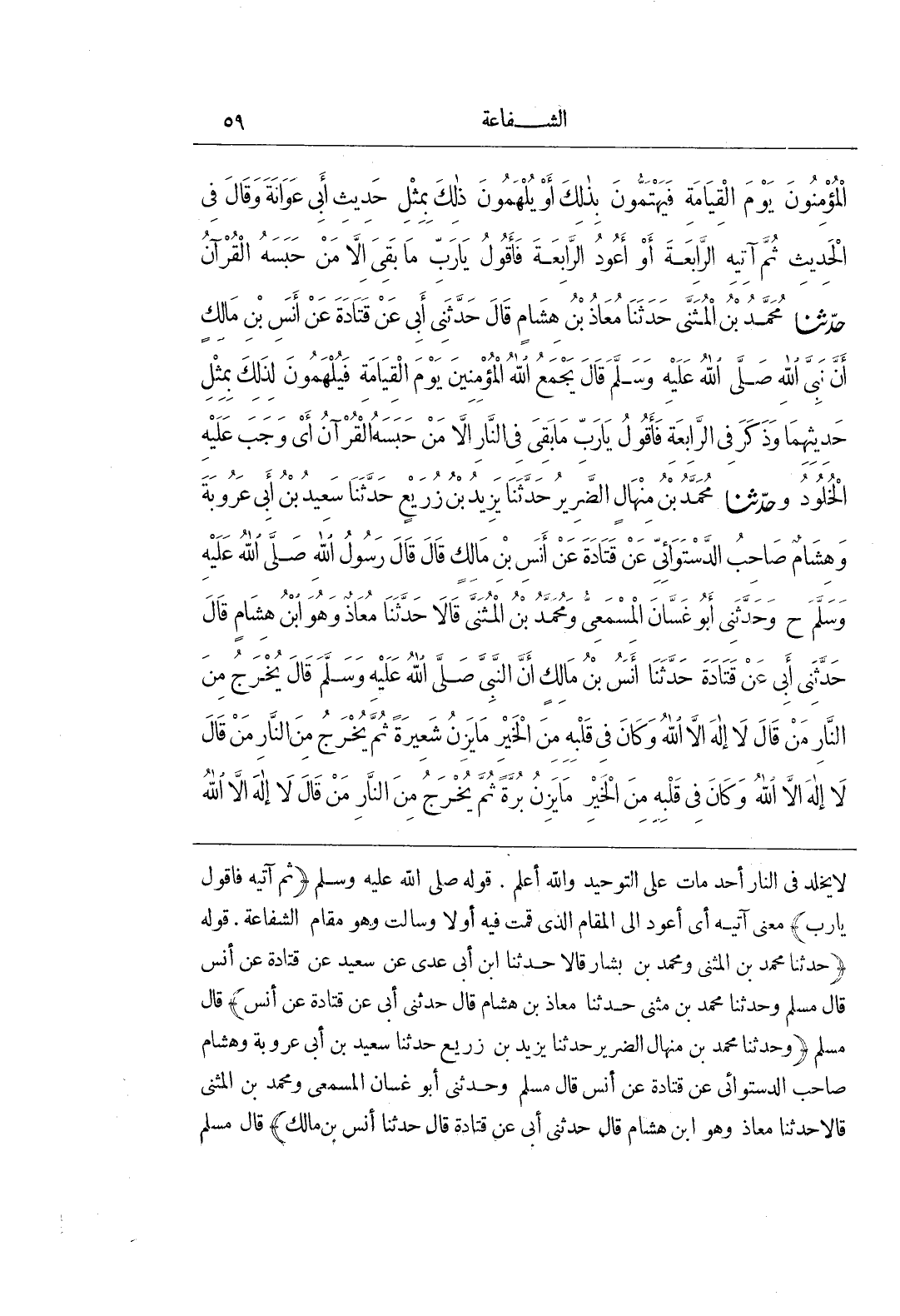 لَا يَخْلُدُ فِي النَّارِ أَحَدٌ مَاتَ عَلَى التَّوْحِيدِ وَاللَّهُ أَعْلَمُ قَوْلُهُ صَلَّى اللَّهُ عَلَيْهِ وَسَلَّمَ (ثم آتيه فأقول يارب) مَعْنَى آتِيهِ أَيْ أَعُودُ إِلَى الْمَقَامِ الَّذِي قُمْتُ فِيهِ أَوَّلًا وَسَأَلْتُ وَهُوَ مَقَامُ الشَّفَاعَةِ قَوْلُهُ (حَدَّثَنَا مُحَمَّدُ بْنُ الْمُثَنَّى وَمُحَمَّدُ بْنُ بشار قالا حدثنا بن أَبِي عَدِيٍّ عَنْ سَعِيدٍ عَنْ قَتَادَةَ عَنْ أَنَسٍ قَالَ مُسْلِمٌ وَحَدَّثَنَا مُحَمَّدُ بْنُ مُثَنَّى حَدَّثَنَا مُعَاذُ بْنُ هِشَامٍ قَالَ حَدَّثَنِي أَبِي عَنْ قَتَادَةَ عَنْ أَنَسٍ) قَالَ مُسْلِمٌ (وَحَدَّثَنَا مُحَمَّدُ بْنُ مِنْهَالٍ الضَّرِيرُ حَدَّثَنَا يَزِيدُ بْنُ زُرَيْعٍ حَدَّثَنَا سَعِيدُ بْنُ أَبِي عَرُوبَةَ وَهِشَامٌ صَاحِبُ الدَّسْتُوَائِيُّ عَنْ قَتَادَةَ عَنْ أَنَسٍ قَالَ مُسْلِمٌ وَحَدَّثَنِي أَبُو غَسَّانَ الْمِسْمَعِيُّ وَمُحَمَّدُ بْنُ المثنى قالا حدثنا معاذ وهو بْنُ هِشَامٍ قَالَ حَدَّثَنِي أَبِي عَنْ قَتَادَةَ قَالَ حَدَّثَنَا أَنَسُ بْنُ مَالِكٍ) قَالَ مُسْلِمٌ