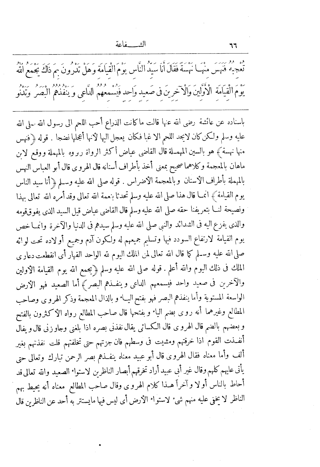 بِإِسْنَادِهِ عَنْ عَائِشَةَ رَضِيَ اللَّهُ عَنْهَا قَالَتْ مَا كَانَتِ الذِّرَاعُ أَحَبَّ اللَّحْمِ إِلَى رَسُولِ اللَّهِ صَلَّى اللَّهُ عَلَيْهِ وَسَلَّمَ وَلَكِنْ كَانَ لَا يَجِدُ اللَّحْمَ إِلَّا غِبًّا فَكَانَ يَعْجَلُ إِلَيْهَا لِأَنَّهَا أَعْجَلُهَا نُضْجًا قَوْلُهُ فَنَهَسَ مِنْهَا نَهْسَةً هُوَ بِالسِّينِ الْمُهْمَلَةِ قَالَ الْقَاضِي عِيَاضٌ أَكْثَرُ الرُّوَاةِ رَوَوْهُ بِالْمُهْمَلَةِ وَوَقَعَ لِابْنِ مَاهَانَ بِالْمُعْجَمَةِ وَكِلَاهُمَا صَحِيحٌ بِمَعْنَى أَخَذَ بِأَطْرَافِ أَسْنَانِهِ قَالَ الْهَرَوِيُّ قَالَ أَبُو الْعَبَّاسِ النَّهْسُ بِالْمُهْمَلَةِ بِأَطْرَافِ الْأَسْنَانِ وَبِالْمُعْجَمَةِ الْأَضْرَاسُ قَوْلُهُ صَلَّى اللَّهُ عَلَيْهِ وَسَلَّمَ أَنَا سَيِّدُ النَّاسِ يَوْمَ الْقِيَامَةِ إِنَّمَا قَالَ هَذَا صَلَّى اللَّهُ عَلَيْهِ وَسَلَّمَ تحدثا بنعمة الله تعالى وقد أمره اللَّهُ تَعَالَى بِهَذَا وَنَصِيحَةً لَنَا بِتَعْرِيفِنَا حَقَّهُ صَلَّى اللَّهُ عَلَيْهِ وَسَلَّمَ قَالَ الْقَاضِي عِيَاضٌ قيل السيد الذي يفوق قومه والذي يفزع إِلَيْهِ فِي الشَّدَائِدِ وَالنَّبِيُّ صَلَّى اللَّهُ عَلَيْهِ وَسَلَّمَ سَيِّدُهُمْ فِي الدُّنْيَا وَالْآخِرَةِ وَإِنَّمَا خُصَّ يوم القيامة لارتفاع السودد فِيهَا وَتَسْلِيمُ جَمِيعِهِمْ لَهُ وَلِكَوْنِ آدَمَ وَجَمِيعِ أَوْلَادِهِ تَحْتَ لِوَائِهِ صَلَّى اللَّهُ عَلَيْهِ وَسَلَّمَ كَمَا قَالَ اللَّهُ تَعَالَى لِمَنِ الْمُلْكُ الْيَوْمَ لِلَّهِ الْوَاحِدِ الْقَهَّارِ أَيِ انْقَطَعَتْ دَعَاوَى الْمُلْكِ فِي ذَلِكَ الْيَوْمِ وَاللَّهُ أَعْلَمُ قَوْلُهُ صَلَّى اللَّهُ عَلَيْهِ وَسَلَّمَ يَجْمَعُ اللَّهُ يَوْمَ الْقِيَامَةِ الْأَوَّلِينَ وَالْآخِرِينَ فِي صَعِيدٍ وَاحِدٍ فَيُسْمِعهُمُ الدَّاعِيَ وَيَنْفَذُهُمُ الْبَصَرَ أَمَّا الصَّعِيدُ فَهُوَ الْأَرْضُ الْوَاسِعَةُ الْمُسْتَوِيَةُ وَأَمَّا يَنْفَذُهُمُ الْبَصَرَ فَهُوَ بِفَتْحِ الْيَاءِ وَبِالذَّالِ الْمُعْجَمَةِ وَذَكَرَ الْهَرَوِيُّ وَصَاحِبُ الْمَطَالِعِ وَغَيْرُهُمَا أَنَّهُ رُوِيَ بِضَمِّ الْيَاءِ وَبِفَتْحِهَا قَالَ صَاحِبُ الْمَطَالِعِ رَوَاهُ الْأَكْثَرُونَ بِالْفَتْحِ وَبَعْضُهُمْ بِالضَّمِّ قَالَ الْهَرَوِيُّ قَالَ الْكِسَائِيُّ يُقَالُ نَفَذَنِي بَصَرَهُ إِذَا بَلَغَنِي وَجَاوَزَنِي قَالَ وَيُقَالُ أَنَفَذْتُ الْقَوْمَ إِذَا خَرَقْتُهُمْ وَمَشَيْتُ فِي وَسَطِهِمْ فَإِنْ جُزْتَهُمْ حَتَّى تَخَلَّفْتَهُمْ قُلْتَ نَفَذْتُهُمْ بِغَيْرِ أَلِفٍ وَأَمَّا مَعْنَاهُ فَقَالَ الْهَرَوِيُّ قَالَ أَبُو عُبَيْدٍ مَعْنَاهُ يَنْفُذُهُمْ بَصَرُ الرَّحْمَنِ تَبَارَكَ وَتَعَالَى حَتَّى يَأْتِيَ عَلَيْهِمْ كُلِّهِمْ وَقَالَ غَيْرُ أَبِي عُبَيْدٍ أَرَادَ تَخْرِقُهُمْ أَبْصَارُ النَّاظِرِينَ لِاسْتِوَاءِ الصَّعِيدِ وَاللَّهُ تَعَالَى قَدْ أَحَاطَ بِالنَّاسِ أَوَّلًا وَآخِرًا هَذَا كَلَامُ الْهَرَوِيِّ وَقَالَ صَاحِبُ الْمَطَالِعِ معناه أنه يحيط بهم الناظر لايخفى عليه منهم شيء لاستواء الارض أي لَيْسَ فِيهَا مَا يَسْتَتِرُ بِهِ أَحَدٌ عَنِ الناظرين قال