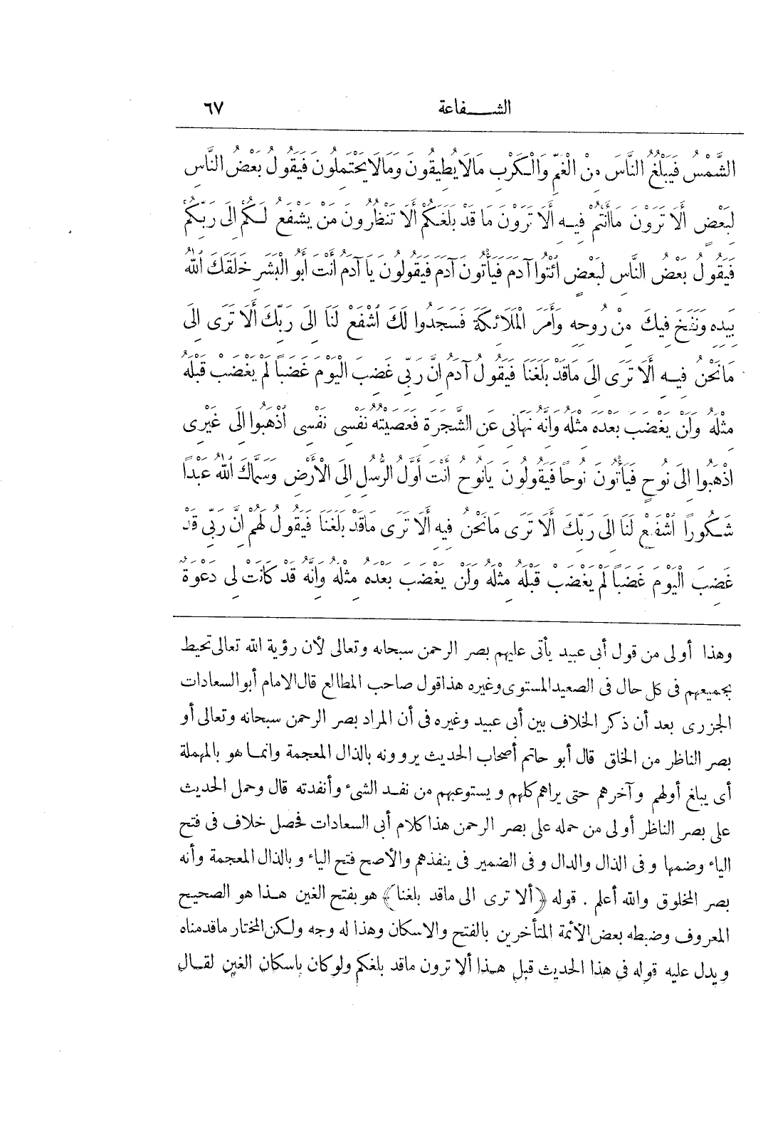وَهَذَا أَوْلَى مِنْ قَوْلِ أَبِي عُبَيْدٍ يَأْتِي عَلَيْهِمْ بَصَرُ الرَّحْمَنِ سُبْحَانَهُ وَتَعَالَى لِأَنَّ رُؤْيَةَ اللَّهِ تَعَالَى تُحِيطُ بِجَمِيعِهِمْ فِي كُلِّ حَالٍ فِي الصَّعِيدِ الْمُسْتَوِي وَغَيْرِهِ هَذَا قَوْلُ صَاحِبِ الْمَطَالِعِ قَالَ الْإِمَامُ أَبُو السَّعَادَاتِ الْجَزَرِيُّ بَعْدَ أَنْ ذَكَرَ الْخِلَافَ بَيْنَ أَبِي عُبَيْدٍ وَغَيْرِهِ فِي أَنَّ الْمُرَادَ بَصَرُ الرَّحْمَنِ سُبْحَانَهُ وَتَعَالَى أَوْ بَصَرُ النَّاظِرِ مِنَ الْخَلْقِ قَالَ أَبُو حَاتِمٍ أَصْحَابُ الْحَدِيثِ يَرْوُونَهُ بِالذَّالِ الْمُعْجَمَةِ وَإِنَّمَا هُوَ بِالْمُهْمَلَةِ أَيْ يَبْلُغُ أَوَّلَهُمْ وَآخِرَهُمْ حَتَّى يَرَاهُمْ كُلَّهُمْ وَيَسْتَوْعِبَهُمْ مِنْ نَفَذَ الشَّيْءُ وَأَنْفَذْتُهُ قَالَ وَحَمْلُ الْحَدِيثِ عَلَى بَصَرِ النَّاظِرِ أَوْلَى مِنْ حَمْلِهِ عَلَى بَصَرِ الرَّحْمَنِ هَذَا كَلَامُ أَبِي السَّعَادَاتِ فَحَصَلَ خِلَافٌ فِي فَتْحِ الْيَاءِ وَضَمِّهَا وَفِي الذَّالِ وَالدَّالِ وَفِي الضَّمِيرِ فِي يُنْفِذُهُمْ وَالْأَصَحُّ فَتْحُ الْيَاءِ وَبِالذَّالِ الْمُعْجَمَةِ وَأَنَّهُ بَصَرُ الْمَخْلُوقِ وَاللَّهُ أَعْلَمُ قَوْلُهُ (أَلَا تَرَى إِلَى مَا قَدْ بَلَغَنَا) هُوَ بِفَتْحِ الْغَيْنِ هَذَا هُوَ الصَّحِيحُ الْمَعْرُوفُ وَضَبَطَهُ بَعْضُ الْأَئِمَّةِ المتأخرين بالفتح وَالْإِسْكَانِ وَهَذَا لَهُ وَجْهٌ وَلَكِنَّ الْمُخْتَارَ مَا قَدَّمْنَاهُ وَيَدُلُّ عَلَيْهِ قَوْلُهُ فِي هَذَا الْحَدِيثِ قَبْلَ هَذَا أَلَا تَرَوْنَ مَا قَدْ بَلَغَكُمْ وَلَوْ كَانَ بِإِسْكَانِ الْغَيْنِ لَقَالَ