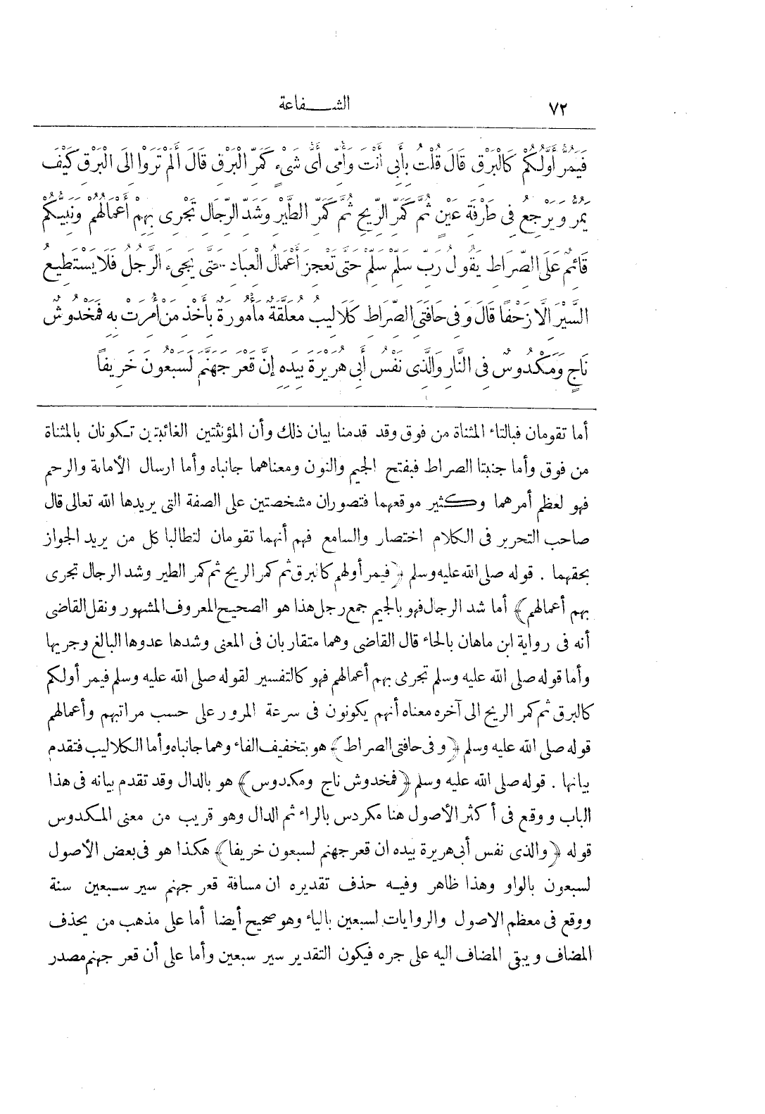 أَمَّا تَقُومَانِ فَبِالتَّاءِ الْمُثَنَّاةِ مِنْ فَوْقُ وَقَدْ قَدَّمْنَا بَيَانُ ذَلِكَ وَأَنَّ الْمُؤَنَّثَتَيْنِ الْغَائِبَتَيْنِ تَكُونَانِ بِالْمُثَنَّاةِ مِنْ فَوْقُ وَأَمَّا جَنَبَتَا الصِّرَاطِ فَبِفَتْحِ الْجِيمِ وَالنُّونِ وَمَعْنَاهُمَا جَانِبَاهُ وَأَمَّا إِرْسَالُ الْأَمَانَةِ وَالرَّحِمِ فَهُوَ لِعِظَمِ أَمْرِهِمَا وَكِبَرِ مَوْقِعِهِمَا فَتُصَوَّرَانِ مُشَخَّصَتَيْنِ عَلَى الصِّفَةِ الَّتِي يُرِيدُهَا اللَّهُ تَعَالَى قَالَ صَاحِبُ التَّحْرِيرِ فِي الْكَلَامِ اخْتِصَارٌ وَالسَّامِعُ فَهِمَ أَنَّهُمَا تَقُومَانِ لِتُطَالِبَا كُلَّ مَنْ يُرِيدُ الْجَوَازَ بِحَقِّهِمَا قَوْلُهُ صَلَّى اللَّهُ عَلَيْهِ وَسَلَّمَ (فيمر أولهم كالبرق ثم كمر الرِّيحَ ثُمَّ كَمَرِّ الطَّيْرِ وَشَدِّ الرِّجَالِ تَجْرِي بِهِمْ أَعْمَالُهُمْ) أَمَّا شَدُّ الرِّجَالِ فَهُوَ بِالْجِيمِ جَمْعُ رَجُلٍ هَذَا هُوَ الصَّحِيحُ الْمَعْرُوفُ الْمَشْهُورُ ونقل القاضي أنه في رواية بن مَاهَانَ بِالْحَاءِ قَالَ الْقَاضِي وَهُمَا مُتَقَارِبَانِ فِي الْمَعْنَى وَشَدُّهَا عَدْوُهَا الْبَالِغُ وَجَرْيُهَا وَأَمَّا قَوْلُهُ صَلَّى اللَّهُ عَلَيْهِ وَسَلَّمَ تَجْرِي بِهِمْ أَعْمَالُهُمْ فَهُوَ كَالتَّفْسِيرِ لِقَوْلِهِ صَلَّى اللَّهُ عَلَيْهِ وَسَلَّمَ فَيَمُرُّ أَوَّلُكُمْ كَالْبَرْقِ ثُمَّ كَمَرِّ الرِّيحِ إِلَى آخِرِهِ مَعْنَاهُ أَنَّهُمْ يَكُونُونَ فِي سُرْعَةِ الْمُرُورِ عَلَى حَسَبِ مَرَاتِبِهِمْ وَأَعْمَالِهِمْ قَوْلُهُ صَلَّى اللَّهُ عَلَيْهِ وَسَلَّمَ (وَفِي حَافَّتَيِ الصِّرَاطِ) هُوَ بِتَخْفِيفِ الْفَاءِ وَهُمَا جَانِبَاهُ وَأَمَّا الْكَلَالِيبُ فَتَقَدَّمَ بَيَانُهَا قَوْلُهُ صَلَّى اللَّهُ عَلَيْهِ وَسَلَّمَ (فَمَخْدُوشٌ نَاجٍ وَمَكْدُوسٌ) هُوَ بِالدَّالِ وَقَدْ تَقَدَّمَ بَيَانُهُ فِي هَذَا الْبَابِ وَوَقَعَ فِي أَكْثَرِ الْأُصُولِ هُنَا مُكَرْدَسٌ بِالرَّاءِ ثُمَّ الدَّالِ وَهُوَ قَرِيبٌ مِنْ مَعْنَى الْمَكْدُوسِ قَوْلُهُ (وَالَّذِي نَفْسُ أَبِي هُرَيْرَةَ بِيَدِهِ إِنَّ قَعْرَ جَهَنَّمَ لَسَبْعُونَ خَرِيفًا) هَكَذَا هُوَ فِي بَعْضِ الْأُصُولِ لَسَبْعُونَ بِالْوَاوِ وَهَذَا ظَاهِرٌ وَفِيهِ حَذْفُ تَقْدِيرِهِ إِنَّ مَسَافَةَ قَعْرِ جَهَنَّمَ سَيْرُ سَبْعِينَ سَنَةً وَوَقَعَ فِي مُعْظَمِ الْأُصُولِ وَالرِّوَايَاتِ لَسَبْعِينَ بِالْيَاءِ وَهُوَ صَحِيحٌ أَيْضًا أَمَّا عَلَى مَذْهَبِ مَنْ يَحْذِفُ الْمُضَافُ وَيُبْقِي الْمُضَافَ إِلَيْهِ عَلَى جَرِّهِ فَيَكُونُ التَّقْدِيرُ سَيْرُ سبعين واما على أن قعر جهنم مصدر