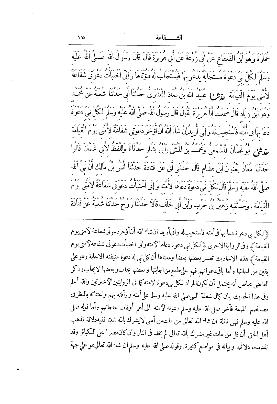 (لِكُلِّ نَبِيٍّ دَعْوَةٌ دَعَا بِهَا فِي أُمَّتِهِ فَاسْتُجِيبَ لَهُ وَإِنِّي أُرِيدَ إِنْ شَاءَ اللَّهُ أَنْ أُؤَخِّرَ دَعْوَتِي شَفَاعَةً لِأُمَّتِي يَوْمَ الْقِيَامَةِ) وَفِي الرِّوَايَةِ الْأُخْرَى (لِكُلِّ نَبِيٍّ دَعْوَةً دَعَاهَا لِأُمَّتِهِ وَإِنِّي اخْتَبَأْتُ دَعْوَتِي شَفَاعَةً لِأُمَّتِي يَوْمَ القيامة) هذه الاحاديث تفسر بعضها بعضا ومعناها أَنَّ كُلَّ نَبِيٍّ لَهُ دَعْوَةً مُتَيَقَّنَةَ الْإِجَابَةِ وَهُوَ عَلَى يَقِينٍ مِنْ إِجَابَتِهَا وَأَمَّا بَاقِي دَعَوَاتِهِمْ فَهُمْ عَلَى طَمَعٍ مِنْ إِجَابَتِهَا وَبَعْضُهَا يُجَابُ وَبَعْضُهَا لَا يُجَابُ وَذَكَرَ الْقَاضِي عِيَاضٌ أَنَّهُ يَحْتَمِلُ أَنْ يَكُونَ الْمُرَادُ لِكُلِّ نَبِيٍّ دَعْوَةٌ لِأُمَّتِهِ كَمَا فِي الرِّوَايَتَيْنِ الْأَخِيرَتَيْنِ وَاللَّهُ أَعْلَمُ وَفِي هَذَا الْحَدِيثِ بَيَانُ كَمَالِ شَفَقَةِ النَّبِيِّ صَلَّى اللَّهُ عَلَيْهِ وَسَلَّمَ عَلَى أُمَّتِهِ وَرَأْفَتِهِ بِهِمْ وَاعْتِنَائِهِ بِالنَّظَرِ فِي مَصَالِحِهِمُ الْمُهِمَّةِ فأخر النبى صَلَّى اللَّهُ عَلَيْهِ وَسَلَّمَ دَعْوَتَهُ لِأُمَّتِهِ إِلَى أَهَمِّ أَوْقَاتِ حَاجَاتِهِمْ وَأَمَّا قَوْلُهُ صَلَّى اللَّهُ عَلَيْهِ وَسَلَّمَ فَهِيَ نَائِلَةٌ إِنْ شَاءَ اللَّهُ تَعَالَى مَنْ مَاتَ مِنْ أُمَّتِي لَا يُشْرِكُ بِاللَّهِ شَيْئًا فَفِيهِ دَلَالَةٌ لِمَذْهَبِ أَهْلِ الْحَقِّ أَنَّ كُلَّ مَنْ مَاتَ غَيْرَ مُشْرِكٍ بِاللَّهِ تَعَالَى لَمْ يُخَلَّدْ فِي النَّارِ وَإِنْ كَانَ مُصِرًّا عَلَى الْكَبَائِرِ وَقَدْ تَقَدَّمَتْ دَلَائِلُهُ وَبَيَانُهُ فِي مَوَاضِعَ كَثِيرَةٍ وَقَوْلُهُ صَلَّى اللَّهُ عَلَيْهِ وَسَلَّمَ إِنْ شَاءَ اللَّهُ تَعَالَى هُوَ عَلَى جهة