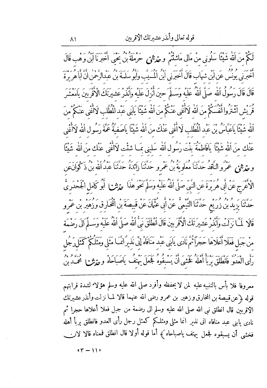 مَعْرُوفًا فَلَا بَأْسَ بِالتَّنْبِيهِ عَلَيْهِ لِمَنْ لَا يَحْفَظُهُ وَأَفْرَدَ صَلَّى اللَّهُ عَلَيْهِ وَسَلَّمَ هَؤُلَاءِ لِشِدَّةِ قَرَابَتِهِمْ قَوْلُهُ (عَنْ قَبِيصَةَ بْنِ الْمُخَارِقِ وَزُهَيْرِ بْنِ عَمْرٍو رَضِيَ اللَّهُ عَنْهُمَا قَالَا لما نزلت وأنذر عشيرتك الأقربين قَالَ انْطَلَقَ نَبِيُّ اللَّهِ صَلَّى اللَّهُ عَلَيْهِ وَسَلَّمَ إِلَى رَضْمَةٍ مِنْ جَبَلٍ فَعَلَا أَعْلَاهَا حجرا ثم نادى يابني عَبْدِ مَنَافَاهُ إِنِّي نَذِيرٌ إِنَّمَا مَثَلِي وَمَثَلُكُمْ كَمَثَلِ رَجُلٍ رَأَى الْعَدُوَّ فَانْطَلَقَ يَرْبَأُ أَهْلَهُ فَخَشِيَ أَنْ يَسْبِقُوهُ فَجَعَلَ يَهْتِفُ يَا صَبَاحَاهُ) أَمَّا قَوْلُهُ أَوَّلًا قَالَ انْطَلَقَ فَمَعْنَاهُ قَالَا لان