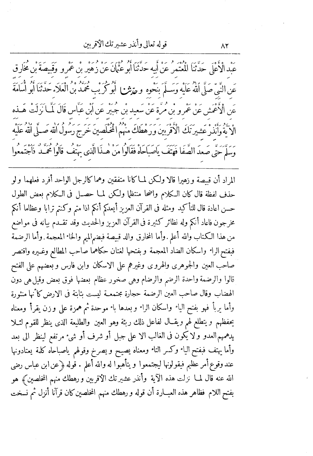 الْمُرَادَ أَنَّ قَبِيصَةَ وَزُهَيْرًا قَالَا وَلَكِنْ لَمَّا كَانَا مُتَّفِقَيْنِ وَهُمَا كَالرَّجُلِ الْوَاحِدِ أَفْرَدَ فِعْلَهُمَا وَلَوْ حَذَفَ لَفْظَةَ قَالَ كَانَ الْكَلَامُ وَاضِحًا مُنْتَظِمًا وَلَكِنْ لَمَّا حَصَلَ فِي الْكَلَامِ بَعْضُ الطُّولِ حَسُنَ إِعَادَةٍ قَالَ لِلتَّأْكِيدِ وَمِثْلُهُ فِي الْقُرْآنِ الْعَزِيزِ أَيَعِدُكُمْ أَنَّكُمْ إِذَا مِتُّمْ وَكُنْتُمْ تُرَابًا وَعِظَامًا أنكم مخرجون فَأَعَادَ أَنَّكُمْ وَلَهُ نَظَائِرُ كَثِيرَةٌ فِي الْقُرْآنِ الْعَزِيزِ وَالْحَدِيثِ وَقَدْ تَقَدَّمَ بَيَانُهُ فِي مَوَاضِعَ مِنْ هَذَا الْكِتَابِ وَاللَّهُ أَعْلَمُ وَأَمَّا الْمُخَارِقُ وَالِدُ قَبِيصَةَ فَبِضَمِّ الْمِيمِ وَالْخَاءِ الْمُعْجَمَةِ وَأَمَّا الرَّضْمَةُ فَبِفَتْحِ الرَّاءِ وَإِسْكَانِ الضَّادِ الْمُعْجَمَةِ وَبِفَتْحِهَا لُغَتَانِ حَكَاهُمَا صَاحِبُ الْمَطَالِعِ وَغَيْرُهُ وَاقْتَصَرَ صَاحِبُ العين والجوهري والهروي وغيرهم على الاسكان وبن فَارِسٍ وَبَعْضُهُمْ عَلَى الْفَتْحِ قَالُوا وَالرَّضْمَةُ وَاحِدَةُ الرَّضْمِ وَالرِّضَامِ وَهِيَ صُخُورٌ عِظَامٌ بَعْضُهَا فَوْقَ بَعْضٍ وَقِيلَ هِيَ دُونَ الْهِضَابِ وَقَالَ صَاحِبُ الْعَيْنِ الرَّضْمَةُ حِجَارَةٌ مُجْتَمِعَةٌ لَيْسَتْ بِثَابِتَةٍ فِي الْأَرْضِ كَأَنَّهَا مَنْثُورَةٌ وَأَمَّا يَرْبَأُ فَهُوَ بِفَتْحِ الْيَاءِ وَإِسْكَانِ الرَّاءِ وَبَعْدُهَا بَاءٌ مُوَحَّدَةٌ ثُمَّ هَمْزَةٌ عَلَى وَزْنِ يَقْرَأُ وَمَعْنَاهُ يَحْفَظُهُمْ وَيَتَطَلَّعُ لهم ويقال لفاعل ذلك ربئة وَهُوَ الْعَيْنُ وَالطَّلِيعَةُ الَّذِي يَنْظُرُ لِلْقَوْمِ لِئَلَّا يَدْهَمَهُمُ الْعَدُوُّ وَلَا يَكُونُ فِي الْغَالِبِ إِلَّا على جبل أو شرف أو شئ مُرْتَفِعٍ لِيَنْظُرَ إِلَى بُعْدٍ وَأَمَّا يَهْتِفُ فَبِفَتْحِ الْيَاءِ وَكَسْرِ التَّاءِ وَمَعْنَاهُ يَصِيحُ وَيَصْرُخُ وَقَوْلُهُمْ ياصباحاه كَلِمَةٌ يَعْتَادُونَهَا عِنْدَ وُقُوعِ أَمْرٍ عَظِيمٍ فَيَقُولُونَهَا لِيَجْتَمِعُوا وَيَتَأَهَّبُوا لَهُ وَاللَّهُ أَعْلَمُ قَوْلُهُ (عَنِ بن عَبَّاسٍ رَضِيَ اللَّهُ عَنْهُ قَالَ لَمَّا نَزَلَتْ هذه الآية وأنذر عشيرتك الأقربين وَرَهْطَكَ مِنْهُمُ الْمُخْلَصِينَ) هُوَ بِفَتْحِ اللَّامِ فَظَاهِرُ هَذِهِ الْعِبَارَةِ أَنَّ قَوْلَهُ وَرَهْطَكَ مِنْهُمُ الْمُخْلَصِينَ كَانَ قُرْآنًا أُنْزِلَ ثُمَّ نُسِخَتْ
