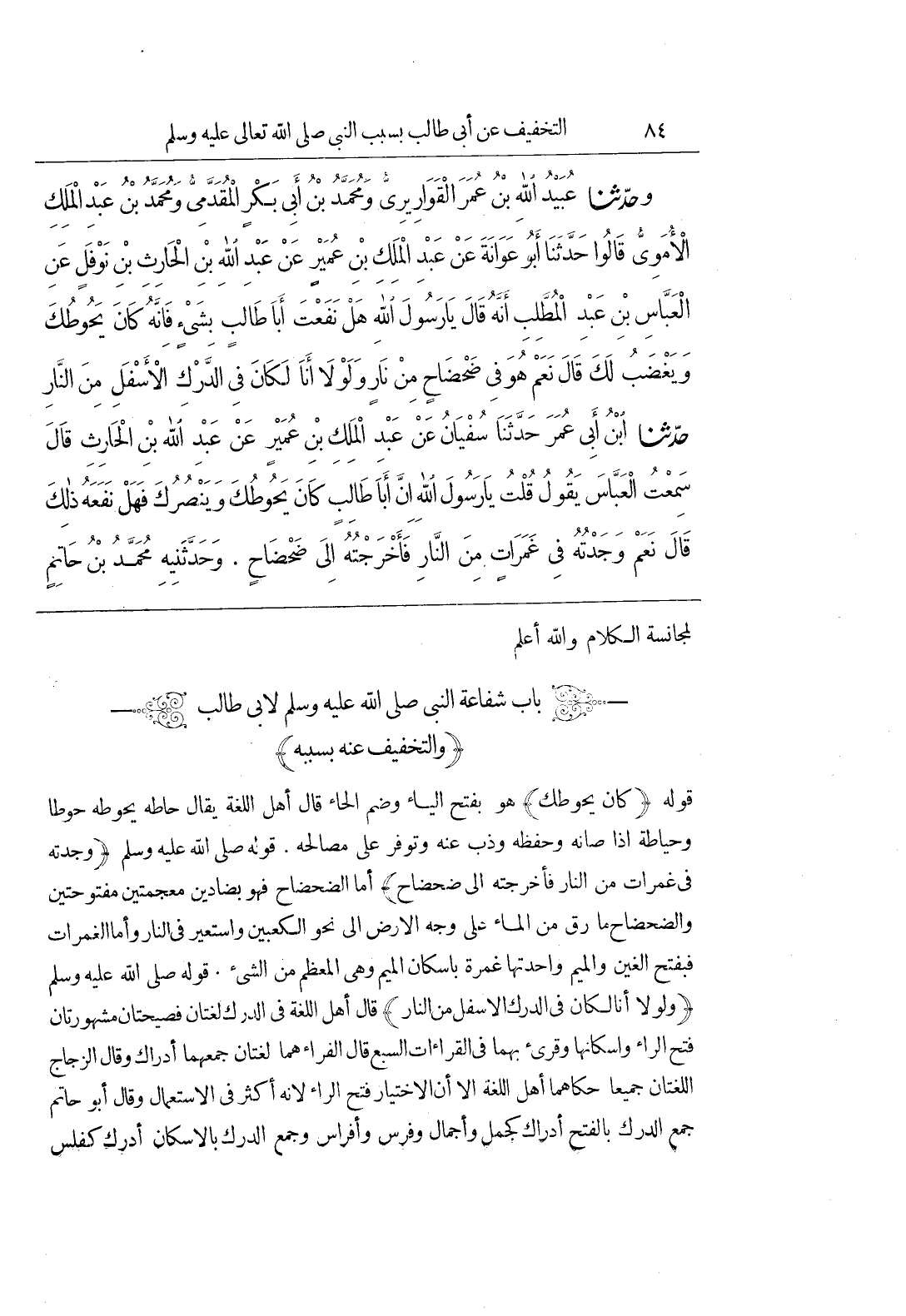 قَوْلُهُ (كَانَ يَحُوطُكَ) هُوَ بِفَتْحِ الْيَاءِ وَضَمِّ الْحَاءِ قَالَ أَهْلُ اللُّغَةِ يُقَالُ حَاطَهُ يَحُوطُهُ حَوْطًا وَحِيَاطَةً إِذَا صَانَهُ وَحَفِظَهُ وَذَبَّ عَنْهُ وتوفر على مصالحه قَوْلُهُ صَلَّى اللَّهُ عَلَيْهِ وَسَلَّمَ (وَجَدْتُهُ فِي غَمَرَاتٍ مِنَ النَّارِ فَأَخْرَجْتُهُ إِلَى ضَحْضَاحٍ) أَمَّا الضَّحْضَاحُ فَهُوَ بِضَادَيْنِ مُعْجَمَتَيْنِ مَفْتُوحَتَيْنِ وَالضَّحْضَاحُ مَا رَقَّ مِنَ الْمَاءِ عَلَى وَجْهِ الْأَرْضِ إِلَى نَحْوِ الْكَعْبَيْنِ وَاسْتُعِيرَ فِي النَّارِ وَأَمَّا الْغَمَرَاتُ فَبِفَتْحِ الْغَيْنِ وَالْمِيمِ وَاحِدَتُهَا غَمْرَةٌ بِإِسْكَانِ الْمِيمِ وهي المعظم من الشئ قوله صَلَّى اللَّهُ عَلَيْهِ وَسَلَّمَ (وَلَوْلَا أَنَا لَكَانَ فِي الدَّرْكِ الْأَسْفَلِ مِنَ النَّارِ) قَالَ أَهْلُ اللُّغَةِ فِي الدَّرْكِ لُغَتَانِ فَصَيْحَتَانِ مَشْهُورَتَانِ فَتْحُ الرَّاءِ وَإِسْكَانُهَا وَقُرِئَ بِهِمَا فِي الْقِرَاءَاتِ السَّبْعِ قَالَ الْفَرَّاءُ هُمَا لُغَتَانِ جَمْعُهُمَا أَدْرَاكٌ وَقَالَ الزجاج اللغتان جميعا حَكَاهُمَا أَهْلُ اللُّغَةِ إِلَّا أَنَّ الِاخْتِيَارَ فَتْحُ الرَّاءِ لِأَنَّهُ أَكْثَرُ فِي الِاسْتِعْمَالِ وَقَالَ أَبُو حَاتِمٍ جَمْعُ الدَّرَكِ بِالْفَتْحِ أَدْرَاكٌ كَجَمَلٍ وَأَجْمَالٍ وَفَرَسٍ وَأَفْرَاسٍ وَجَمْعُ الدَّرْكِ بِالْإِسْكَانِ أَدْرُكٌ كَفَلْسٍ