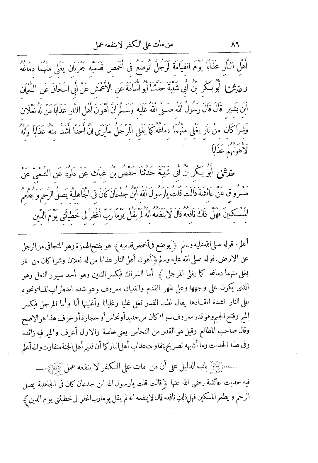 فِيهِ حَدِيثُ عَائِشَةَ رَضِيَ اللَّهُ عَنْهَا (قَالَتْ قلت يارسول الله بن جُدْعَانَ كَانَ فِي الْجَاهِلِيَّةِ يَصِلُ الرَّحِمَ وَيُطْعِمُ الْمِسْكِينَ فَهَلْ ذَلِكَ نَافِعُهُ قَالَ لَا يَنْفَعُهُ إِنَّهُ لَمْ يَقُلْ يَوْمًا رَبِّ اغْفِرْ لِي خَطِيئَتِي يَوْمَ الدِّينِ
