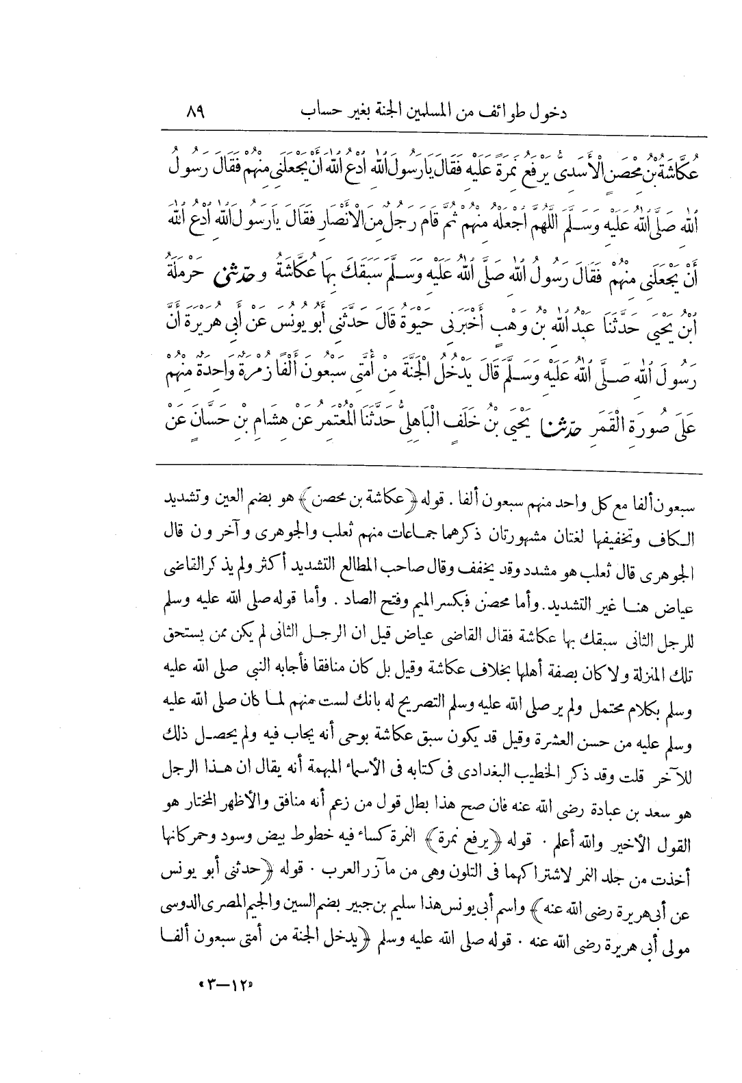 سَبْعُونَ أَلْفًا مَعَ كُلِّ وَاحِدٍ مِنْهُمْ سَبْعُونَ ألفا قَوْلُهُ (عُكَّاشَةُ بْنُ مِحْصَنٍ) هُوَ بِضَمِّ الْعَيْنِ وَتَشْدِيدِ الْكَافِ وَتَخْفِيفِهَا لُغَتَانِ مَشْهُورَتَانِ ذَكَرَهُمَا جَمَاعَاتٌ مِنْهُمْ ثَعْلَبٌ وَالْجَوْهَرِيُّ وَآخَرُونَ قَالَ الْجَوْهَرِيُّ قَالَ ثَعْلَبٌ هُوَ مُشَدَّدٌ وَقَدْ يُخَفَّفُ وَقَالَ صَاحِبُ الْمَطَالِعِ التَّشْدِيدُ أَكْثَرُ وَلَمْ يَذْكُرِ الْقَاضِي عِيَاضٌ هُنَا غَيْرَ التَّشْدِيدِ وَأَمَّا مِحْصَنُ فَبِكَسْرِ الْمِيمِ وَفَتْحِ الصَّادِ وَأَمَّا قَوْلُهُ صَلَّى اللَّهُ عَلَيْهِ وَسَلَّمَ لِلرَّجُلِ الثَّانِي سَبَقَكَ بِهَا عُكَّاشَةُ فَقَالَ الْقَاضِي عِيَاضٌ قِيلَ إِنَّ الرَّجُلَ الثَّانِي لَمْ يَكُنْ مِمَّنْ يَسْتَحِقُّ تِلْكَ الْمَنْزِلَةَ وَلَا كَانَ بِصِفَةِ أَهْلِهَا بِخِلَافِ عُكَّاشَةَ وَقِيلَ بَلْ كَانَ مُنَافِقًا فَأَجَابَهُ النَّبِيُّ صَلَّى اللَّهُ عَلَيْهِ وَسَلَّمَ بِكَلَامٍ مُحْتَمَلٌ وَلَمْ يَرَ صَلَّى اللَّهُ عَلَيْهِ وَسَلَّمَ التَّصْرِيحَ لَهُ بِأَنَّكَ لَسْتَ مِنْهُمْ لِمَا كَانَ صَلَّى اللَّهُ عَلَيْهِ وَسَلَّمَ عَلَيْهِ مِنْ حُسْنِ الْعِشْرَةِ وَقِيلَ قَدْ يَكُونُ سَبْقُ عُكَّاشَةَ بِوَحْيٍ أَنَّهُ يُجَابُ فِيهِ وَلَمْ يَحْصُلْ ذَلِكَ لِلْآخَرِ قُلْتُ وَقَدْ ذَكَرَ الْخَطِيبُ الْبَغْدَادِيُّ فِي كِتَابِهِ فِي الْأَسْمَاءِ الْمُبْهَمَةِ أَنَّهُ يُقَالُ إِنَّ هَذَا الرَّجُلَ هُوَ سَعْدُ بْنُ عُبَادَةَ رَضِيَ اللَّهُ عَنْهُ فَإِنْ صَحَّ هَذَا بَطَلَ قَوْلُ مَنْ زَعَمَ أَنَّهُ مُنَافِقٌ وَالْأَظْهَرُ الْمُخْتَارُ هُوَ الْقَوْلُ الْأَخِيرُ وَاللَّهُ أَعْلَمُ قَوْلُهُ (يَرْفَعُ نَمِرَةً) النَّمِرَةُ كِسَاءٌ فِيهِ خُطُوطٌ بِيضٌ وَسُودٌ وَحُمْرٌ كَأَنَّهَا أُخِذَتْ مِنْ جِلْدِ النَّمِرِ لِاشْتِرَاكِهِمَا فِي التَّلَوُّنِ وَهِيَ مِنْ مَآزِرِ الْعَرَبِ قَوْلُهُ (حَدَّثَنِي أَبُو يُونُسَ عَنْ أَبِي هُرَيْرَةَ رَضِيَ اللَّهُ عَنْهُ) وَاسْمُ أَبِي يُونُسَ هَذَا سُلَيْمُ بْنُ جُبَيْرٍ بِضَمِّ السِّينِ وَالْجِيمِ الْمِصْرِيُّ الدَّوْسِيُّ مَوْلَى ابي هريرة رَضِيَ اللَّهُ عَنْهُ قَوْلُهُ صَلَّى اللَّهُ عَلَيْهِ وسلم (يدخل الْجَنَّةَ مِنْ أُمَّتِي سَبْعُونَ أَلْفًا