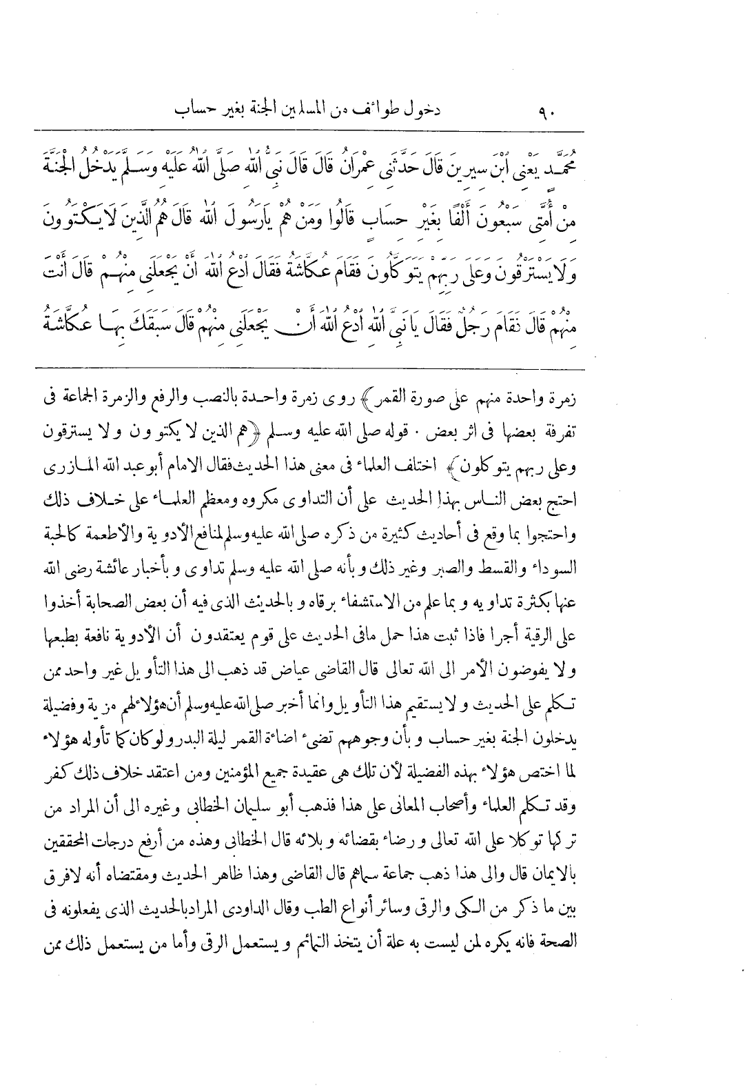 زُمْرَةً وَاحِدَةً مِنْهُمْ عَلَى صُورَةِ الْقَمَرِ) رُوِيَ زُمْرَةً وَاحِدَةً بِالنَّصْبِ وَالرَّفْعِ وَالزُّمْرَةُ الْجَمَاعَةُ فِي تَفْرِقَةِ بَعْضِهَا فِي إِثْرِ بَعْضٍ قَوْلُهُ صَلَّى اللَّهُ عَلَيْهِ وَسَلَّمَ (هُمُ الَّذِينَ لَا يَكْتَوُونَ وَلَا يَسْتَرْقُونَ وَعَلَى رَبِّهِمْ يَتَوَكَّلُونَ) اخْتَلَفَ الْعُلَمَاءُ فِي مَعْنَى هَذَا الْحَدِيثِ فَقَالَ الْإِمَامُ أَبُو عَبْدِ اللَّهِ الْمَازِرِيُّ احْتَجَّ بَعْضُ النَّاسِ بِهَذَا الْحَدِيثِ عَلَى أَنَّ التَّدَاوِيَ مَكْرُوهٌ وَمُعْظَمُ الْعُلَمَاءِ عَلَى خِلَافِ ذَلِكَ وَاحْتَجُّوا بِمَا وَقَعَ فِي أَحَادِيثَ كَثِيرَةٍ مِنْ ذِكْرِهِ صَلَّى اللَّهُ عَلَيْهِ وَسَلَّمَ لِمَنَافِعِ الْأَدْوِيَةِ وَالْأَطْعِمَةِ كَالْحَبَّةِ السَّوْدَاءِ وَالْقُسْطِ وَالصَّبْرِ وَغَيْرِ ذَلِكَ وَبِأَنَّهُ صَلَّى اللَّهُ عَلَيْهِ وَسَلَّمَ تَدَاوَى وَبِإِخْبَارِ عَائِشَةَ رَضِيَ اللَّهُ عَنْهَا بِكَثْرَةِ تدَاوِيهِ وَبِمَا عُلِمَ مِنَ الِاسْتِشْفَاءِ بِرُقَاهُ وَبِالْحَدِيثِ الَّذِي فِيهِ أَنَّ بَعْضَ الصَّحَابَةِ أَخَذُوا عَلَى الرُّقْيَةِ أَجْرًا فَإِذَا ثَبَتَ هَذَا حُمِلَ مَا فِي الْحَدِيثِ عَلَى قَوْمٍ يَعْتَقِدُونَ أَنَّ الْأَدْوِيَةَ نَافِعَةٌ بِطَبْعِهَا وَلَا يُفَوِّضُونَ الْأَمْرَ إِلَى اللَّهِ تَعَالَى قَالَ الْقَاضِي عِيَاضٌ قَدْ ذَهَبَ إِلَى هَذَا التَّأْوِيلِ غَيْرُ وَاحِدٍ مِمَّنْ تَكَلَّمَ عَلَى الْحَدِيثِ وَلَا يَسْتَقِيمُ هَذَا التَّأْوِيلُ وَإِنَّمَا أَخْبَرَ صَلَّى اللَّهُ عَلَيْهِ وَسَلَّمَ أَنَّ هَؤُلَاءِ لَهُمْ مَزِيَّةٌ وَفَضِيلَةٌ يَدْخُلُونَ الْجَنَّةَ بِغَيْرِ حِسَابٍ وبان وجوههم تضئ إِضَاءَةَ الْقَمَرِ لَيْلَةَ الْبَدْرِ وَلَوْ كَانَ كَمَا تَأَوَّلَهُ هَؤُلَاءِ لَمَا اخْتُصَّ هَؤُلَاءِ بِهَذِهِ الْفَضِيلَةِ لِأَنَّ تِلْكَ هِيَ عَقِيدَةُ جَمِيعِ الْمُؤْمِنِينَ وَمَنِ اعْتَقَدَ خِلَافَ ذَلِكَ كَفَرَ وَقَدْ تَكَلَّمَ الْعُلَمَاءُ وَأَصْحَابُ الْمَعَانِي عَلَى هَذَا فَذَهَبَ أَبُو سُلَيْمَانَ الْخَطَّابِيُّ وَغَيْرُهُ إِلَى أَنَّ الْمُرَادَ مَنْ تَرَكَهَا تَوَكُّلًا عَلَى اللَّهِ تَعَالَى وَرِضَاءً بِقَضَائِهِ وَبَلَائِهِ قَالَ الْخَطَّابِيُّ وَهَذِهِ مِنْ أَرْفَعِ دَرَجَاتِ الْمُحَقِّقِينَ بِالْإِيمَانِ قَالَ وَإِلَى هَذَا ذَهَبَ جَمَاعَةٌ سَمَّاهُمْ قَالَ الْقَاضِي وَهَذَا ظَاهِرُ الْحَدِيثِ وَمُقْتَضَاهُ أَنَّهُ لَا فَرْقَ بَيْنَ مَا ذُكِرَ مِنَ الْكَيِّ وَالرُّقَى وَسَائِرُ أَنْوَاعِ الطِّبِّ وَقَالَ الدَّاوُدِيُّ الْمُرَادُ بِالْحَدِيثِ الَّذِي يَفْعَلُونَهُ فِي الصِّحَّةِ فَإِنَّهُ يُكْرَهُ لِمَنْ لَيْسَتْ بِهِ عِلَّةٌ أَنْ يَتَّخِذَ التَّمَائِمَ وَيَسْتَعْمِلَ الرُّقَى وَأَمَّا مَنْ يَسْتَعْمِلُ ذَلِكَ مِمَّنْ