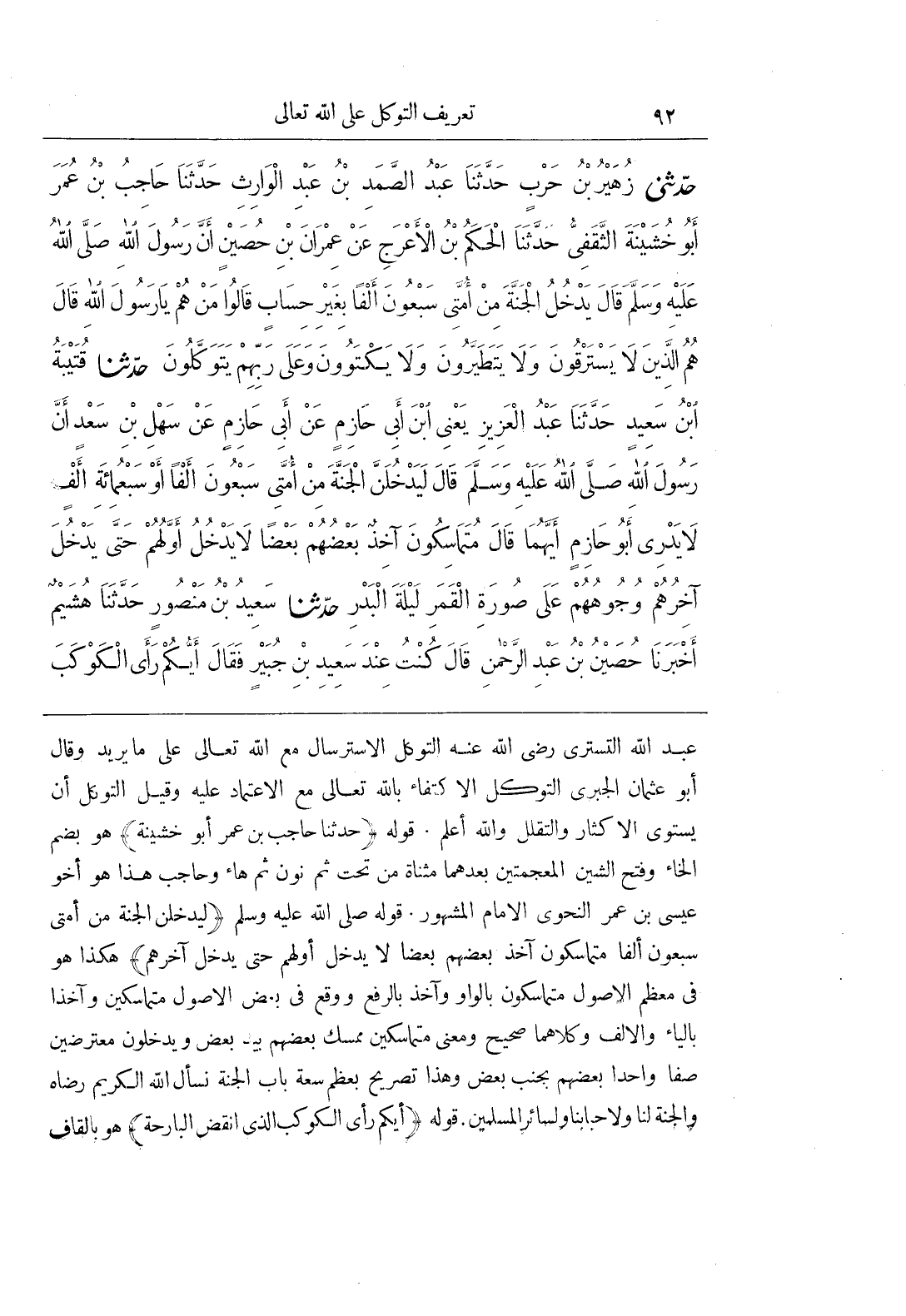 عَبْدِ اللَّهِ التُّسْتَرِيُّ رَضِيَ اللَّهُ عَنْهُ التَّوَكُّلُ الِاسْتِرْسَالُ مَعَ اللَّهِ تَعَالَى عَلَى مَا يُرِيدُ وَقَالَ أَبُو عُثْمَانَ الْجَبَّرِيُّ التَّوَكُّلُ الِاكْتِفَاءُ بِاللَّهِ تَعَالَى مَعَ الِاعْتِمَادِ عَلَيْهِ وَقِيلَ التَّوَكُّلُ أَنْ يَسْتَوِيَ الْإِكْثَارُ وَالتَّقَلُّلُ وَاللَّهُ أَعْلَمُ قَوْلُهُ (حَدَّثَنَا حَاجِبُ بْنُ عُمَرَ أَبُو خُشَيْنَةَ) هُوَ بِضَمِّ الْخَاءِ وَفَتْحِ الشِّينِ الْمُعْجَمَتَيْنِ بَعْدَهُمَا مُثَنَّاةٌ مِنْ تَحْتُ ثُمَّ نُونٍ ثُمَّ هَاءٍ وَحَاجِبٌ هَذَا هُوَ أَخُو عِيسَى بْنُ عُمَرَ النَّحْوِيُّ الْإِمَامُ الْمَشْهُورُ قَوْلُهُ صَلَّى اللَّهُ عَلَيْهِ وَسَلَّمَ (لَيَدْخُلَنَّ الْجَنَّةَ مِنْ أُمَّتِي سَبْعُونَ أَلْفًا مُتَمَاسِكُونَ آخِذٌ بَعْضُهُمْ بَعْضًا لَا يَدْخُلُ أَوَّلُهُمْ حَتَّى يَدْخُلَ آخِرُهُمْ) هَكَذَا هُوَ فِي مُعْظَمِ الْأُصُولِ مُتَمَاسِكُونَ بالواو وآخذ بالرفع ووقع في بعض الاصول متماسكين وآخذا بِالْيَاءِ وَالْأَلِفِ وَكِلَاهُمَا صَحِيحٌ وَمَعْنَى مُتَمَاسِكِينَ مُمْسِكٌ بَعْضُهُمْ بِيَدِ بَعْضٍ وَيَدْخُلُونَ مُعْتَرِضِينَ صَفًّا وَاحِدًا بَعْضُهُمْ بِجَنْبِ بَعْضٍ وَهَذَا تَصْرِيحٌ بِعِظَمِ سَعَةِ بَابِ الْجَنَّةِ نَسْأَلُ اللَّهَ الْكَرِيمَ رِضَاهُ وَالْجَنَّةَ لَنَا وَلِأَحْبَابِنَا وَلِسَائِرِ الْمُسْلِمِينَ قَوْلُهُ (أَيُّكُمْ رَأَى الْكَوْكَبَ الَّذِي انْقَضَّ الْبَارِحَةَ) هُوَ بِالْقَافِ