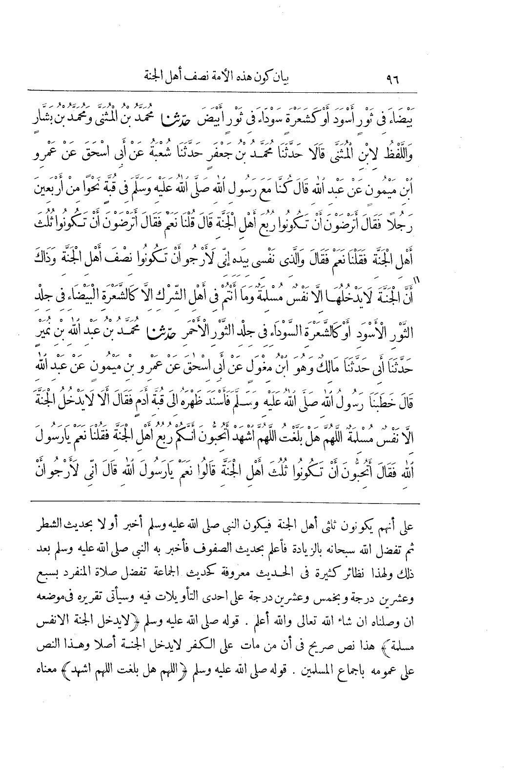 عَلَى أَنَّهُمْ يَكُونُونَ ثُلُثَيْ أَهْلِ الْجَنَّةِ فَيَكُونُ النَّبِيُّ صَلَّى اللَّهُ عَلَيْهِ وَسَلَّمَ أَخْبَرَ أَوَّلًا بِحَدِيثِ الشَّطْرِ ثُمَّ تَفَضَّلَ اللَّهُ سُبْحَانَهُ بِالزِّيَادَةِ فأعلم بحديث الصفوف فأخبر النَّبِيُّ صَلَّى اللَّهُ عَلَيْهِ وَسَلَّمَ بَعْدَ ذَلِكَ وَلِهَذَا نَظَائِرُ كَثِيرَةٌ فِي الْحَدِيثِ مَعْرُوفَةٌ كَحَدِيثِ الْجَمَاعَةِ تَفْضُلُ صَلَاةَ الْمُنْفَرِدِ بِسَبْعٍ وَعِشْرِينَ دَرَجَةً وَبِخَمْسٍ وَعِشْرِينَ دَرَجَةً عَلَى إِحْدَى التَّأْوِيلَاتِ فِيهِ وَسَيَأْتِي تَقْرِيرُهُ فِي مَوْضِعِهِ إِنْ وَصَلْنَاهُ إِنْ شَاءَ اللَّهُ تَعَالَى وَاللَّهُ أَعْلَمُ قَوْلُهُ صَلَّى اللَّهُ عَلَيْهِ وَسَلَّمَ (لَا يَدْخُلُ الْجَنَّةَ إِلَّا نَفْسٌ مُسْلِمَةٌ) هَذَا نَصٌّ صَرِيحٌ فِي أَنَّ مَنْ مَاتَ عَلَى الْكُفْرِ لَا يَدْخُلِ الْجَنَّةَ أَصْلًا وَهَذَا النَّصُّ عَلَى عُمُومِهِ بِإِجْمَاعِ الْمُسْلِمِينَ قوله صَلَّى اللَّهُ عَلَيْهِ وَسَلَّمَ (اللَّهُمَّ هَلْ بَلَّغْتُ اللَّهُمَّ اشْهَدْ) مَعْنَاهُ