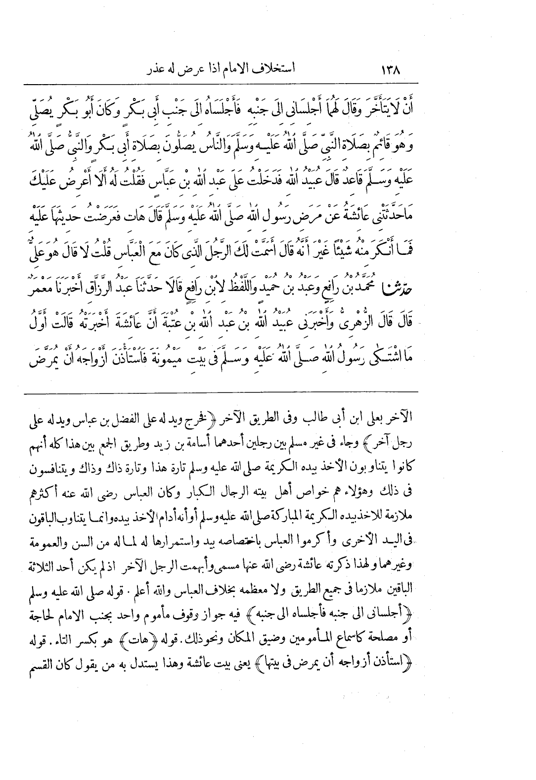 الْآخَرَ بِعَلِيِّ بْنِ أَبِي طَالِبٍ وَفِي الطَّرِيقِ الْآخَرِ (فَخَرَجَ وَيَدٌ لَهُ عَلَى الْفَضْلِ بْنِ عباس ويدله عَلَى رَجُلٍ آخَرَ) وَجَاءَ فِي غَيْرِ مُسْلِمٍ بَيْنَ رَجُلَيْنِ أَحَدُهُمَا أُسَامَةُ بْنُ زَيْدٍ وَطَرِيقُ الْجَمْعِ بَيْنَ هَذَا كُلِّهِ أَنَّهُمْ كَانُوا يَتَنَاوَبُونَ الْأَخْذَ بِيَدِهِ الْكَرِيمَةِ صَلَّى اللَّهُ عَلَيْهِ وَسَلَّمَ تارة هذا وتارة ذاك وذاك وَيَتَنَافَسُونَ فِي ذَلِكَ وَهَؤُلَاءِ هُمْ خَوَاصُّ أَهْلِ بَيْتِهِ الرِّجَالُ الْكِبَارُ وَكَانَ الْعَبَّاسُ رَضِيَ اللَّهُ عَنْهُ أَكْثَرَهُمْ مُلَازَمَةً لِلْأَخْذِ بِيَدِهِ الْكَرِيمَةِ الْمُبَارَكَةِ صَلَّى اللَّهُ عَلَيْهِ وَسَلَّمَ أَوْ أنَّهُ أَدَامَ الْأَخْذَ بِيَدِهِ وَإِنَّمَا يَتَنَاوَبُ الْبَاقُونَ فِي الْيَدِ الْأُخْرَى وَأَكْرَمُوا الْعَبَّاسَ بِاخْتِصَاصِهِ بِيَدٍ وَاسْتِمْرَارِهَا لَهُ لِمَا لَهُ مِنَ السِّنِّ وَالْعُمُومَةِ وَغَيْرِهِمَا وَلِهَذَا ذَكَرَتْهُ عَائِشَةُ رَضِيَ اللَّهُ عَنْهَا مُسَمًّى وَأَبْهَمَتِ الرَّجُلَ الْآخَرَ إِذْ لَمْ يَكُنْ أَحَدَ الثَّلَاثَةِ الْبَاقِينَ مُلَازِمًا فِي جَمِيعِ الطَّرِيقِ وَلَا مُعْظَمِهِ بِخِلَافِ الْعَبَّاسِ وَاللَّهُ أَعْلَمُ قَوْلُهُ صَلَّى اللَّهُ عَلَيْهِ وَسَلَّمَ (أَجْلَسَانِي إِلَى جَنْبِهِ فَأَجْلَسَاهُ إِلَى جَنْبِهِ) فِيهِ جَوَازُ وُقُوفِ مَأْمُومٍ وَاحِدٍ بِجَنْبِ الإمام لحاجة أو مصلحة كإسماع المأموضنين وَضِيقِ الْمَكَانِ وَنَحْوِ ذَلِكَ قَوْلُهُ (هَاتِ) هُوَ بِكَسْرِ التَّاءِ قَوْلُهُ (اسْتَأْذَنَ أَزْوَاجَهُ أَنْ يُمَرَّضَ فِي بَيْتِهَا) يَعْنِي بَيْتَ عَائِشَةَ وَهَذَا يَسْتَدِلُّ بِهِ مَنْ يَقُولُ كَانَ الْقَسْمُ
